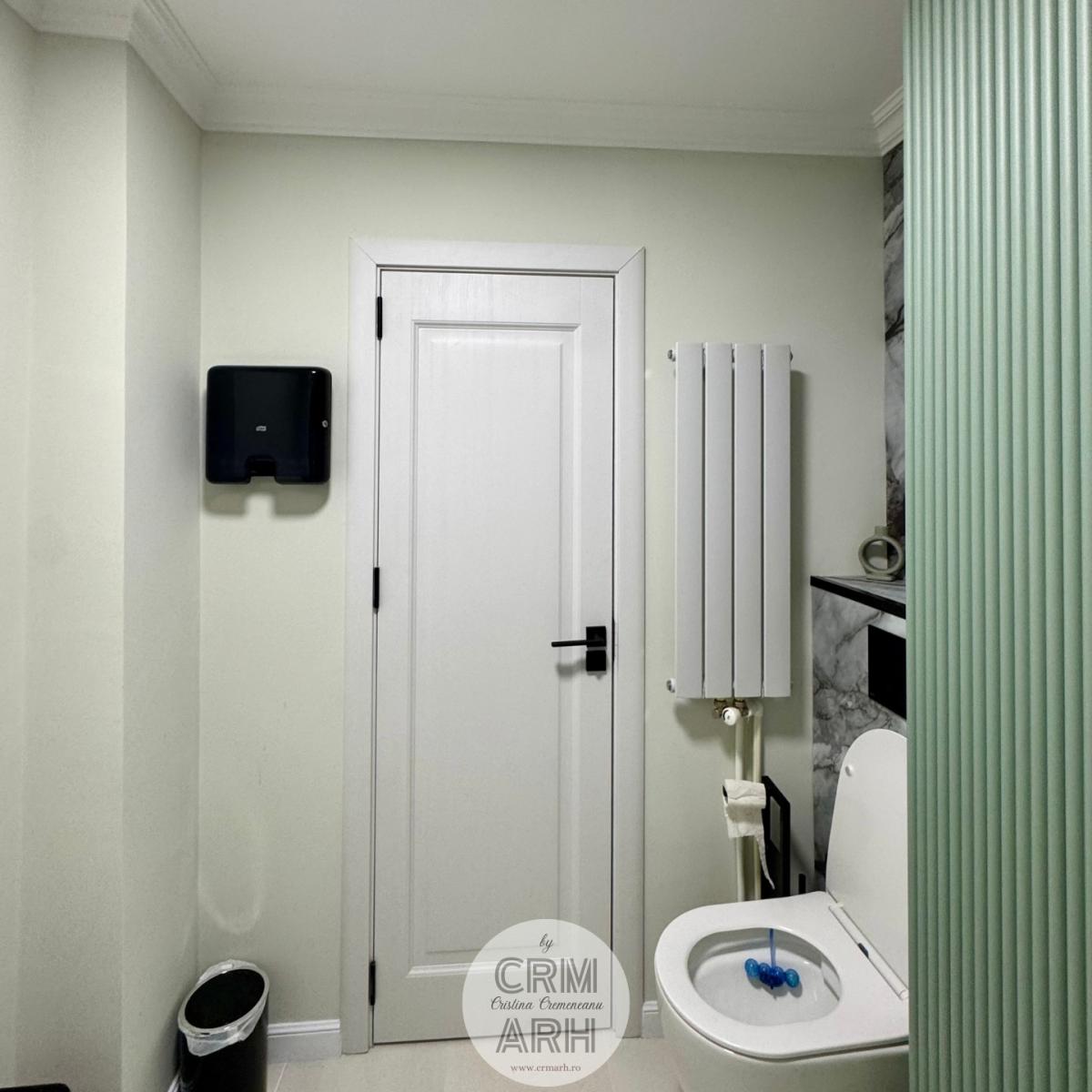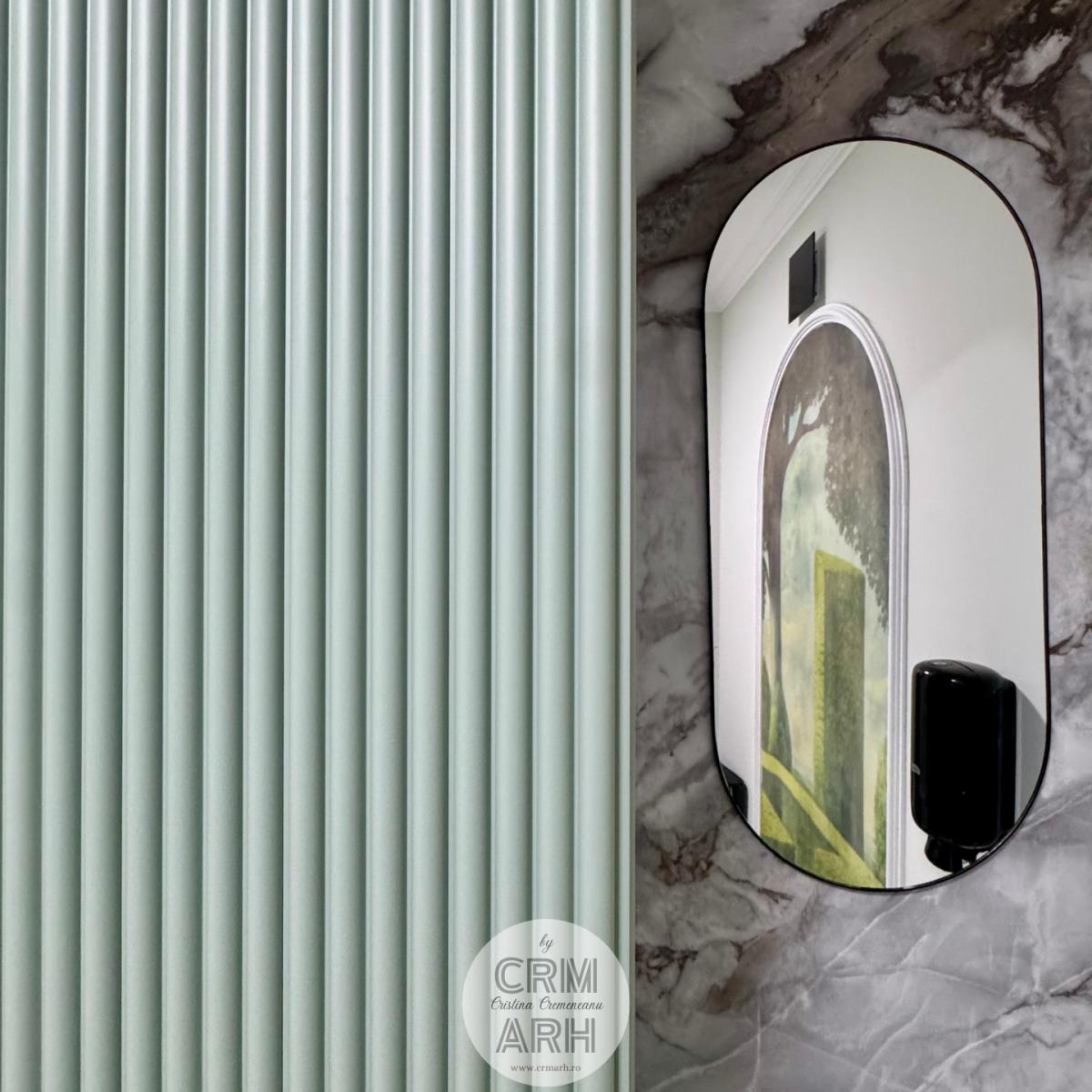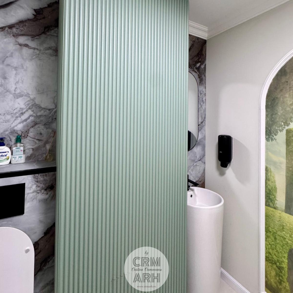 Baie in stil neoclasic pentru cabinet ORL, profile decorative, placi SPC pentru pereti, riflaje mdf si tapet personalizat de lux pentru un plus de efect. Un proiect de actualitate, atemporal.