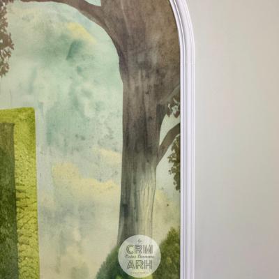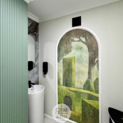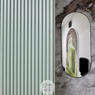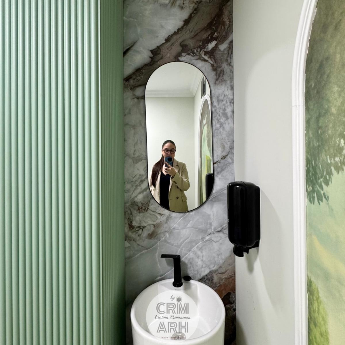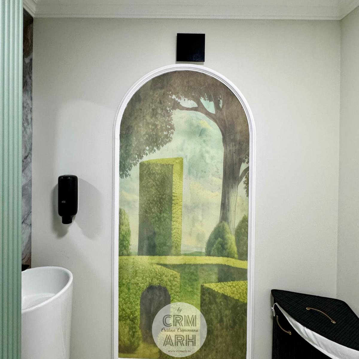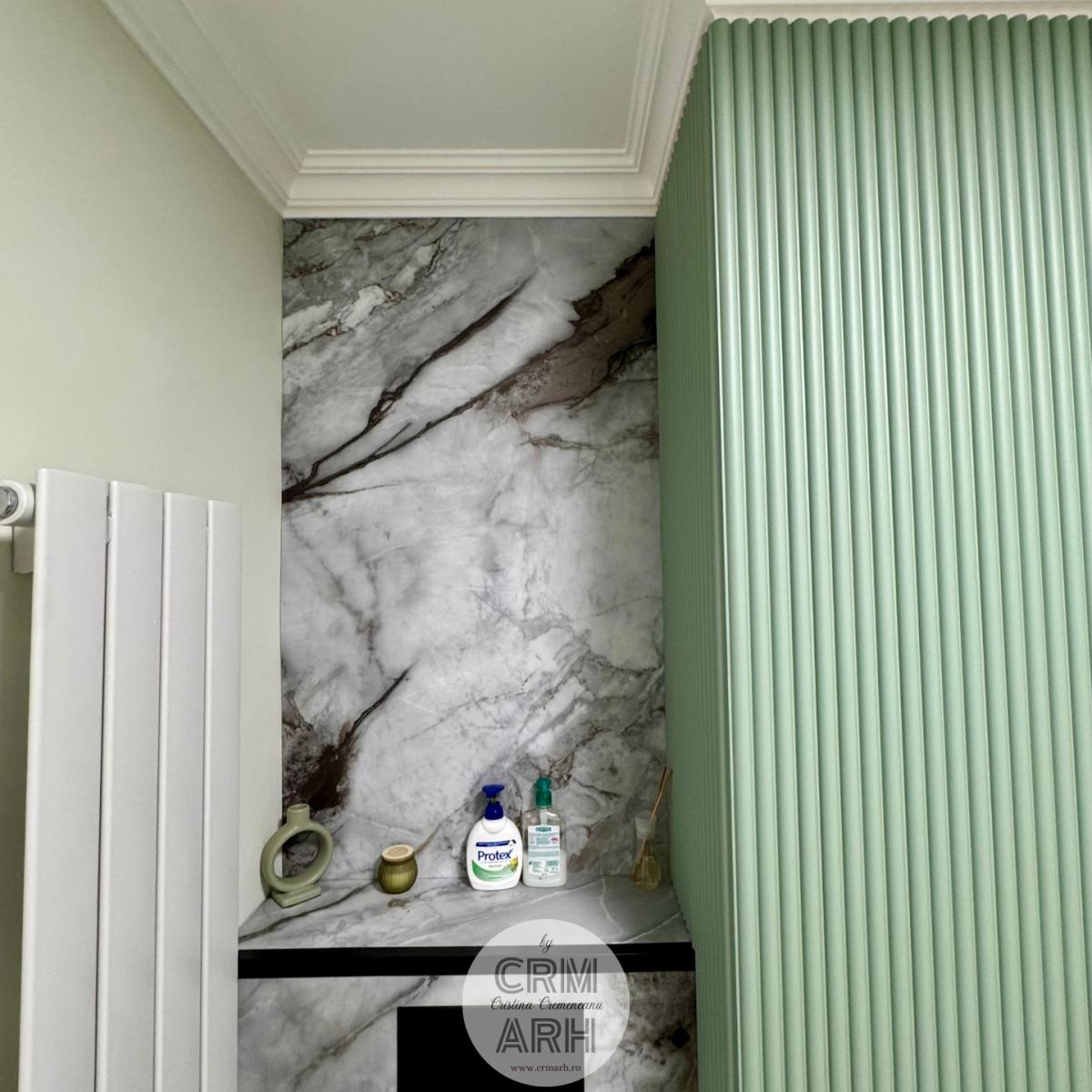 Baie in stil neoclasic pentru cabinet ORL, profile decorative, placi SPC pentru pereti, riflaje mdf si tapet personalizat de lux pentru un plus de efect. Un proiect de actualitate, atemporal.