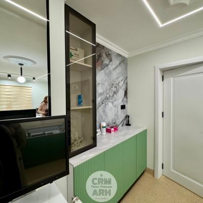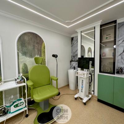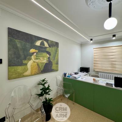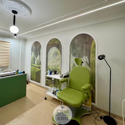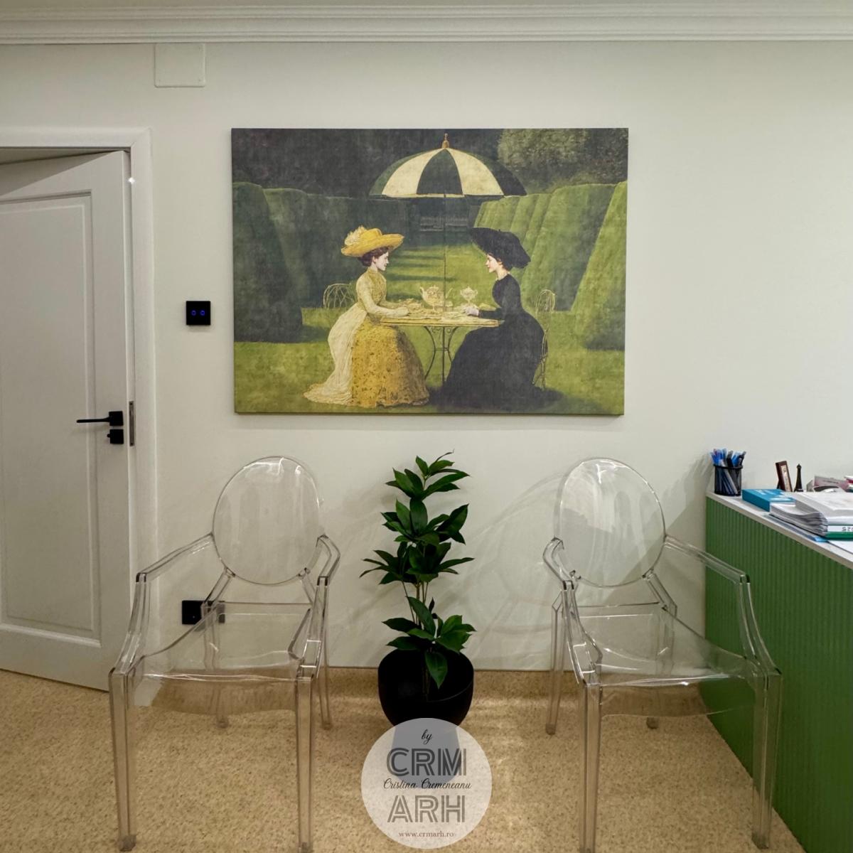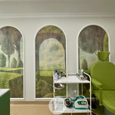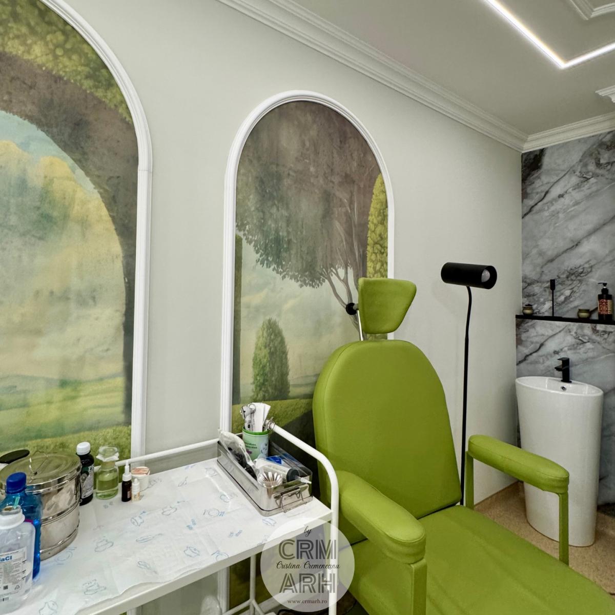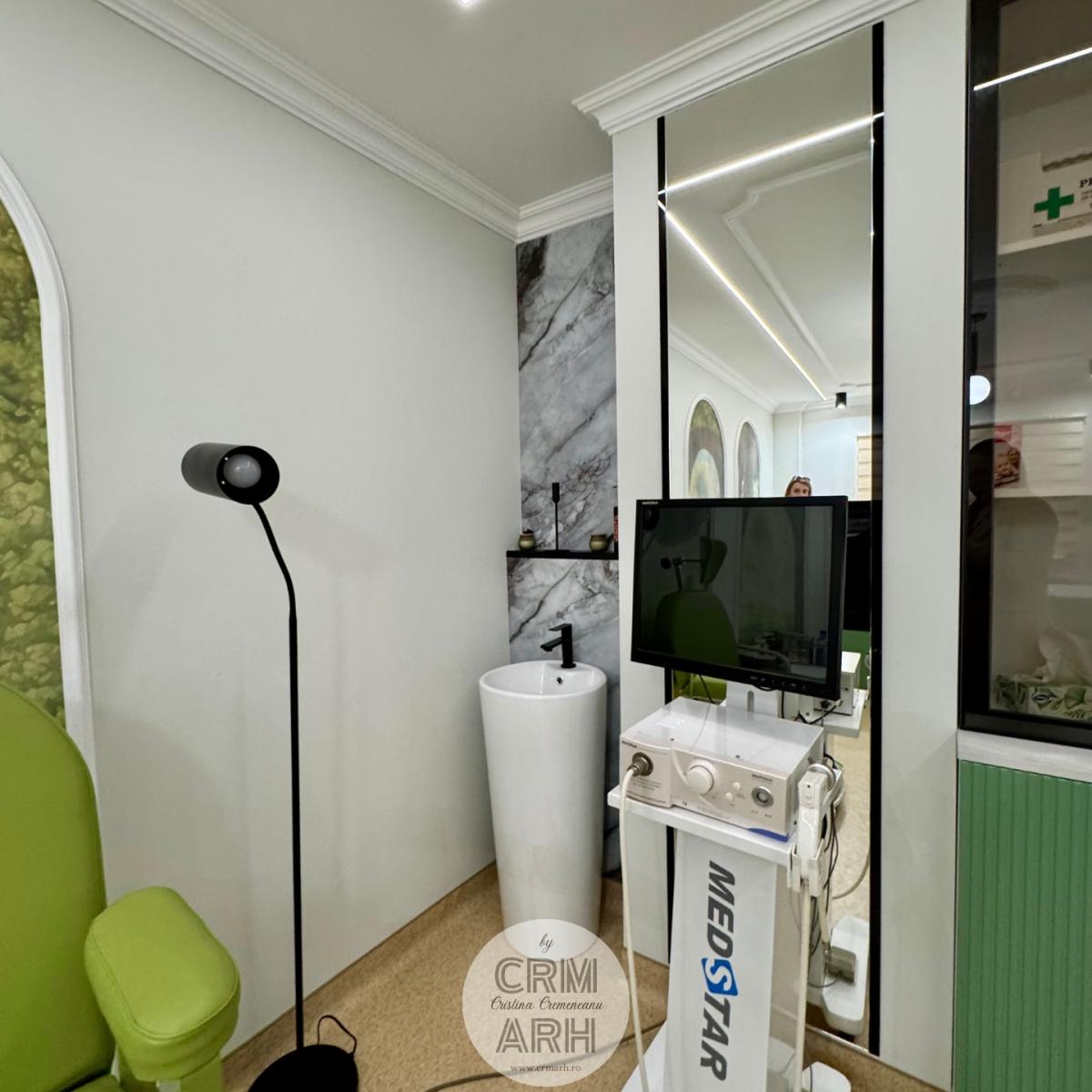 Design cabinet ORL de lux, stil neoclasic, tapet personalizat, profile decorative si oglinzi. O propunere actuala, spectaculoasa, accentuata de lumini ambientale si detalii deosebite.