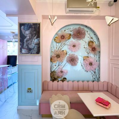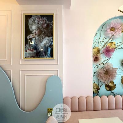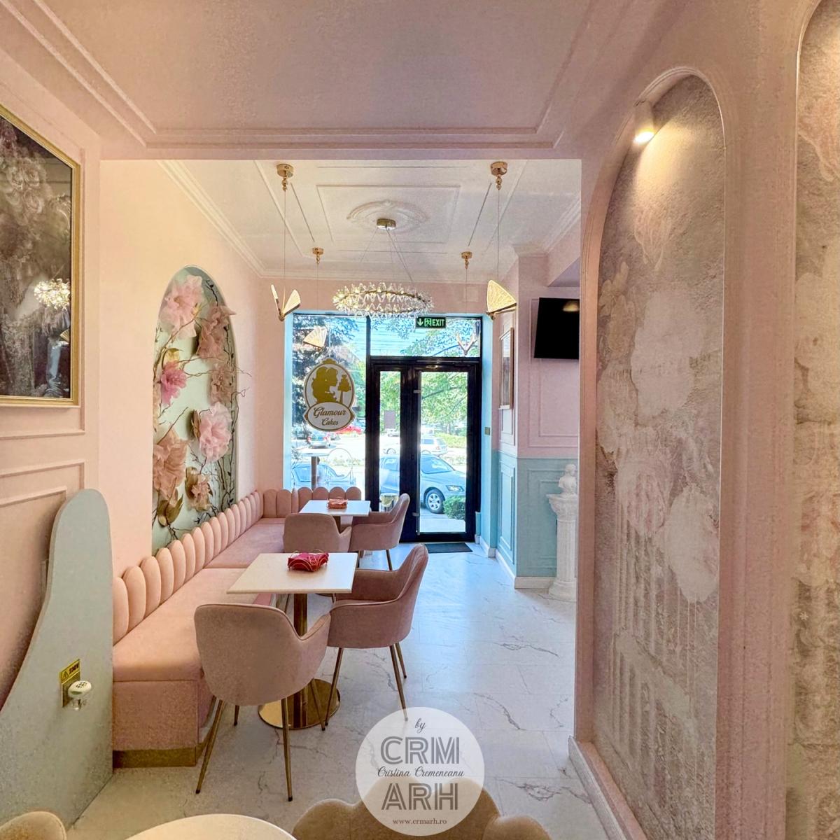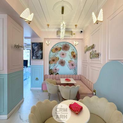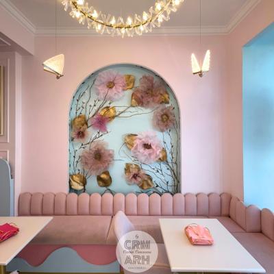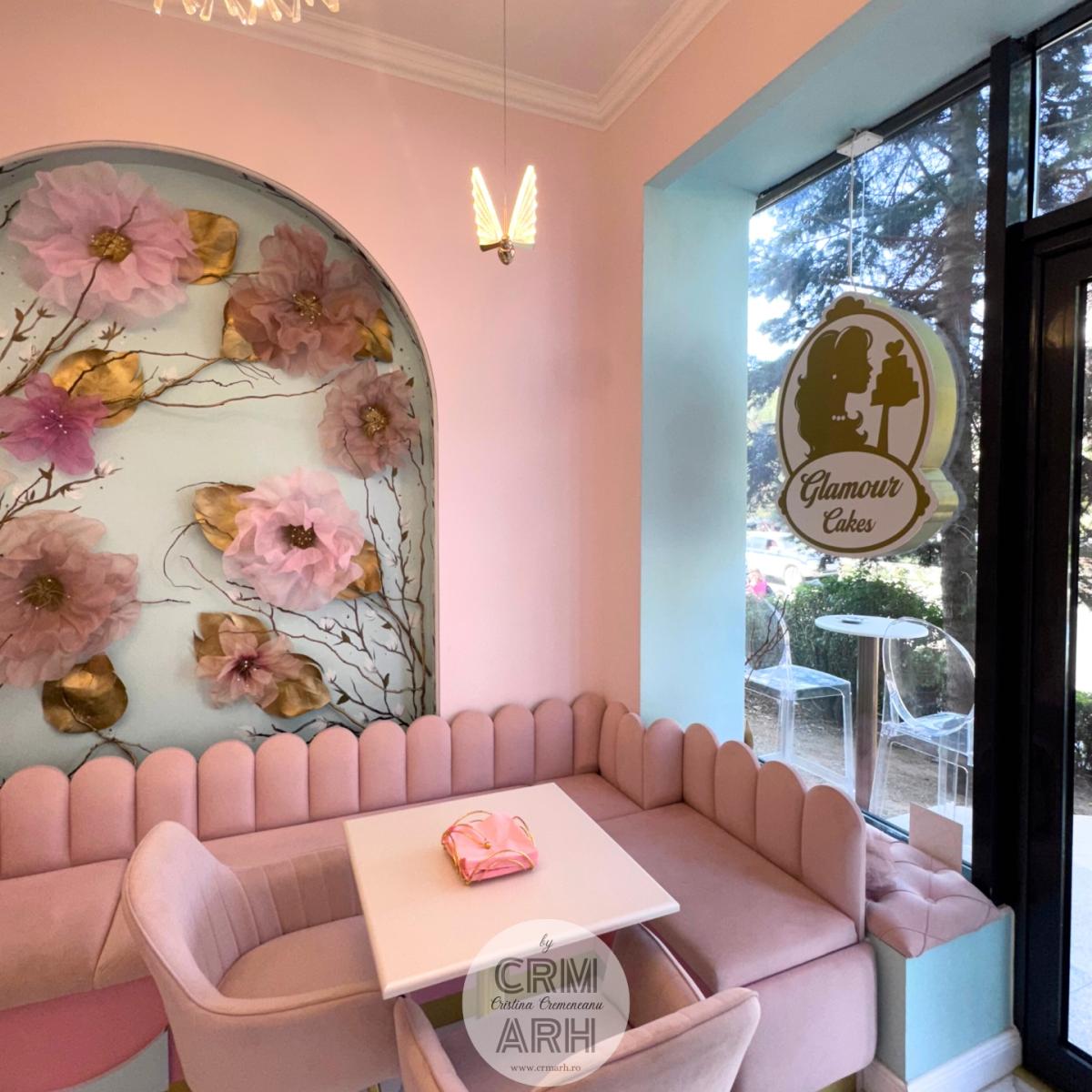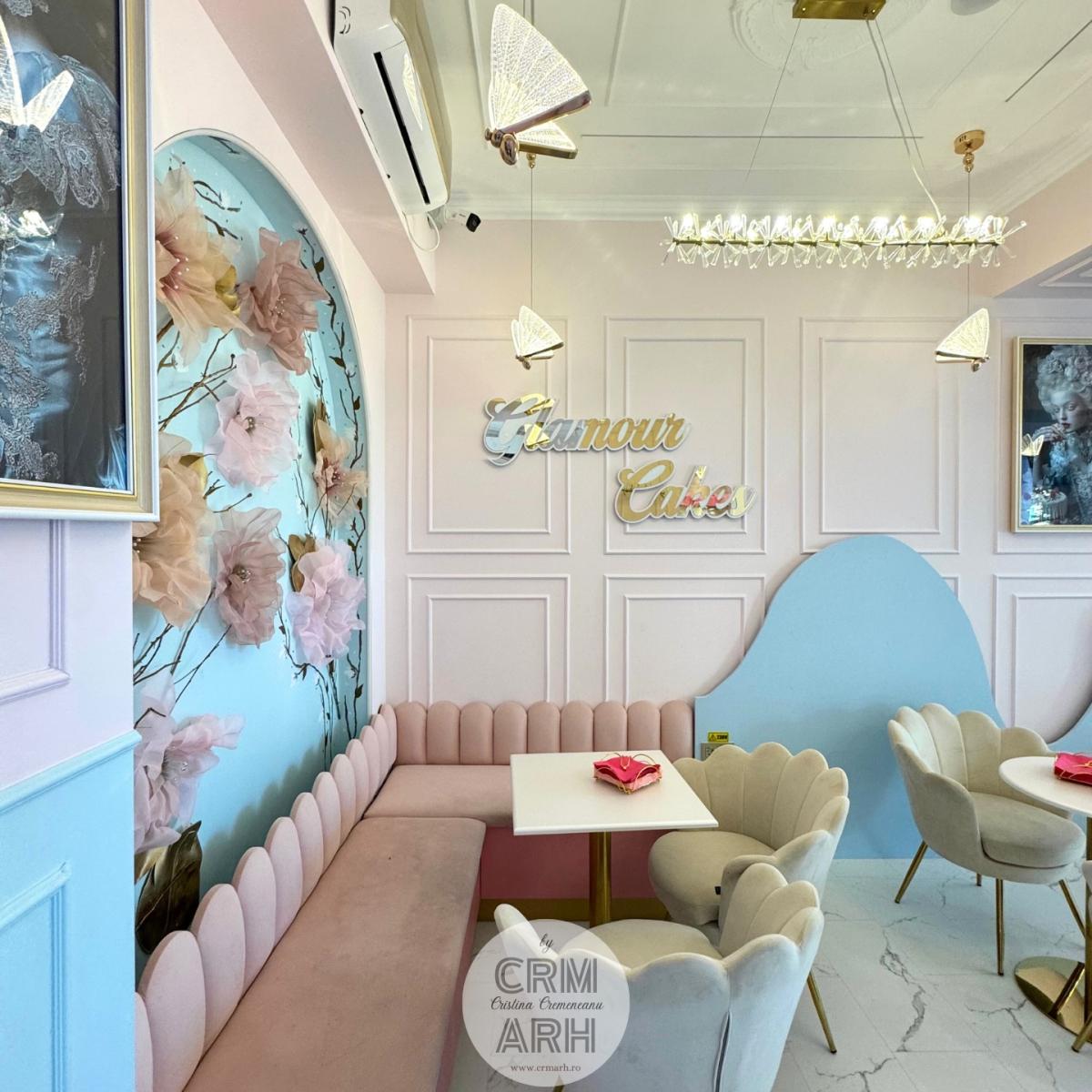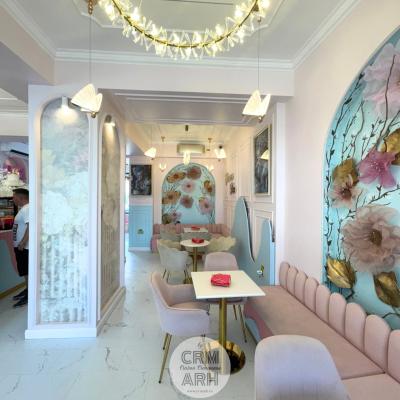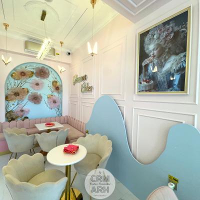 Design cofetarie de lux, nuante pastel, riflaje si profile decorative, flori gigant si detalii gold. O propunere superba, actuala, cu lumini ambientale de efect ce evidentiaza designul.