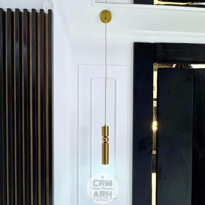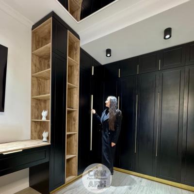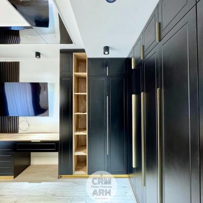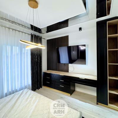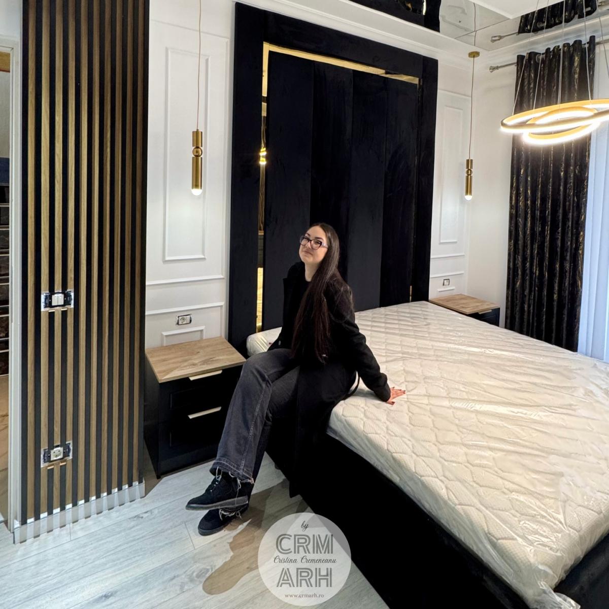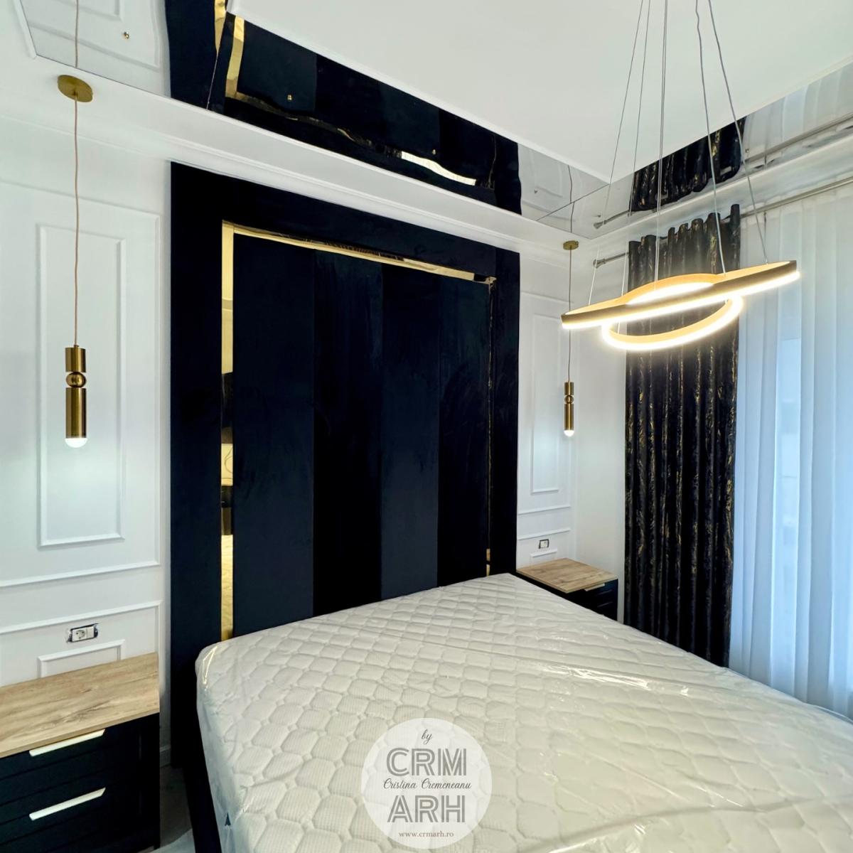 Dormitor de lux in tonuri de negru si lemn cu detalii gold, pat tapitat, mobilier mdf vopsit si vitrina de sticla. Accente de riflaje, profile decorative si oglinzi pe tavan. Un design elegant, luxos, pretentios.