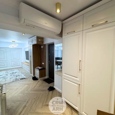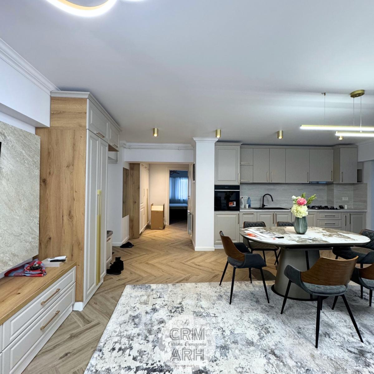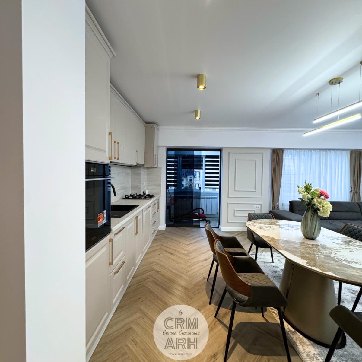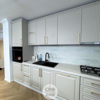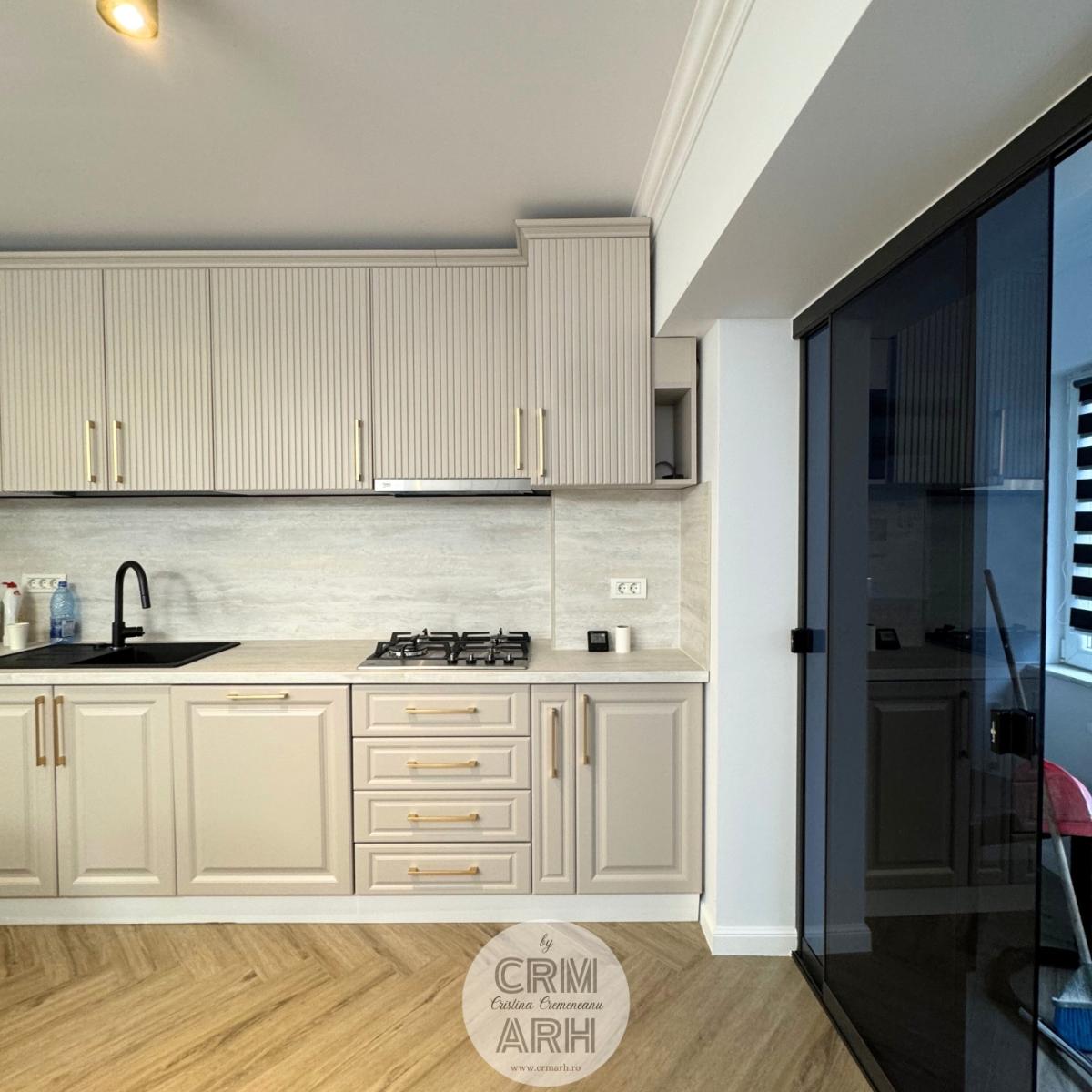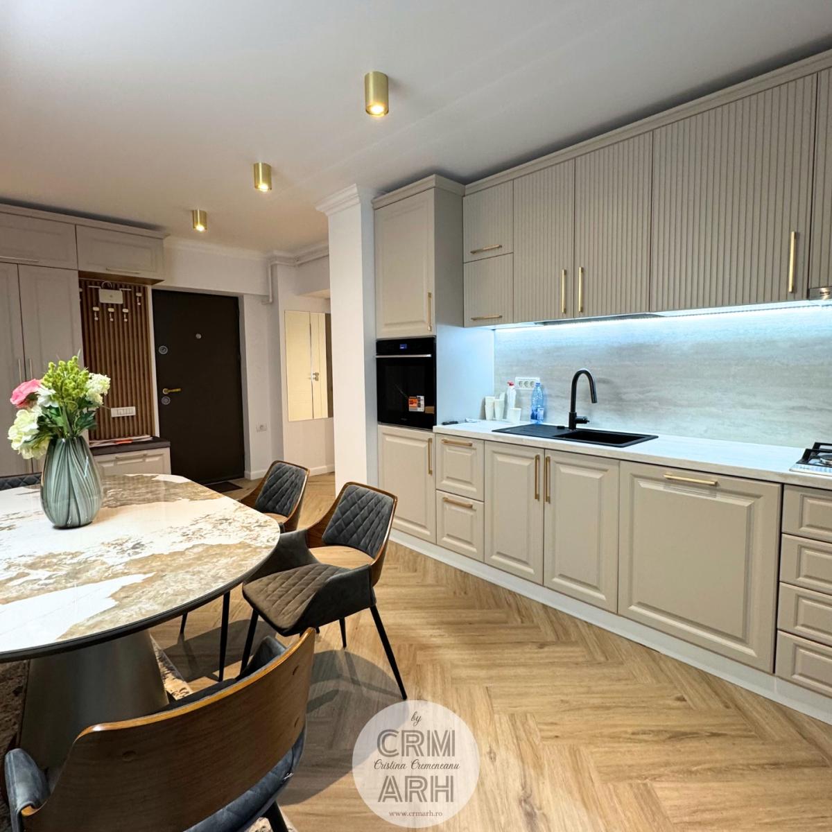 Bucatarie de lux pentru apartament open-space, mobilier mdf vopsit, detalii gold, lumini ambientale si insertii de lemn.