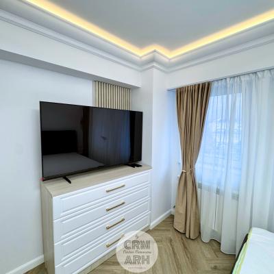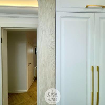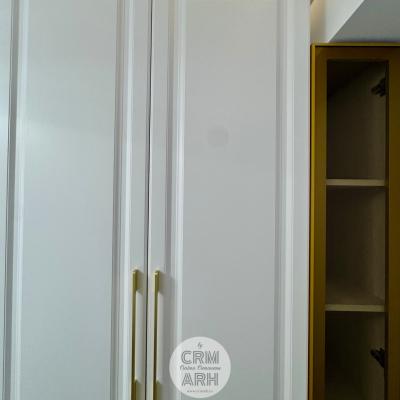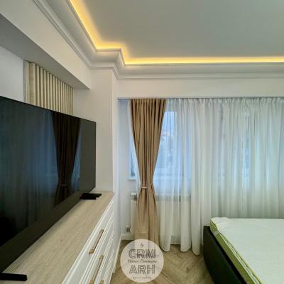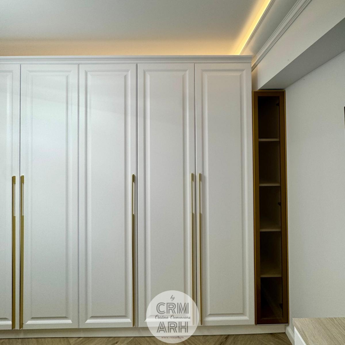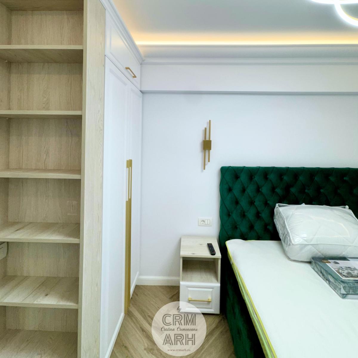 Dormitor de mici dimensiuni, stil luxuriant, mobilier mdf vopsit, profile decorative, catifea si lumini ambientale.