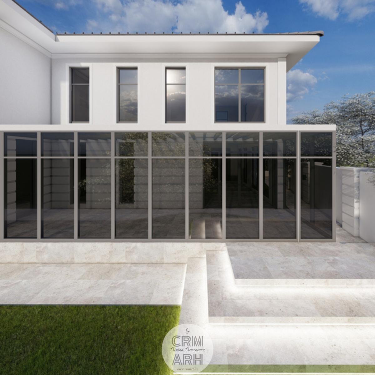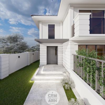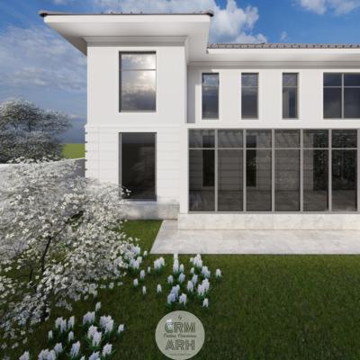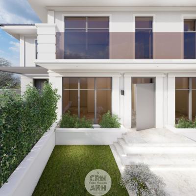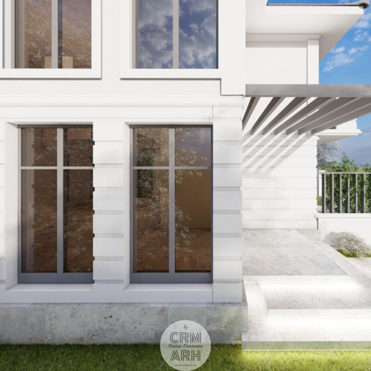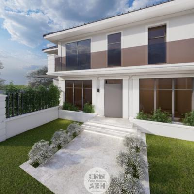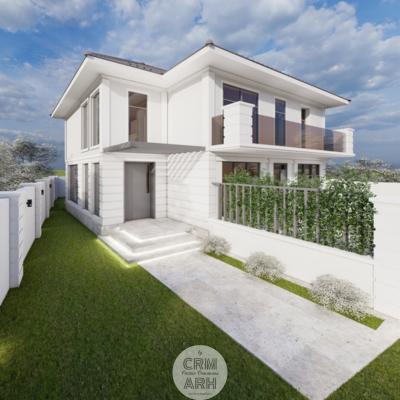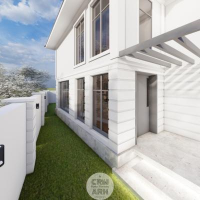 Amenajarea exterioară este realizată în stil neoclasic, evidențiat prin utilizarea profilelor decorative de fațadă care conturează ancadramentele ferestrelor, brâurile orizontale și cornișa superioară, conferind volum și eleganță compoziției arhitecturale. Fațada este completată prin placaje cu piatră naturală în zona de soclu sau la elementele accent, material ce adaugă textură și durabilitate, menținând totodată caracterul rafinat al ansamblului. Amenajarea este completată de vegetație decorativă și plante verzi amplasate strategic în apropierea intrării și de-a lungul fațadei, contribuind la crearea unei atmosfere elegante, primitoare și echilibrate vizual.