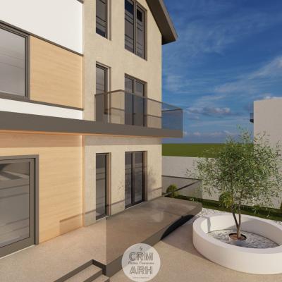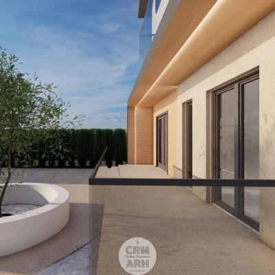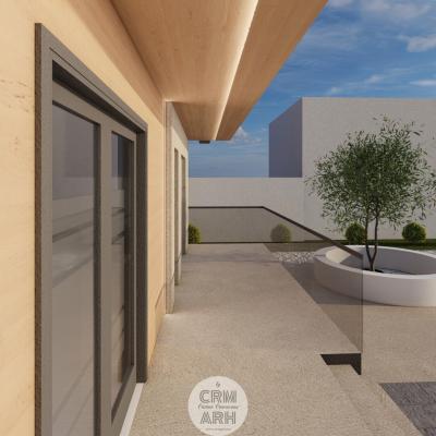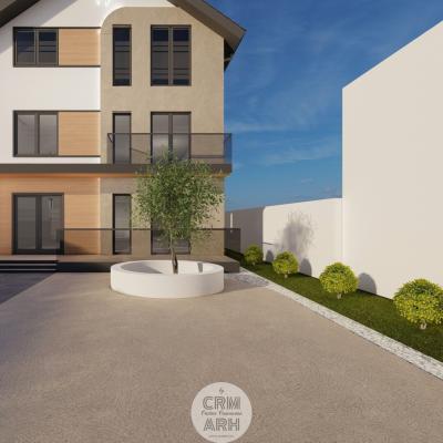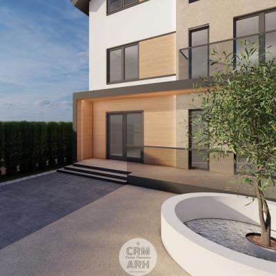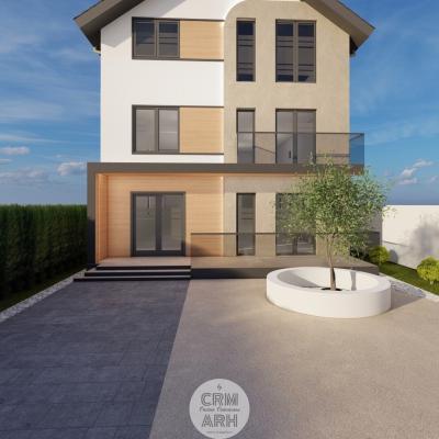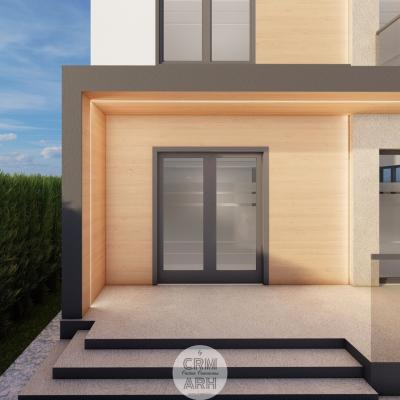 Fațada clinicii stomatologice este concepută într-un stil ultra modern, ce combină armonios lemnul natural, piatra și iluminatul LED pentru a crea un aspect elegant și profesionist. Materialele sunt alese pentru contrast și rafinament: lemnul aduce căldură și naturalețe, piatra oferă stabilitate și durabilitate, iar profilele metalice negre accentuează liniile arhitecturale curate. Zonele vitrate mari și finisajele mate contribuie la o imagine contemporană, care inspiră încredere și confort pacienților.