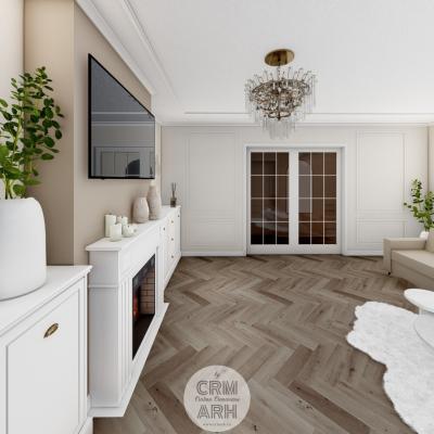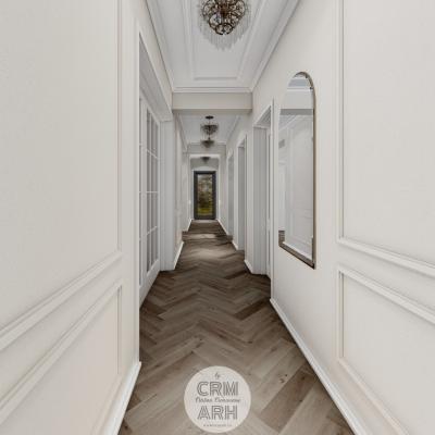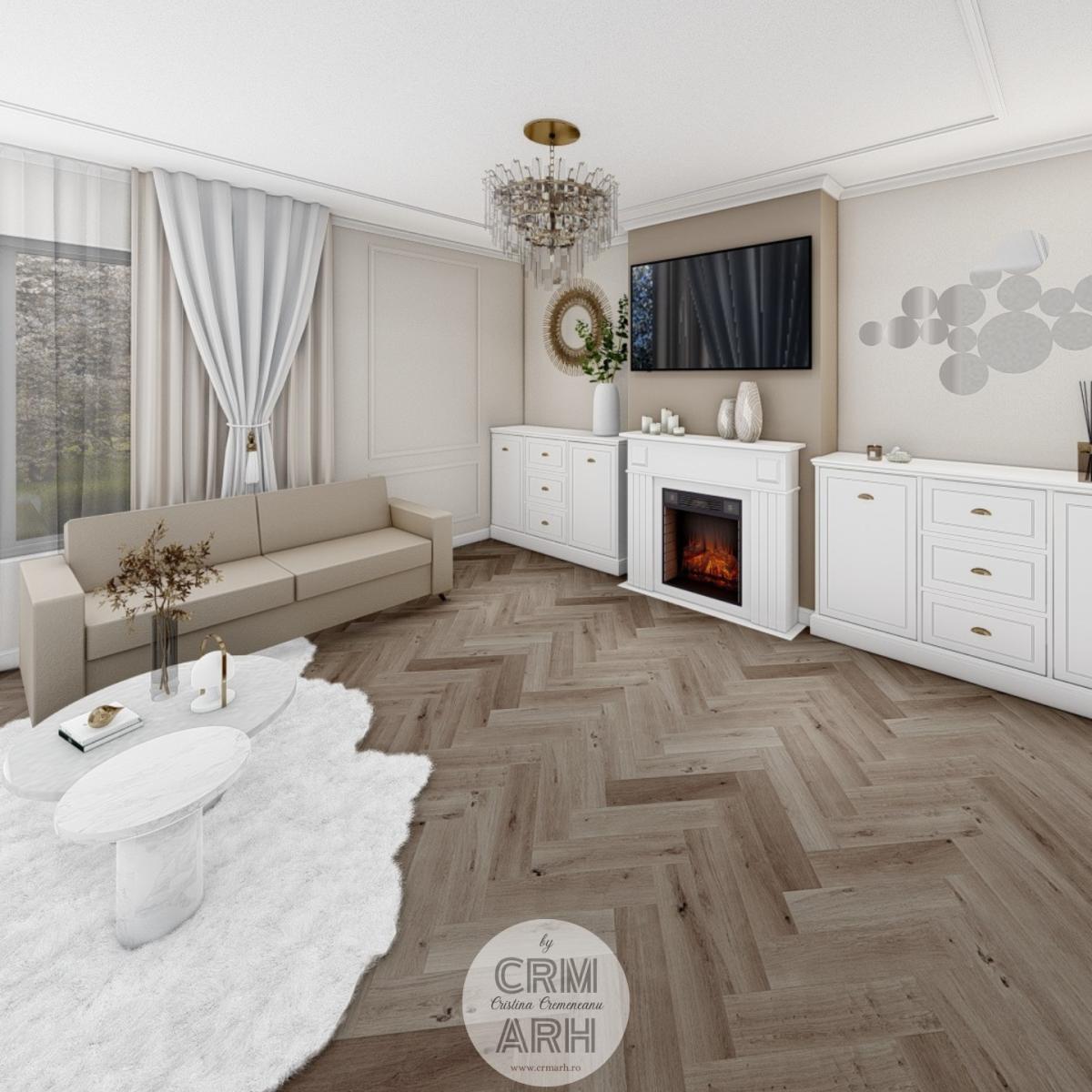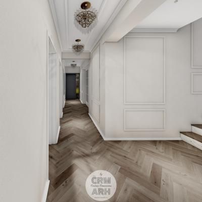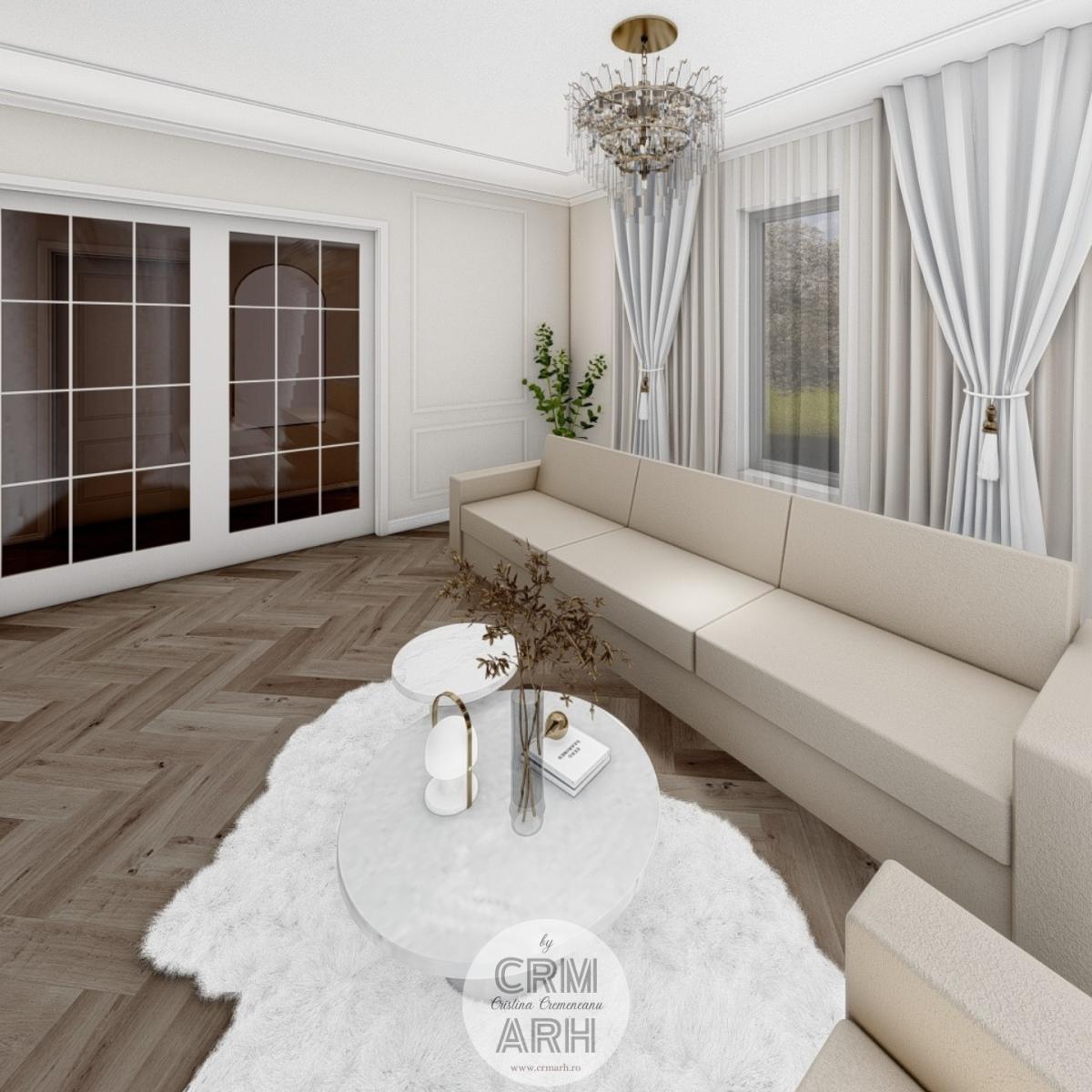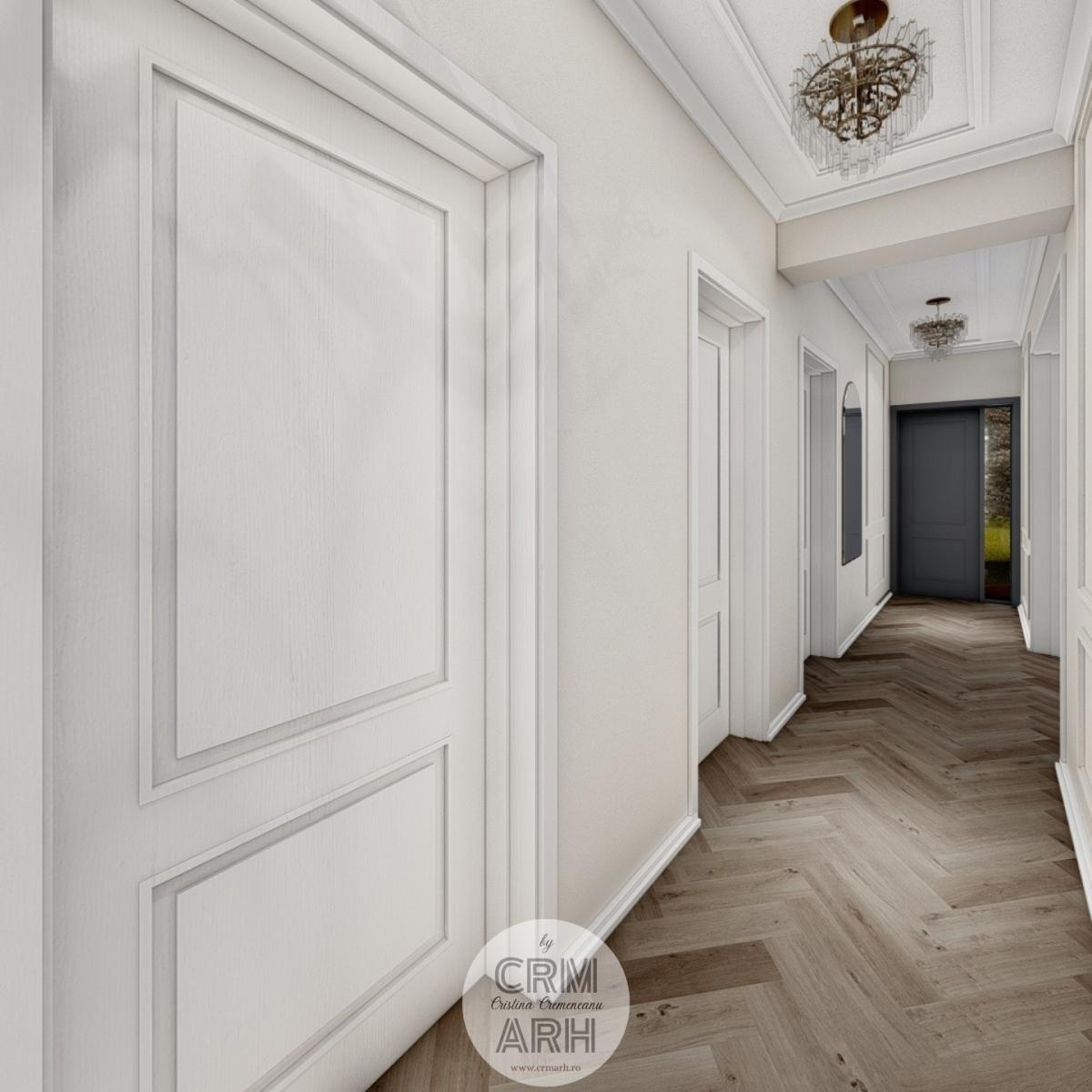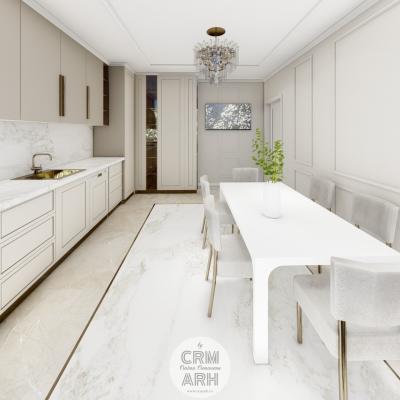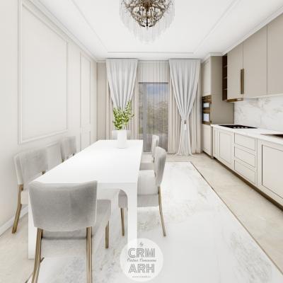 Designul casei în stil clasic propune un ambient elegant și rafinat, bazat pe proporții armonioase, finisaje luminoase și detalii decorative atent alese. Pereții în nuanțe de crem sau ivoire sunt îmbogățiți cu profile decorative — plinte, cornișe și rame perimetrale — care subliniază arhitectura clasică. Pardoseala din parchet SPC în tonuri calde de stejar adaugă un contrast natural față de mobilierul alb, completând atmosfera luminoasă și echilibrată. Mobilierul alb cu fronturi frezate și accente aurii creează o imagine sofisticată, completată de corpuri de iluminat din cristal și textile prețioase precum catifeaua sau mătasea.Întregul design reflectă o eleganță atemporală, în care clasicul este reinterpretat prin materiale moderne și o paletă cromatică caldă și luminoasă.