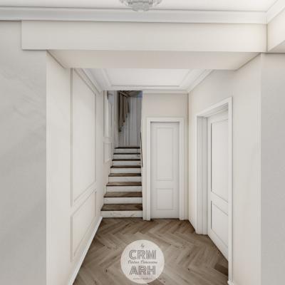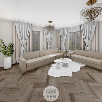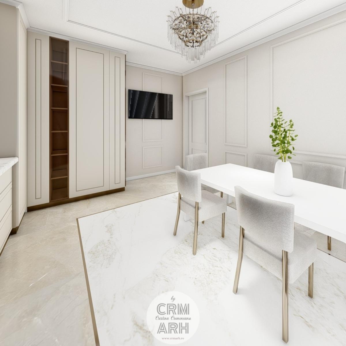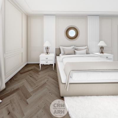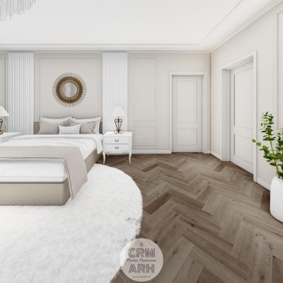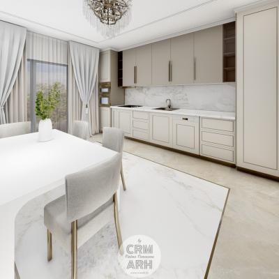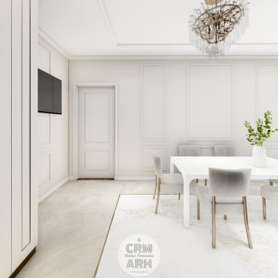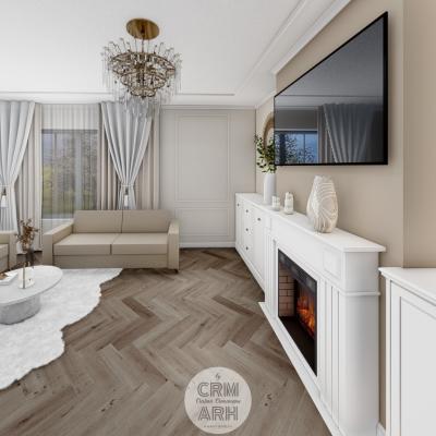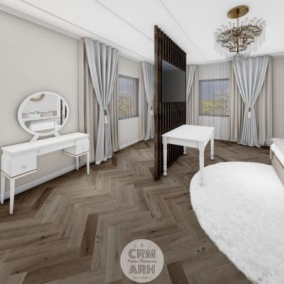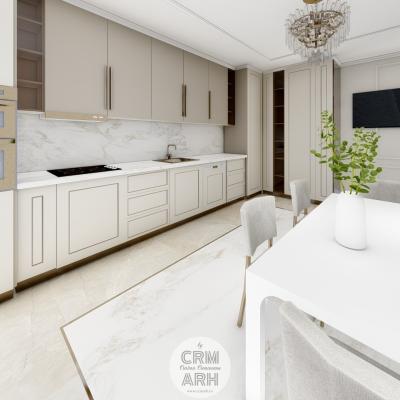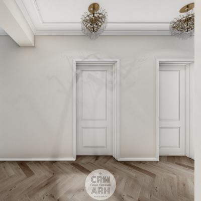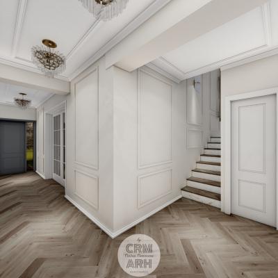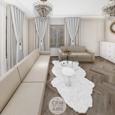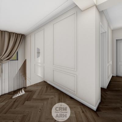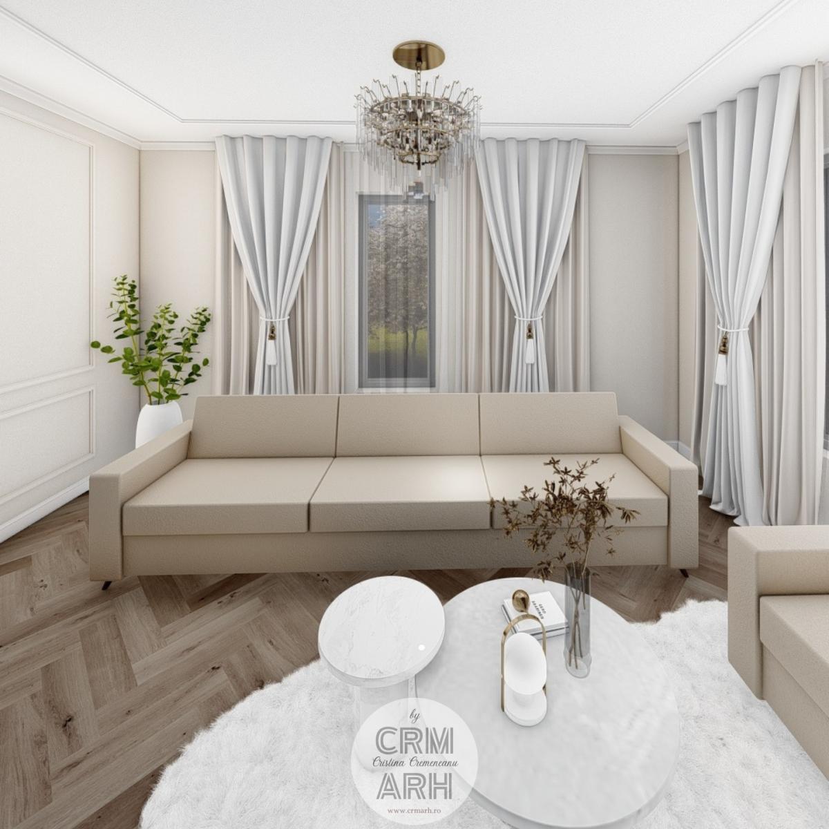 Designul casei în stil clasic propune un ambient elegant și rafinat, bazat pe proporții armonioase, finisaje luminoase și detalii decorative atent alese. Pereții în nuanțe de crem sau ivoire sunt îmbogățiți cu profile decorative — plinte, cornișe și rame perimetrale — care subliniază arhitectura clasică. Pardoseala din parchet SPC în tonuri calde de stejar adaugă un contrast natural față de mobilierul alb, completând atmosfera luminoasă și echilibrată. Mobilierul alb cu fronturi frezate și accente aurii creează o imagine sofisticată, completată de corpuri de iluminat din cristal și textile prețioase precum catifeaua sau mătasea.Întregul design reflectă o eleganță atemporală, în care clasicul este reinterpretat prin materiale moderne și o paletă cromatică caldă și luminoasă.