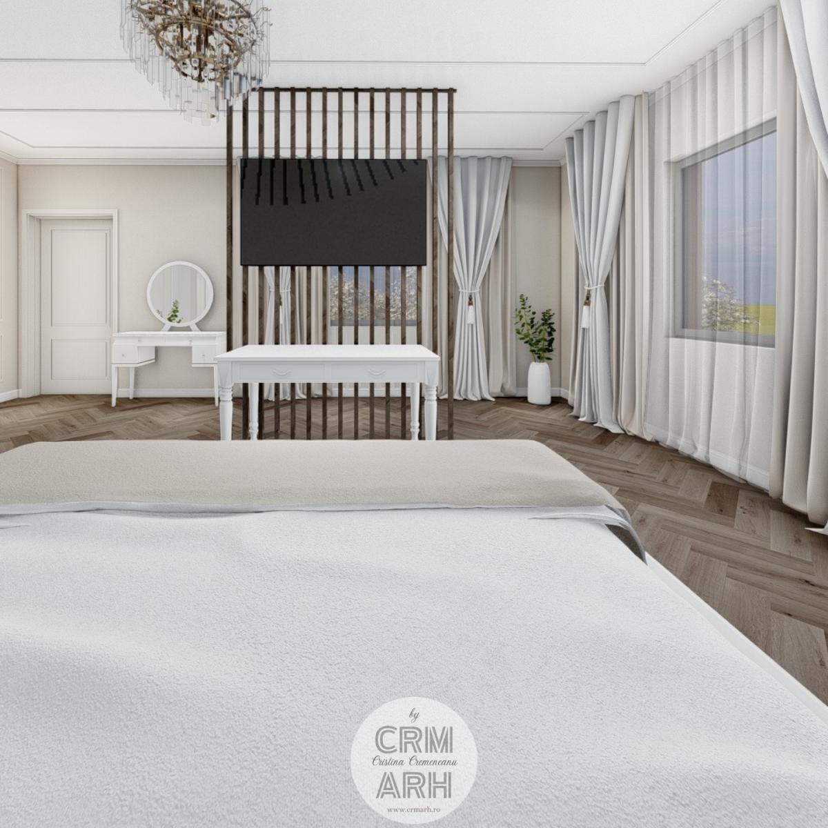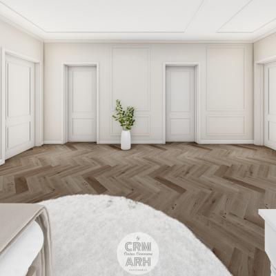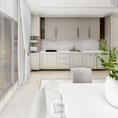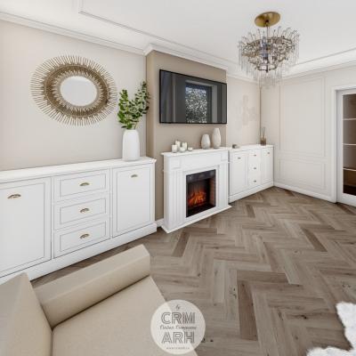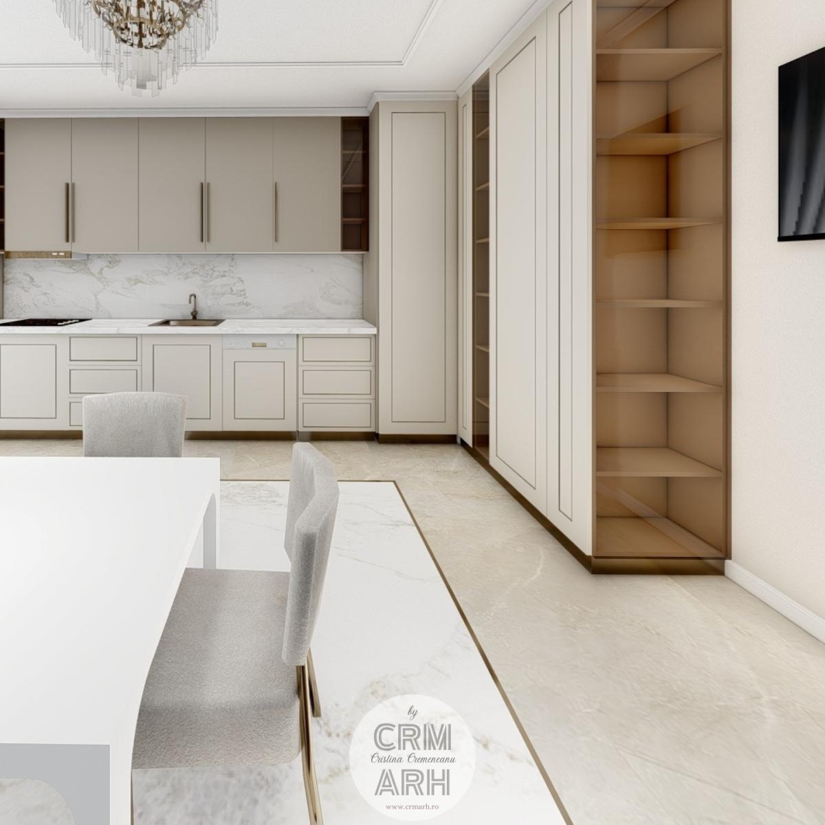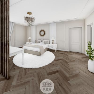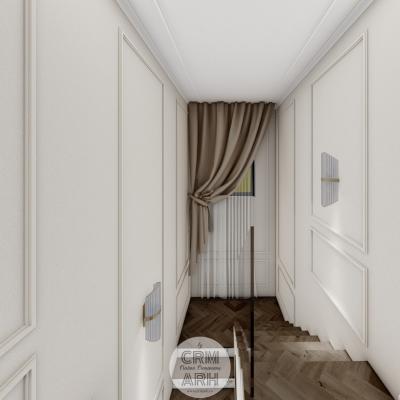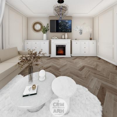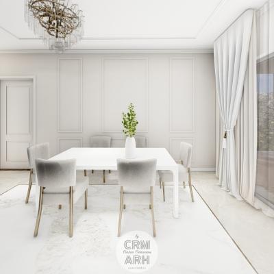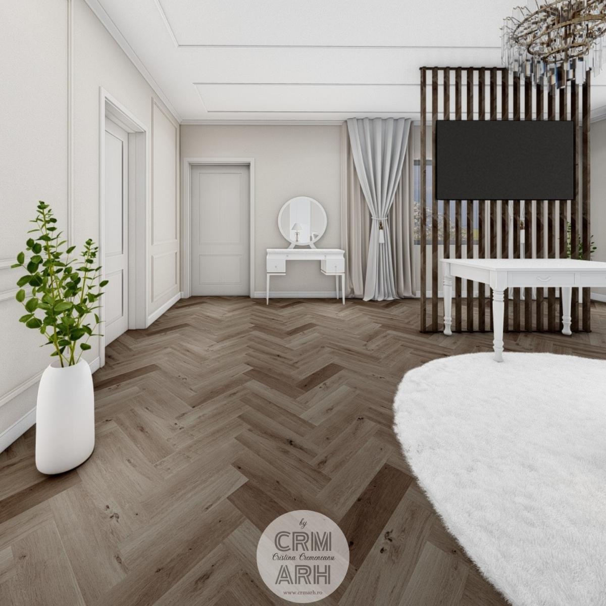 Designul casei în stil clasic propune un ambient elegant și rafinat, bazat pe proporții armonioase, finisaje luminoase și detalii decorative atent alese. Pereții în nuanțe de crem sau ivoire sunt îmbogățiți cu profile decorative — plinte, cornișe și rame perimetrale — care subliniază arhitectura clasică. Pardoseala din parchet SPC în tonuri calde de stejar adaugă un contrast natural față de mobilierul alb, completând atmosfera luminoasă și echilibrată. Mobilierul alb cu fronturi frezate și accente aurii creează o imagine sofisticată, completată de corpuri de iluminat din cristal și textile prețioase precum catifeaua sau mătasea.Întregul design reflectă o eleganță atemporală, în care clasicul este reinterpretat prin materiale moderne și o paletă cromatică caldă și luminoasă.
