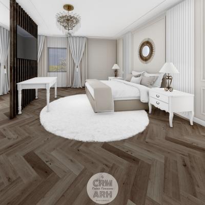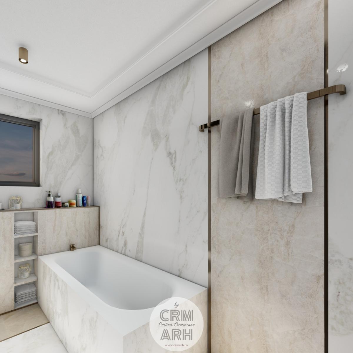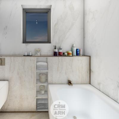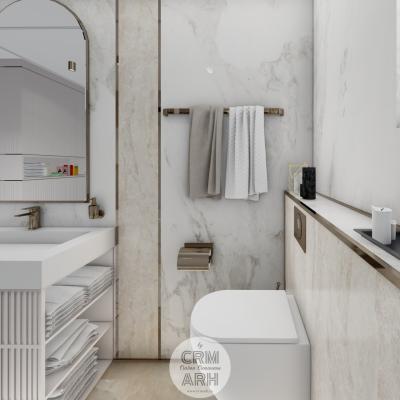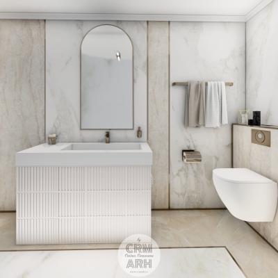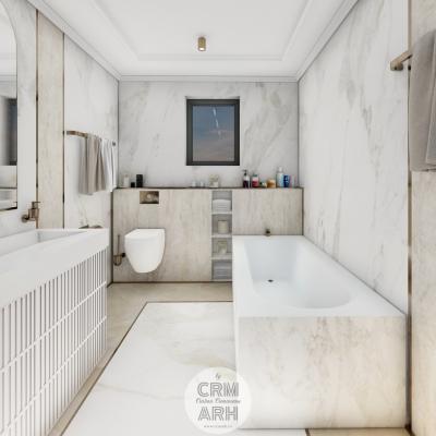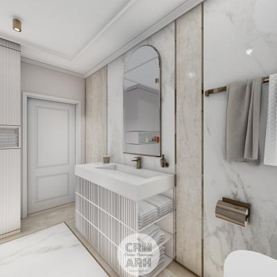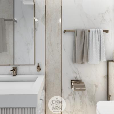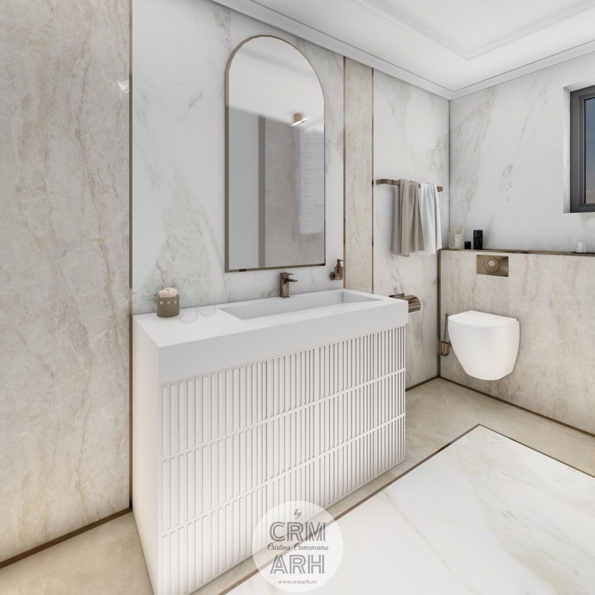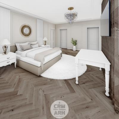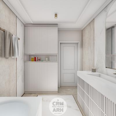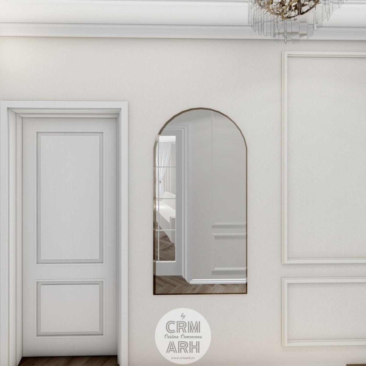 Designul casei în stil clasic propune un ambient elegant și rafinat, bazat pe proporții armonioase, finisaje luminoase și detalii decorative atent alese. Pereții în nuanțe de crem sau ivoire sunt îmbogățiți cu profile decorative — plinte, cornișe și rame perimetrale — care subliniază arhitectura clasică. Pardoseala din parchet SPC în tonuri calde de stejar adaugă un contrast natural față de mobilierul alb, completând atmosfera luminoasă și echilibrată. Mobilierul alb cu fronturi frezate și accente aurii creează o imagine sofisticată, completată de corpuri de iluminat din cristal și textile prețioase precum catifeaua sau mătasea.Întregul design reflectă o eleganță atemporală, în care clasicul este reinterpretat prin materiale moderne și o paletă cromatică caldă și luminoasă.