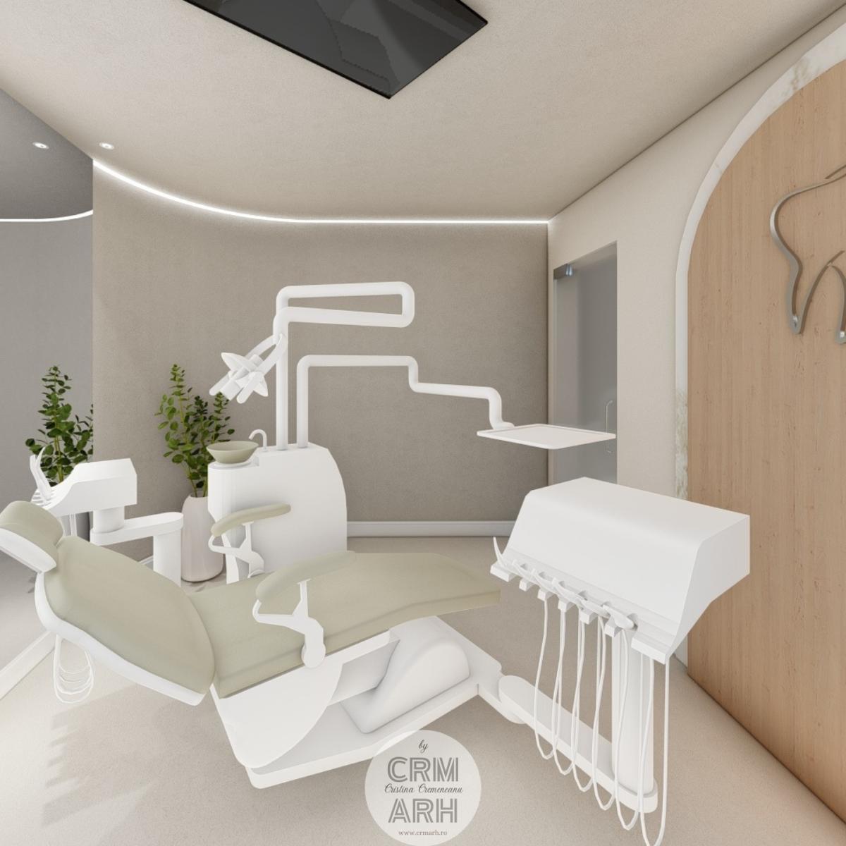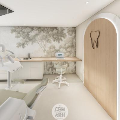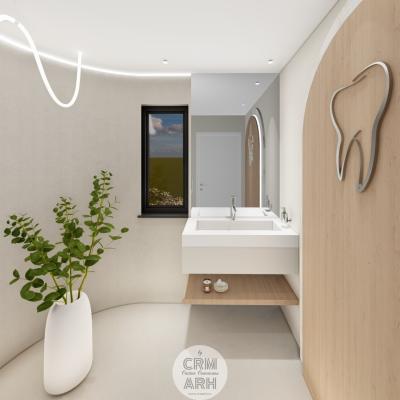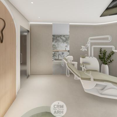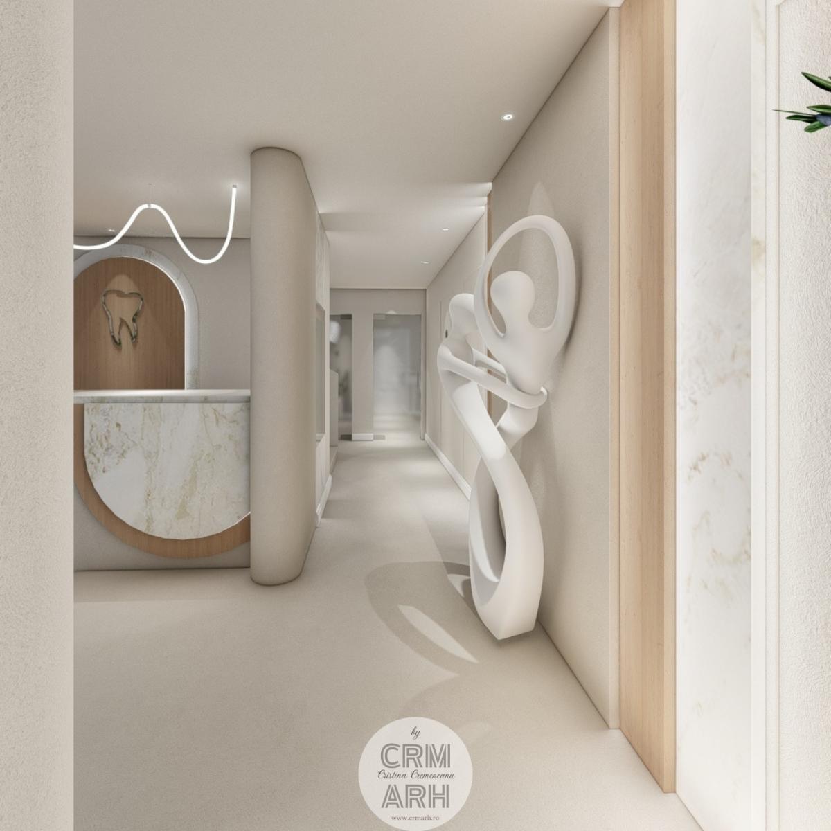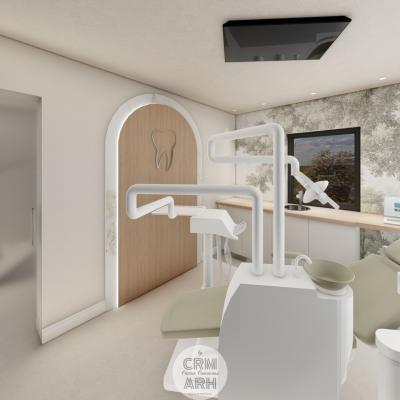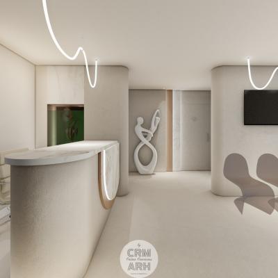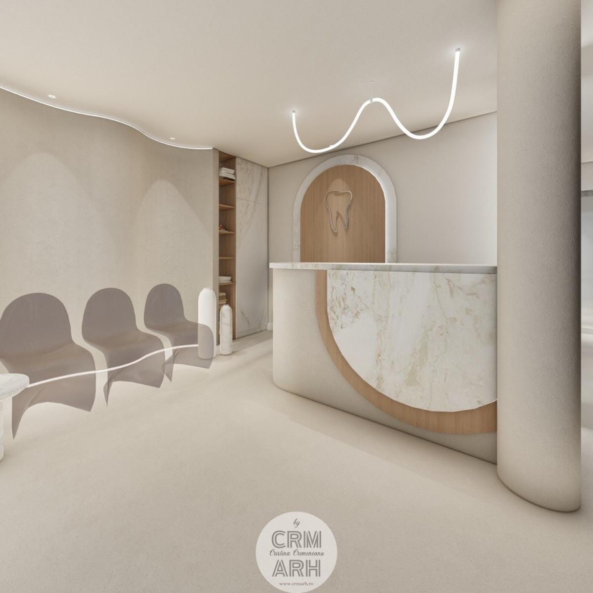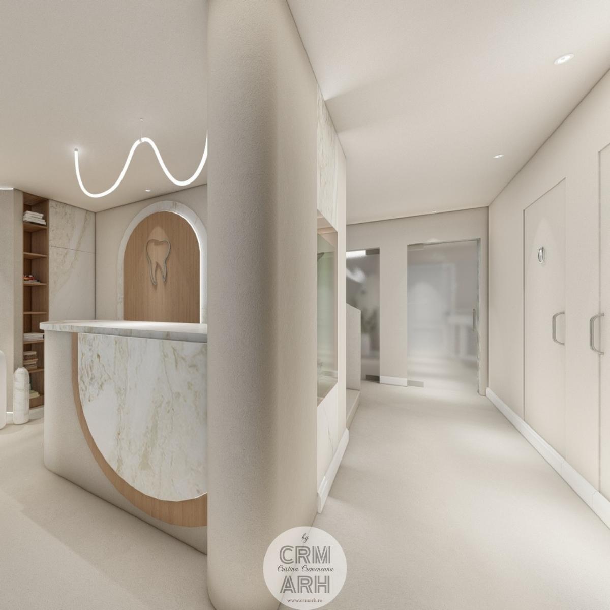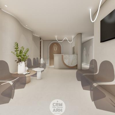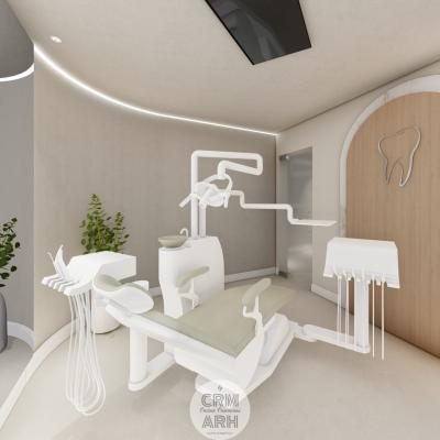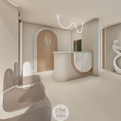 Clinica stomatologică este gândită în stil ultra modern minimalist, cu finisaje premium precum microcimentul aplicat pe pardoseală și pereți selectivi, mobilier medical cu linii drepte și suprafețe antibacteriene lucioase, dar și compartimentări din sticlă pentru transparență și lumină naturală. Recepția devine un punct de atracție prin desk-ul de microciment cu LED-uri încastrate, completat de un tapet cu texturi geometrice sau naturale și fotolii ergonomice în tonuri neutre. În cabinete și spațiile auxiliare, iluminatul joacă rol central: spoturi direcționate pentru zona de lucru, dar și profile LED ambientale ascunse în scafe sau mobilier, care creează o experiență relaxantă pentru pacienți. Grupurile sanitare și coridoarele urmează aceeași linie modernă, cu microciment, oglinzi cu iluminare LED și detalii metalice fine. Întregul concept îmbină minimalismul curat cu accente calde și detalii premium, rezultând o clinică sofisticată, funcțională și primitoare.