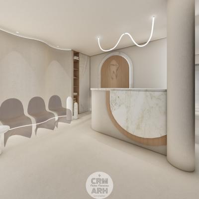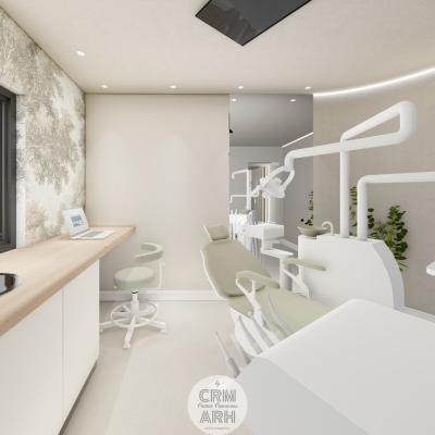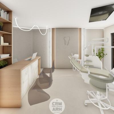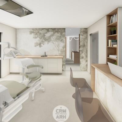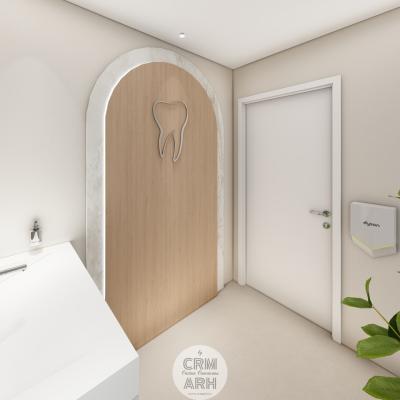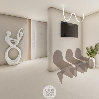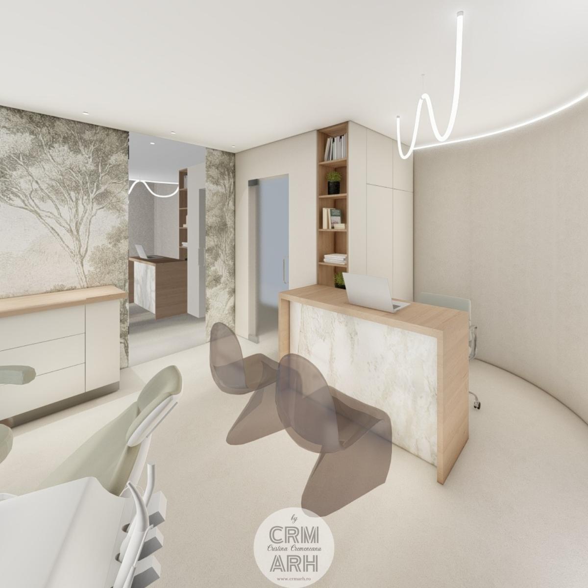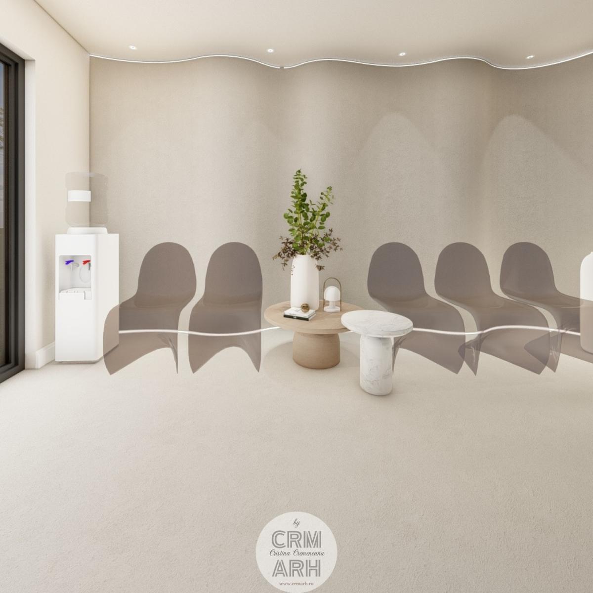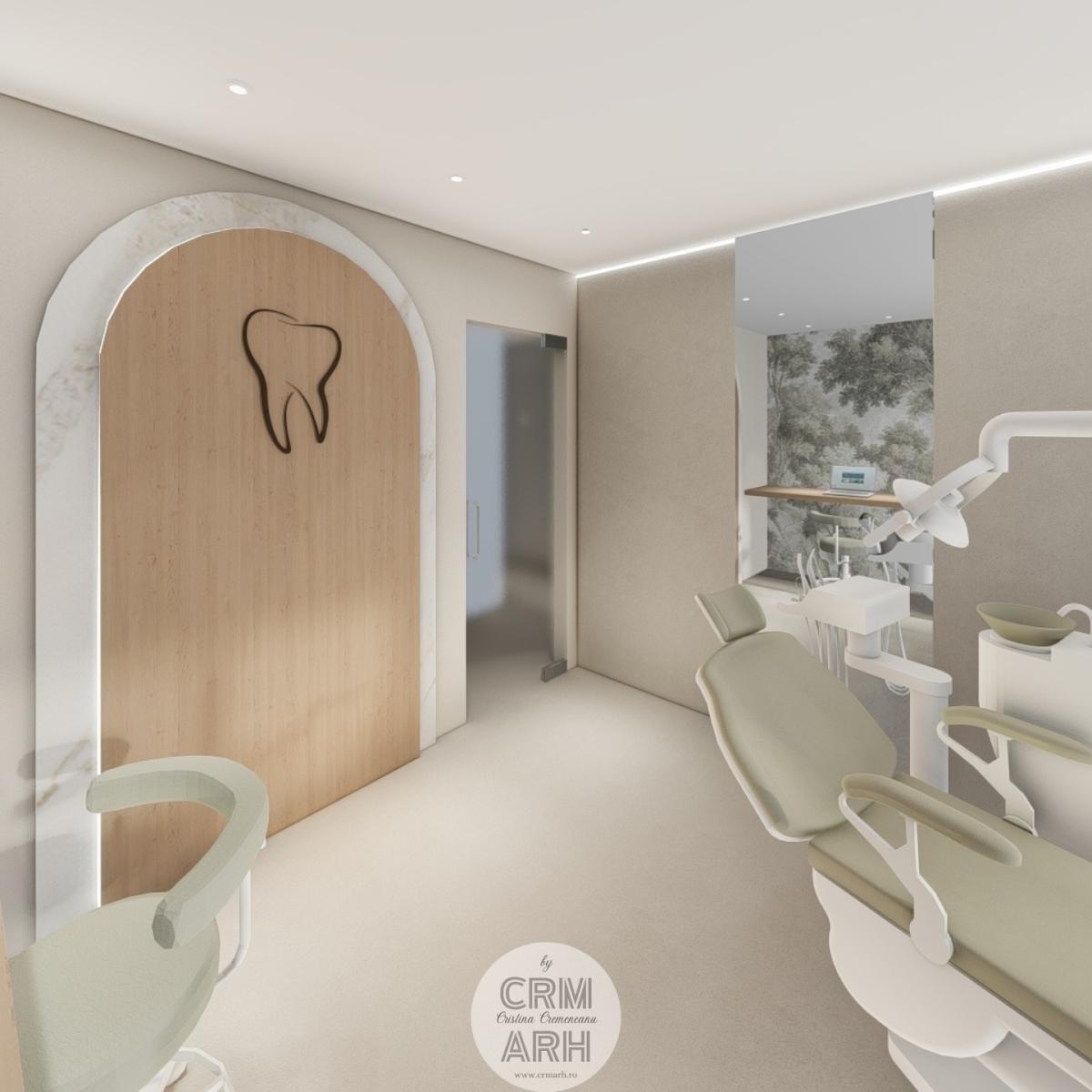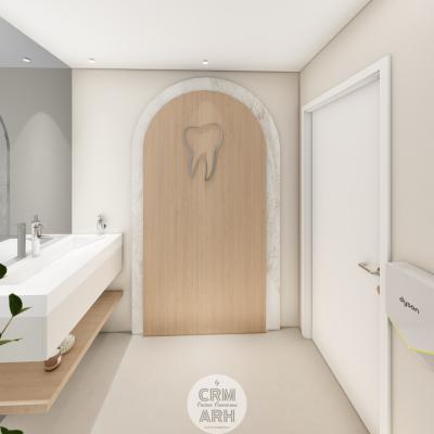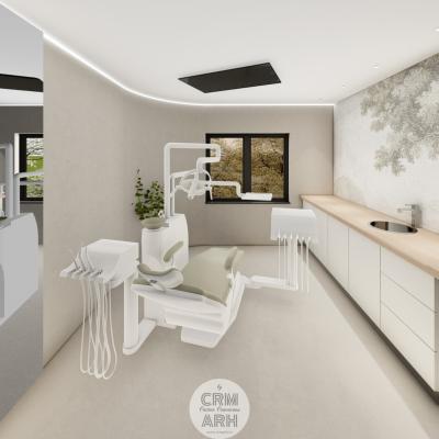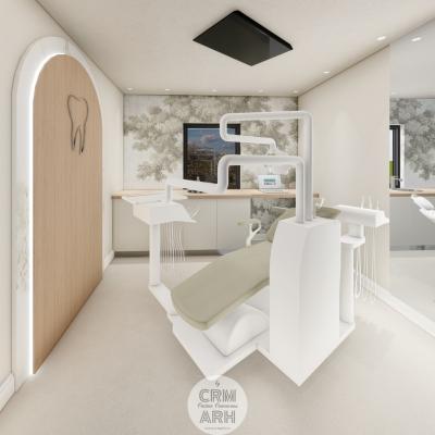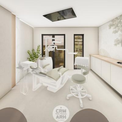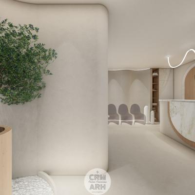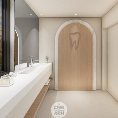 Clinica stomatologică este gândită în stil ultra modern minimalist, cu finisaje premium precum microcimentul aplicat pe pardoseală și pereți selectivi, mobilier medical cu linii drepte și suprafețe antibacteriene lucioase, dar și compartimentări din sticlă pentru transparență și lumină naturală. Recepția devine un punct de atracție prin desk-ul de microciment cu LED-uri încastrate, completat de un tapet cu texturi geometrice sau naturale și fotolii ergonomice în tonuri neutre. În cabinete și spațiile auxiliare, iluminatul joacă rol central: spoturi direcționate pentru zona de lucru, dar și profile LED ambientale ascunse în scafe sau mobilier, care creează o experiență relaxantă pentru pacienți. Grupurile sanitare și coridoarele urmează aceeași linie modernă, cu microciment, oglinzi cu iluminare LED și detalii metalice fine. Întregul concept îmbină minimalismul curat cu accente calde și detalii premium, rezultând o clinică sofisticată, funcțională și primitoare.