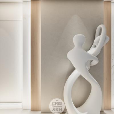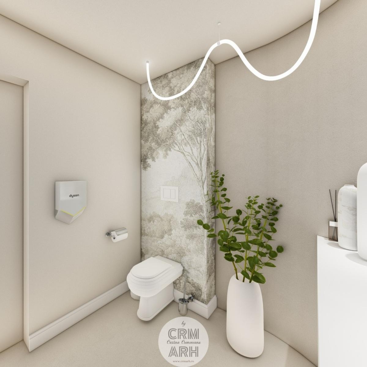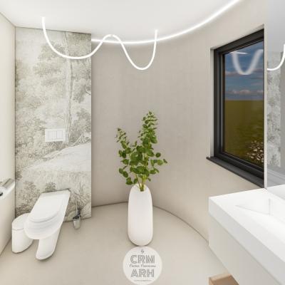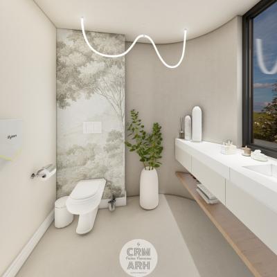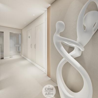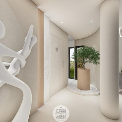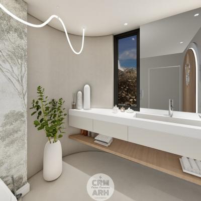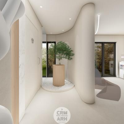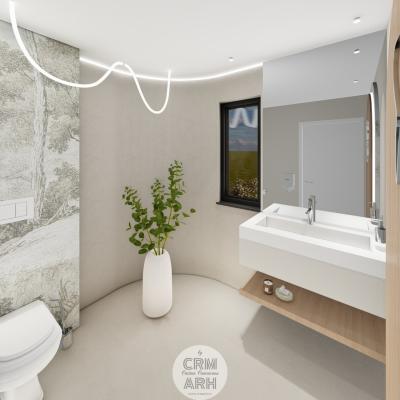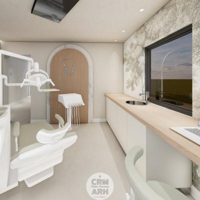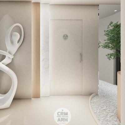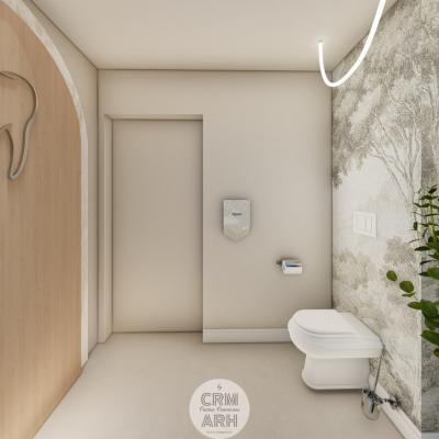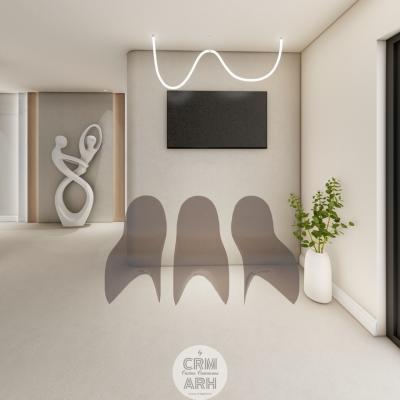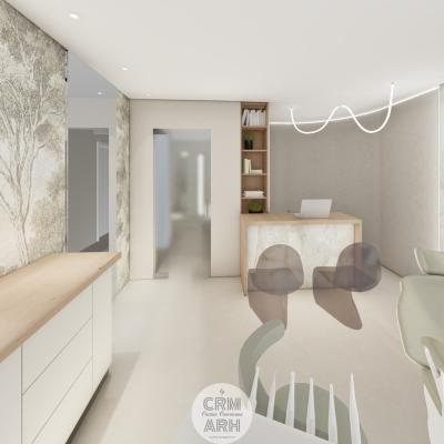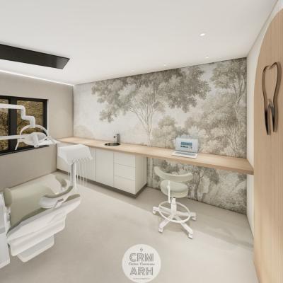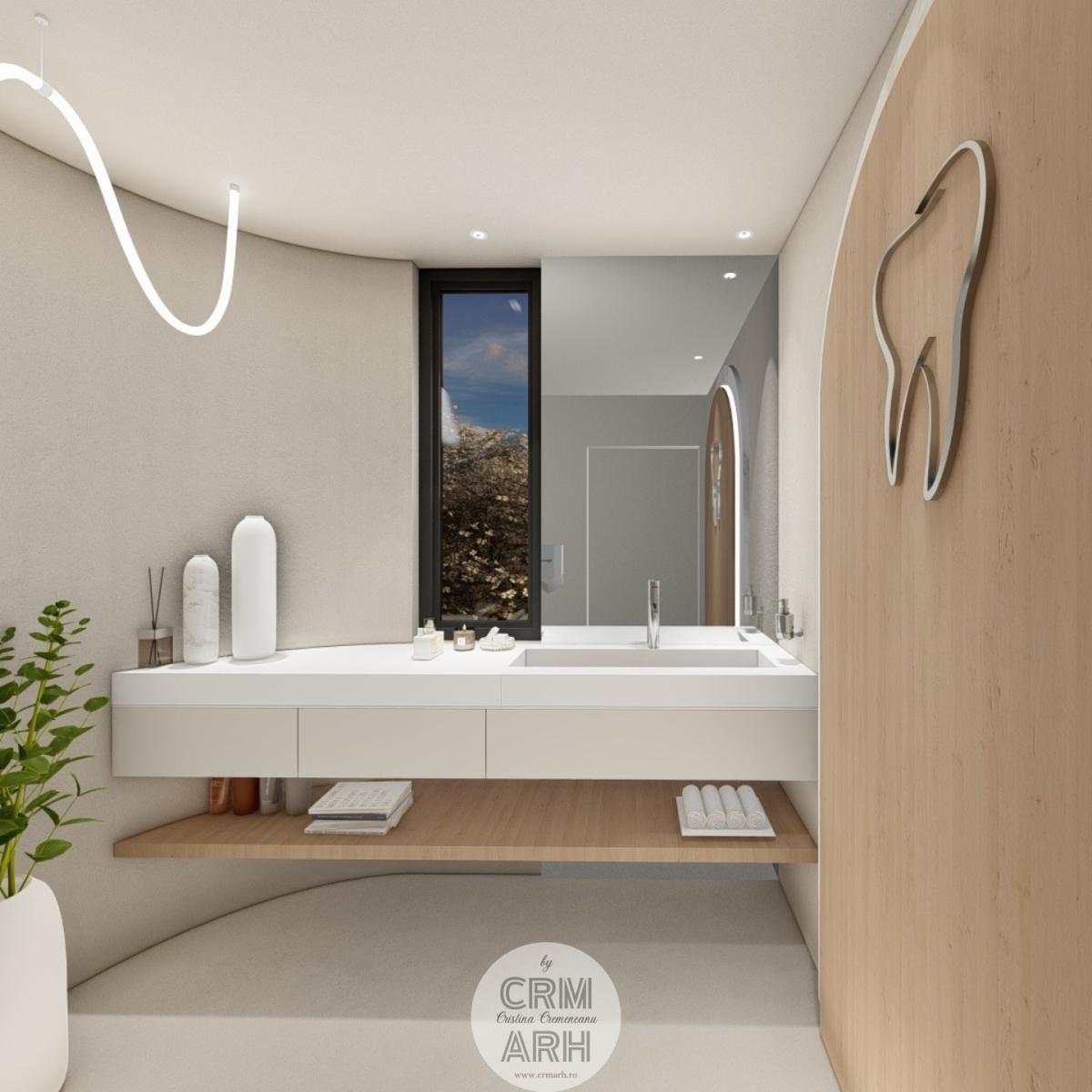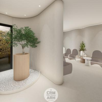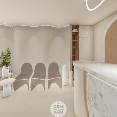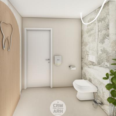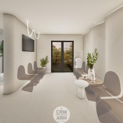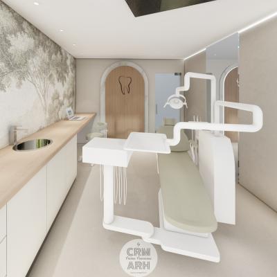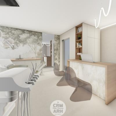 Clinica stomatologică este gândită în stil ultra modern minimalist, cu finisaje premium precum microcimentul aplicat pe pardoseală și pereți selectivi, mobilier medical cu linii drepte și suprafețe antibacteriene lucioase, dar și compartimentări din sticlă pentru transparență și lumină naturală. Recepția devine un punct de atracție prin desk-ul de microciment cu LED-uri încastrate, completat de un tapet cu texturi geometrice sau naturale și fotolii ergonomice în tonuri neutre. În cabinete și spațiile auxiliare, iluminatul joacă rol central: spoturi direcționate pentru zona de lucru, dar și profile LED ambientale ascunse în scafe sau mobilier, care creează o experiență relaxantă pentru pacienți. Grupurile sanitare și coridoarele urmează aceeași linie modernă, cu microciment, oglinzi cu iluminare LED și detalii metalice fine. Întregul concept îmbină minimalismul curat cu accente calde și detalii premium, rezultând o clinică sofisticată, funcțională și primitoare.