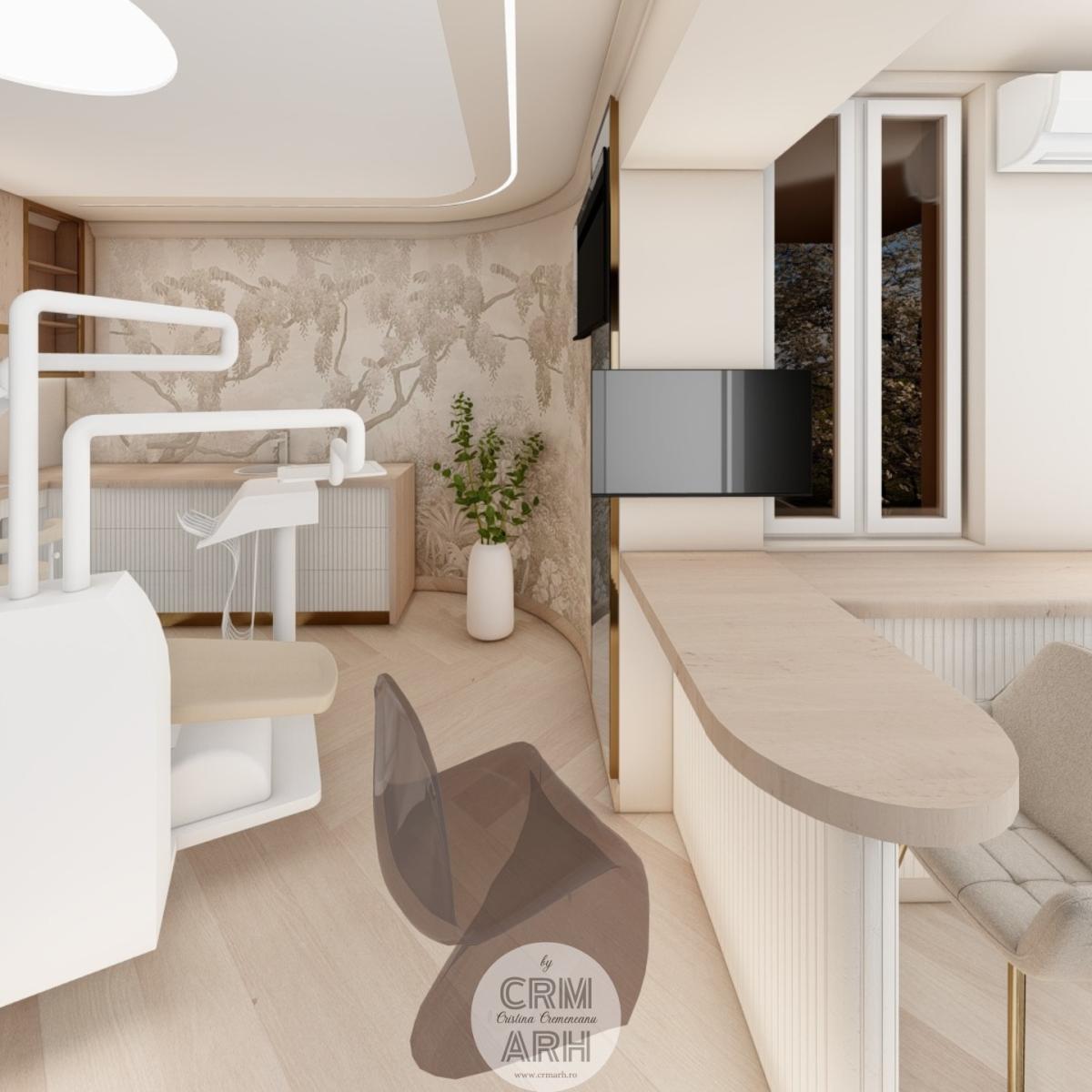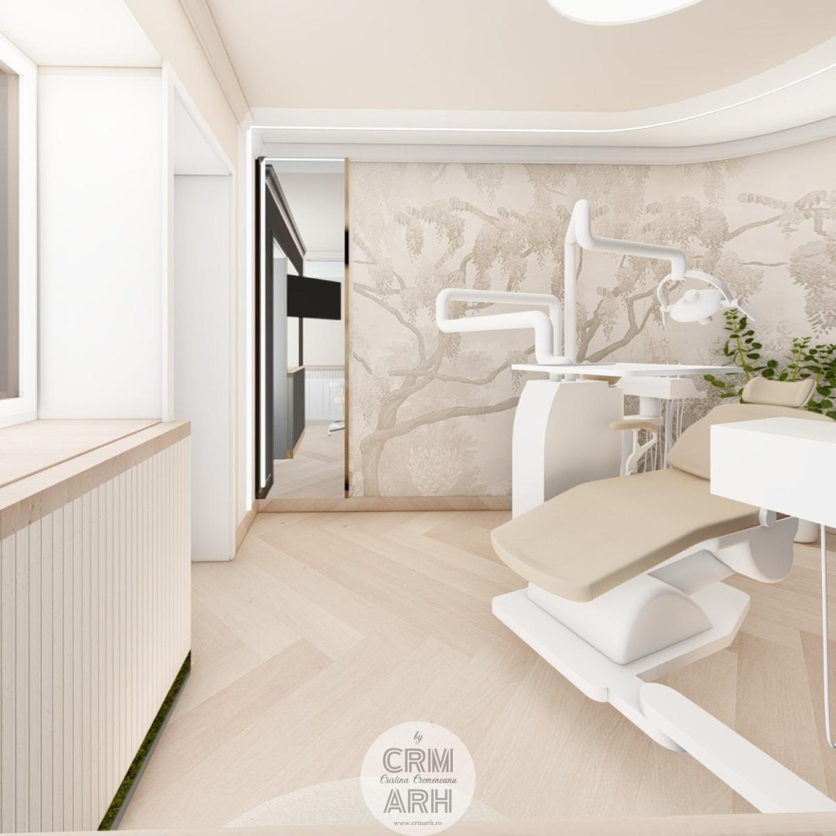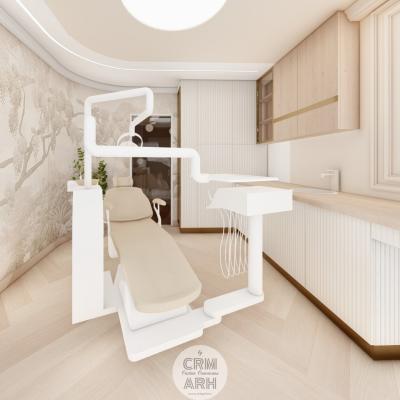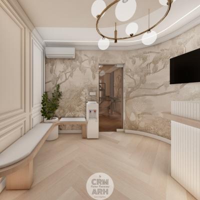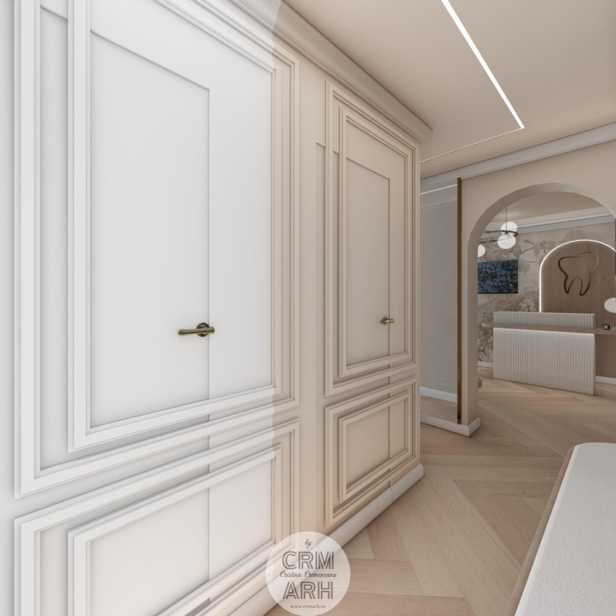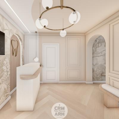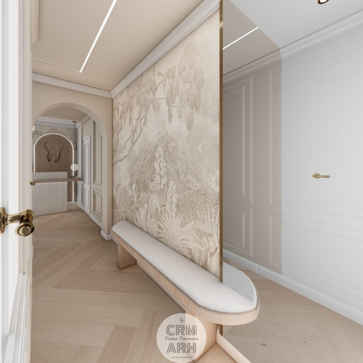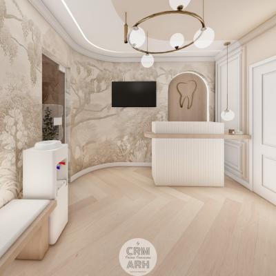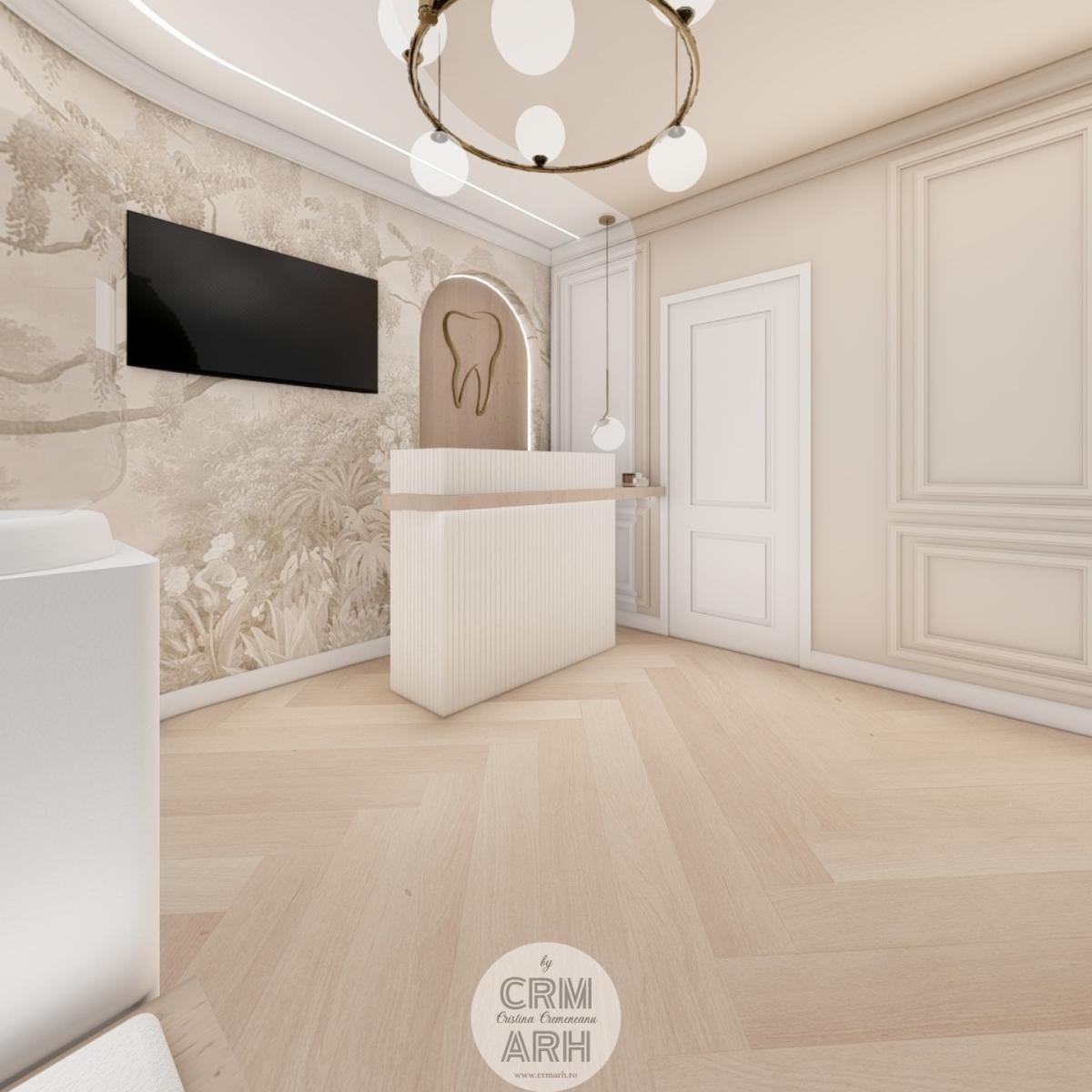 Amenajarea cabinetului stomatologic de lux este concepută într-un stil elegant și rafinat, cu o paletă cromatică dominată de alb și bej, menită să creeze o atmosferă calmă, luminoasă și primitoare. Tapetul personalizat devine elementul central de accent, adăugând personalitate și exclusivitate spațiului, în timp ce profilele decorative conturează pereții și oferă profunzime, reinterpretând subtil estetica clasică într-o cheie modernă. Accentele gold sunt integrate discret în detalii precum profile metalice, corpuri de iluminat sau elemente de mobilier, completând conceptul luxury fără a încărca vizual spațiul. Întregul design este gândit pentru a transmite profesionalism, confort și încredere, rezultând un cabinet stomatologic premium, cu o identitate vizuală elegantă și o experiență plăcută pentru pacienți.