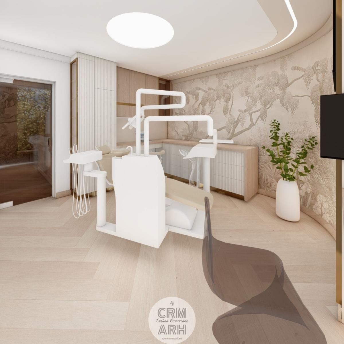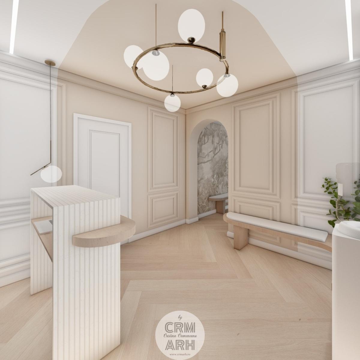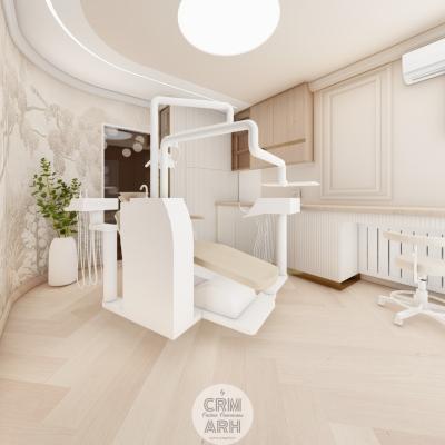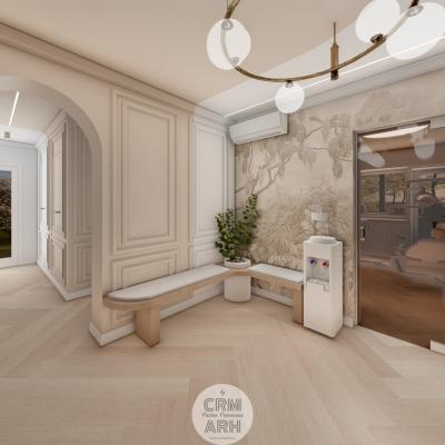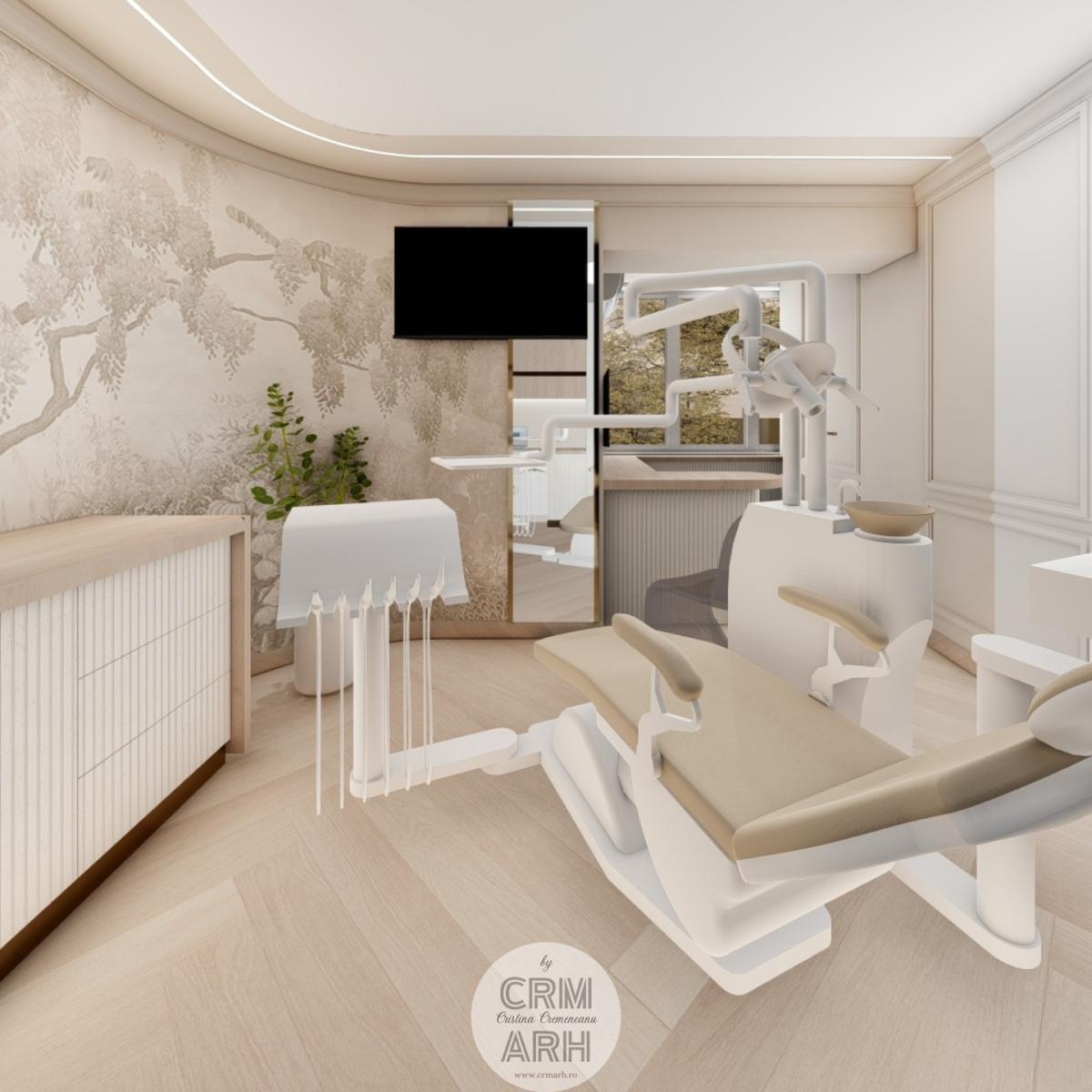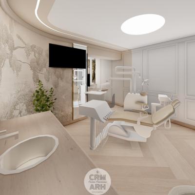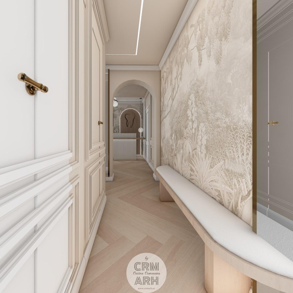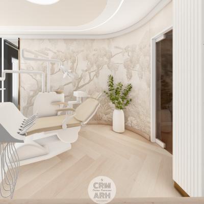 Amenajarea cabinetului stomatologic de lux este concepută într-un stil elegant și rafinat, cu o paletă cromatică dominată de alb și bej, menită să creeze o atmosferă calmă, luminoasă și primitoare. Tapetul personalizat devine elementul central de accent, adăugând personalitate și exclusivitate spațiului, în timp ce profilele decorative conturează pereții și oferă profunzime, reinterpretând subtil estetica clasică într-o cheie modernă. Accentele gold sunt integrate discret în detalii precum profile metalice, corpuri de iluminat sau elemente de mobilier, completând conceptul luxury fără a încărca vizual spațiul. Întregul design este gândit pentru a transmite profesionalism, confort și încredere, rezultând un cabinet stomatologic premium, cu o identitate vizuală elegantă și o experiență plăcută pentru pacienți.