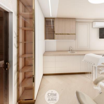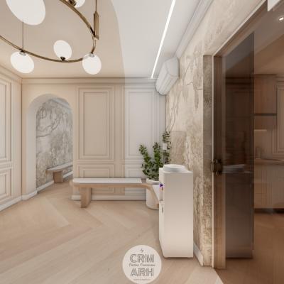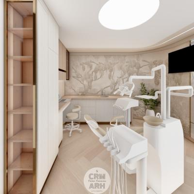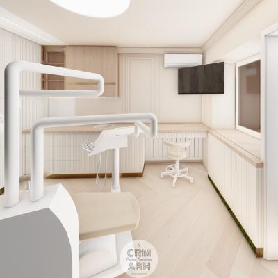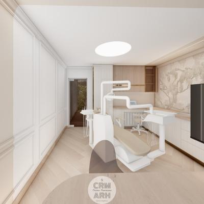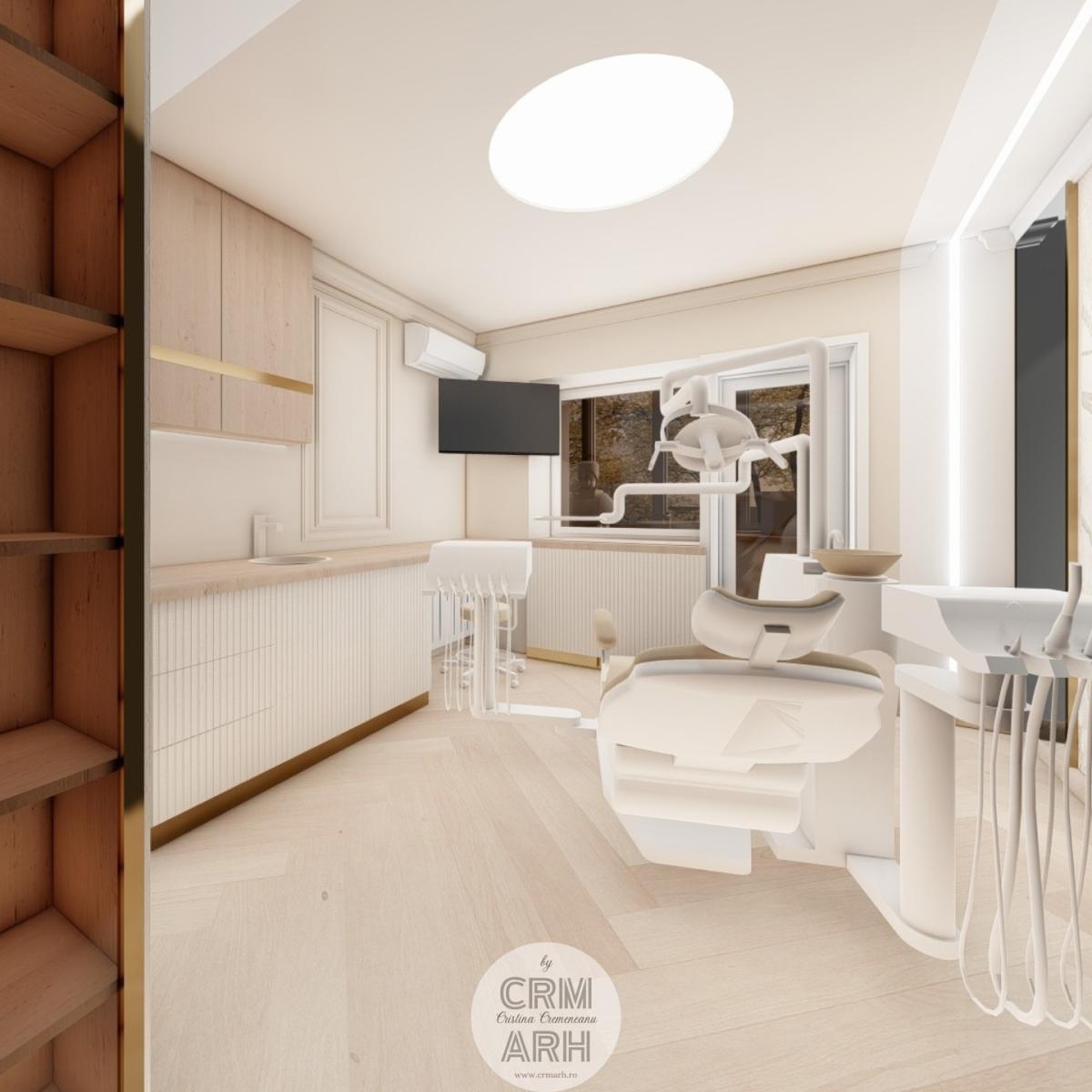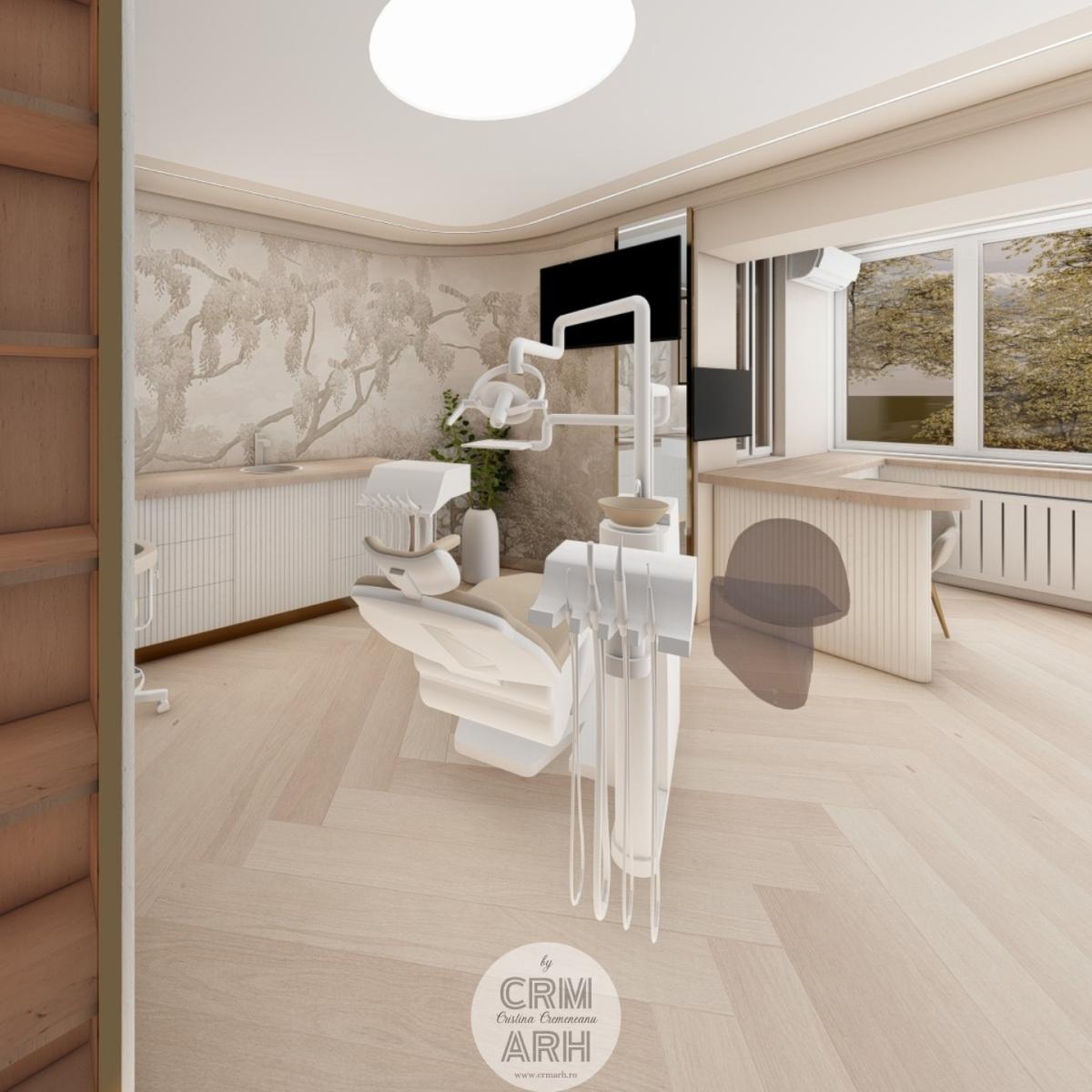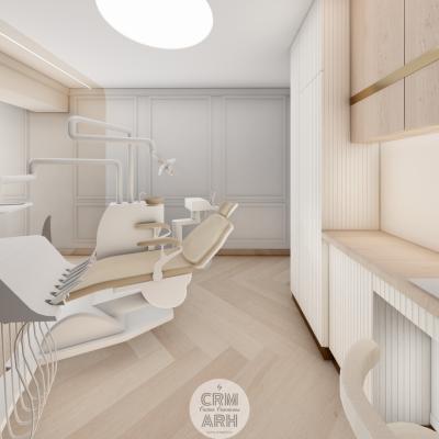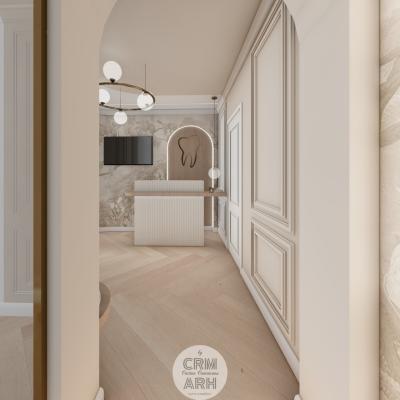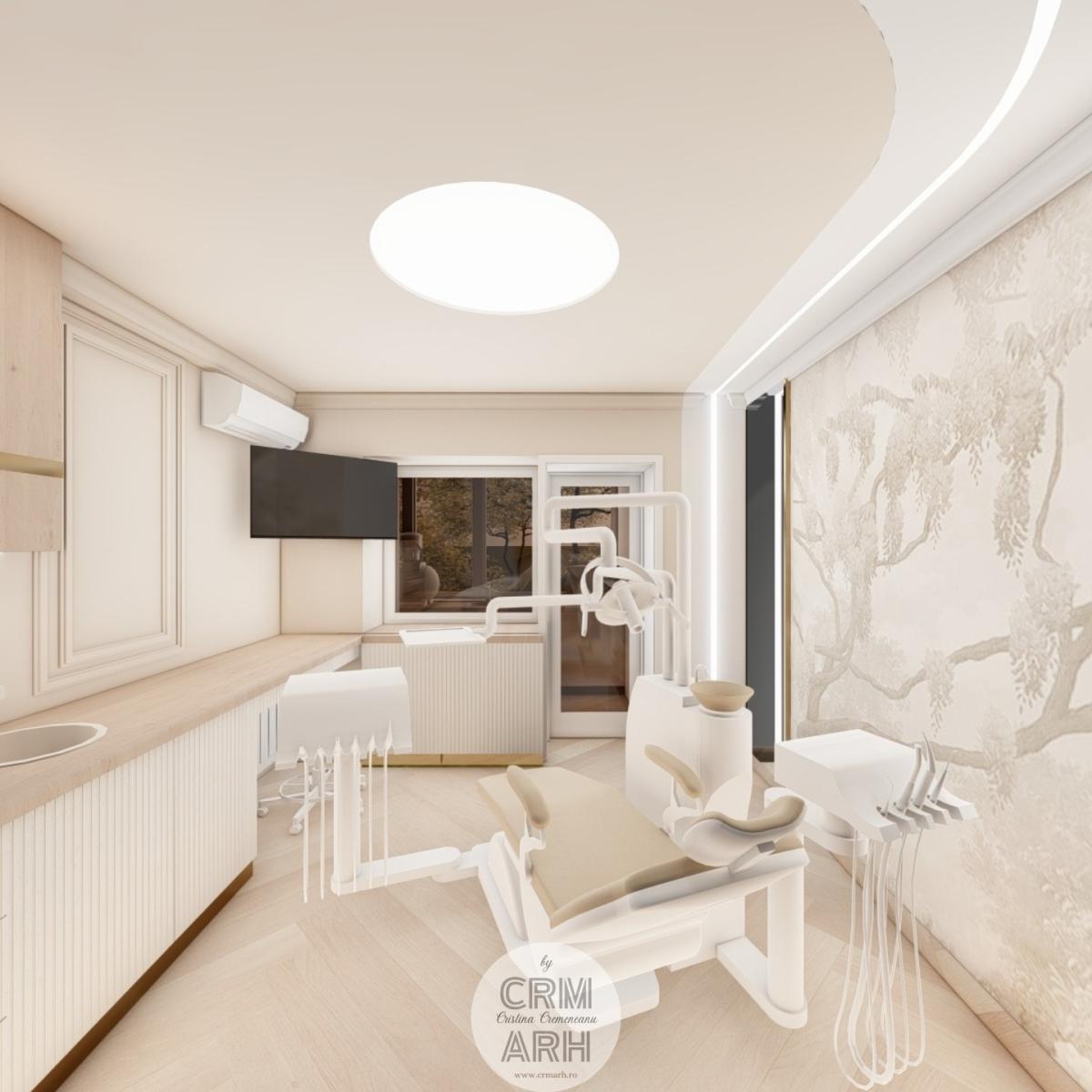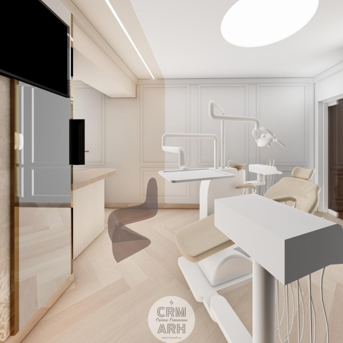 Amenajarea cabinetului stomatologic de lux este concepută într-un stil elegant și rafinat, cu o paletă cromatică dominată de alb și bej, menită să creeze o atmosferă calmă, luminoasă și primitoare. Tapetul personalizat devine elementul central de accent, adăugând personalitate și exclusivitate spațiului, în timp ce profilele decorative conturează pereții și oferă profunzime, reinterpretând subtil estetica clasică într-o cheie modernă. Accentele gold sunt integrate discret în detalii precum profile metalice, corpuri de iluminat sau elemente de mobilier, completând conceptul luxury fără a încărca vizual spațiul. Întregul design este gândit pentru a transmite profesionalism, confort și încredere, rezultând un cabinet stomatologic premium, cu o identitate vizuală elegantă și o experiență plăcută pentru pacienți.