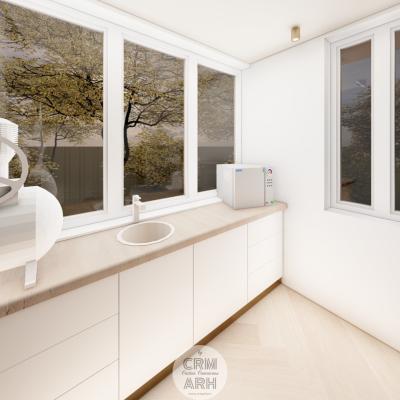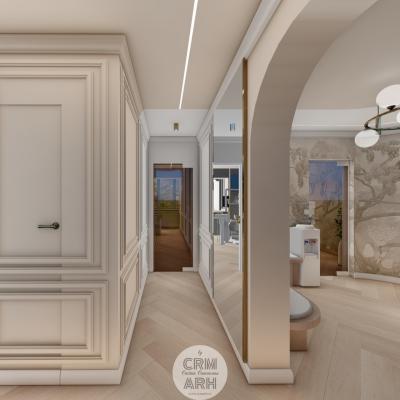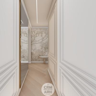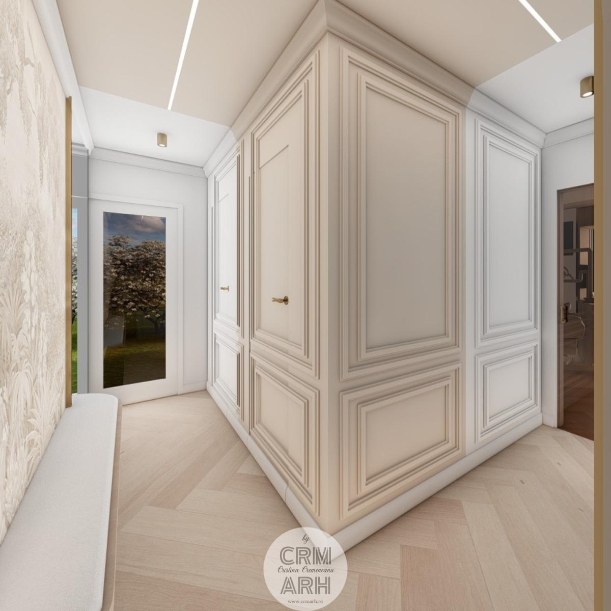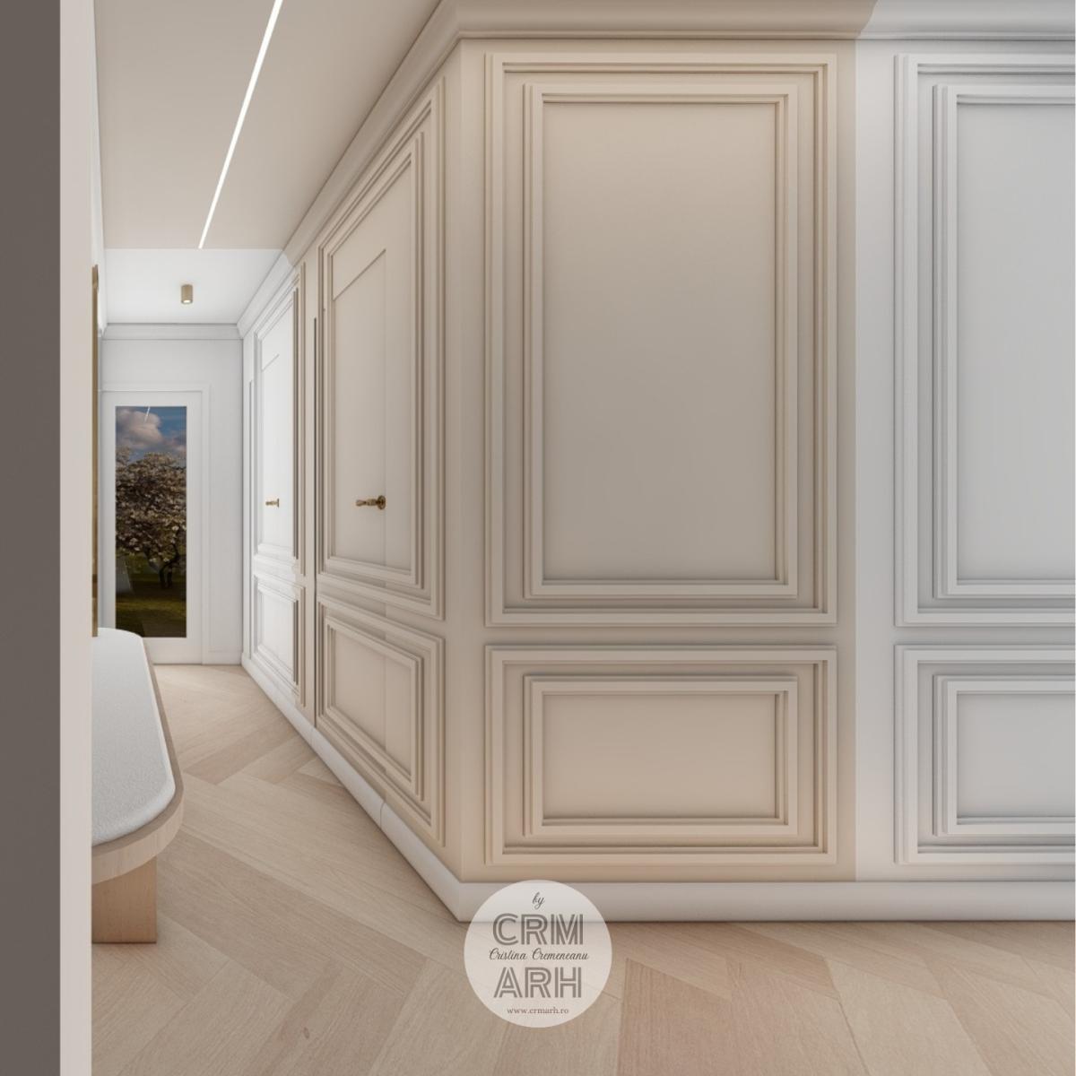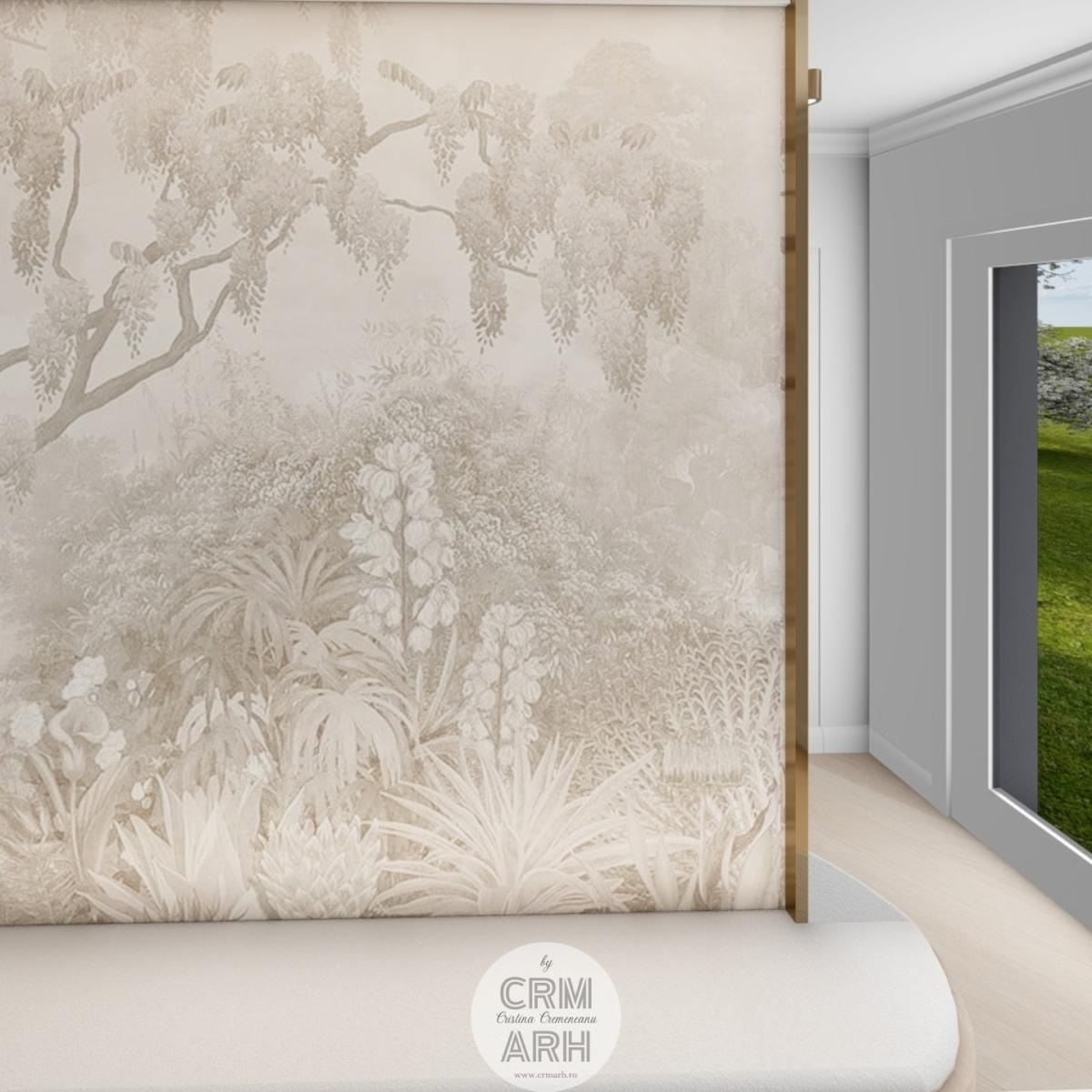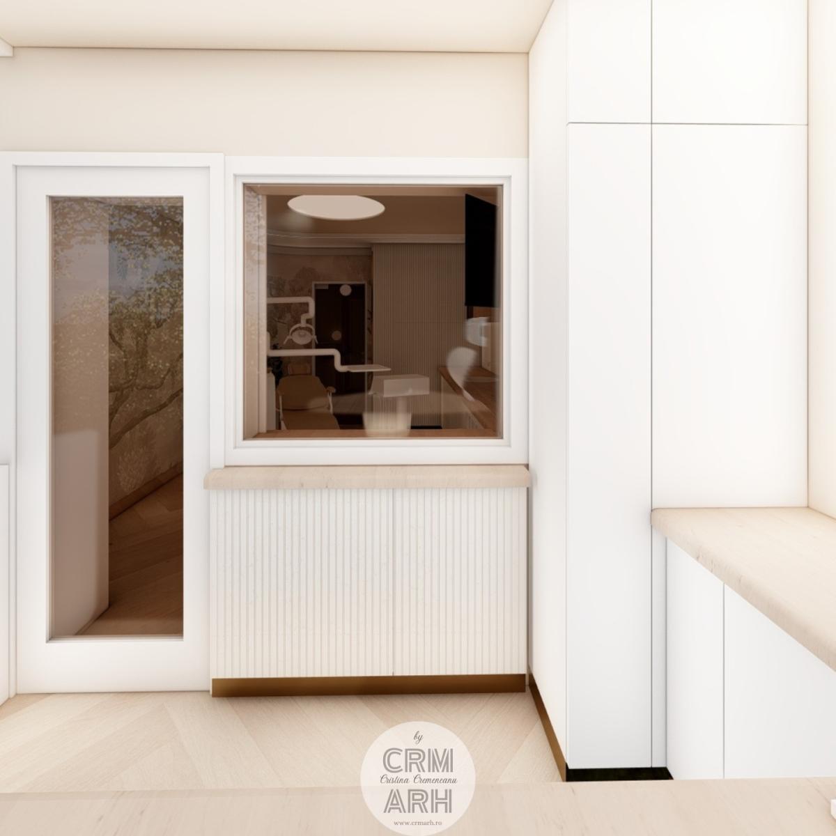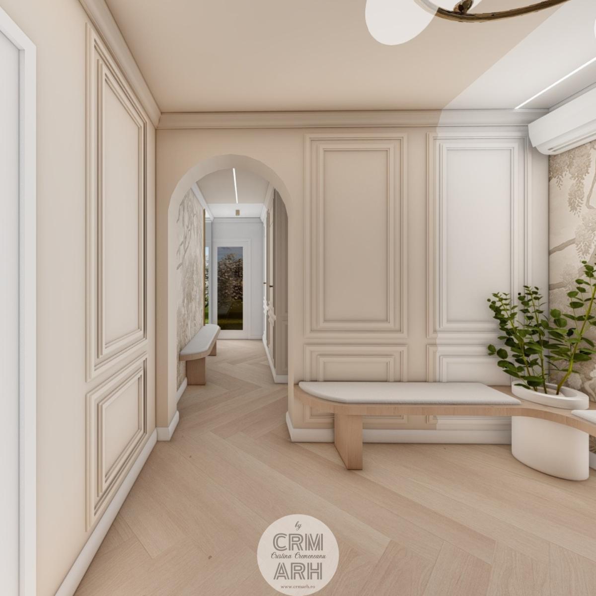Amenajarea cabinetului stomatologic de lux este concepută într-un stil elegant și rafinat, cu o paletă cromatică dominată de alb și bej, menită să creeze o atmosferă calmă, luminoasă și primitoare. Tapetul personalizat devine elementul central de accent, adăugând personalitate și exclusivitate spațiului, în timp ce profilele decorative conturează pereții și oferă profunzime, reinterpretând subtil estetica clasică într-o cheie modernă. Accentele gold sunt integrate discret în detalii precum profile metalice, corpuri de iluminat sau elemente de mobilier, completând conceptul luxury fără a încărca vizual spațiul. Întregul design este gândit pentru a transmite profesionalism, confort și încredere, rezultând un cabinet stomatologic premium, cu o identitate vizuală elegantă și o experiență plăcută pentru pacienți.