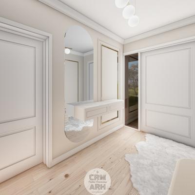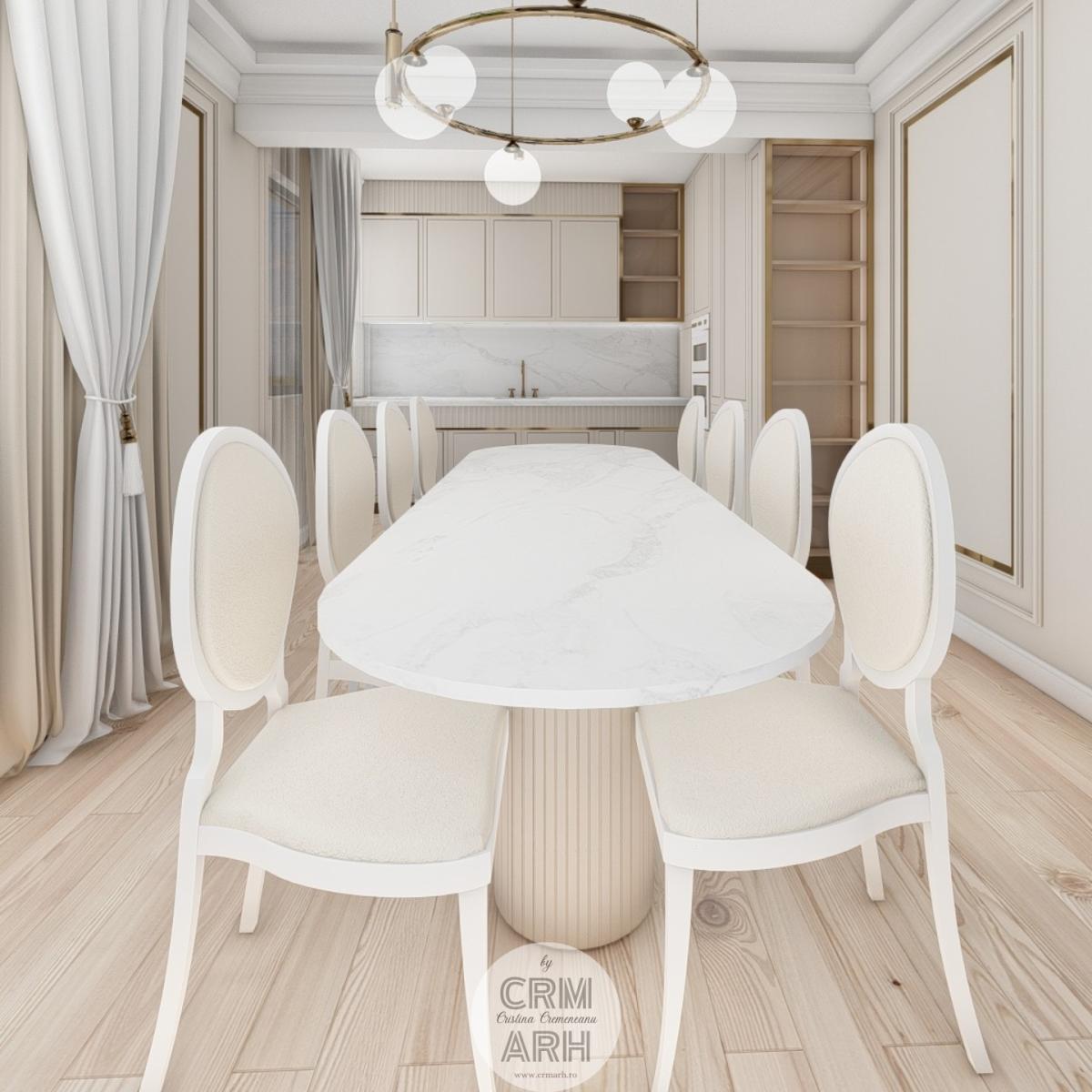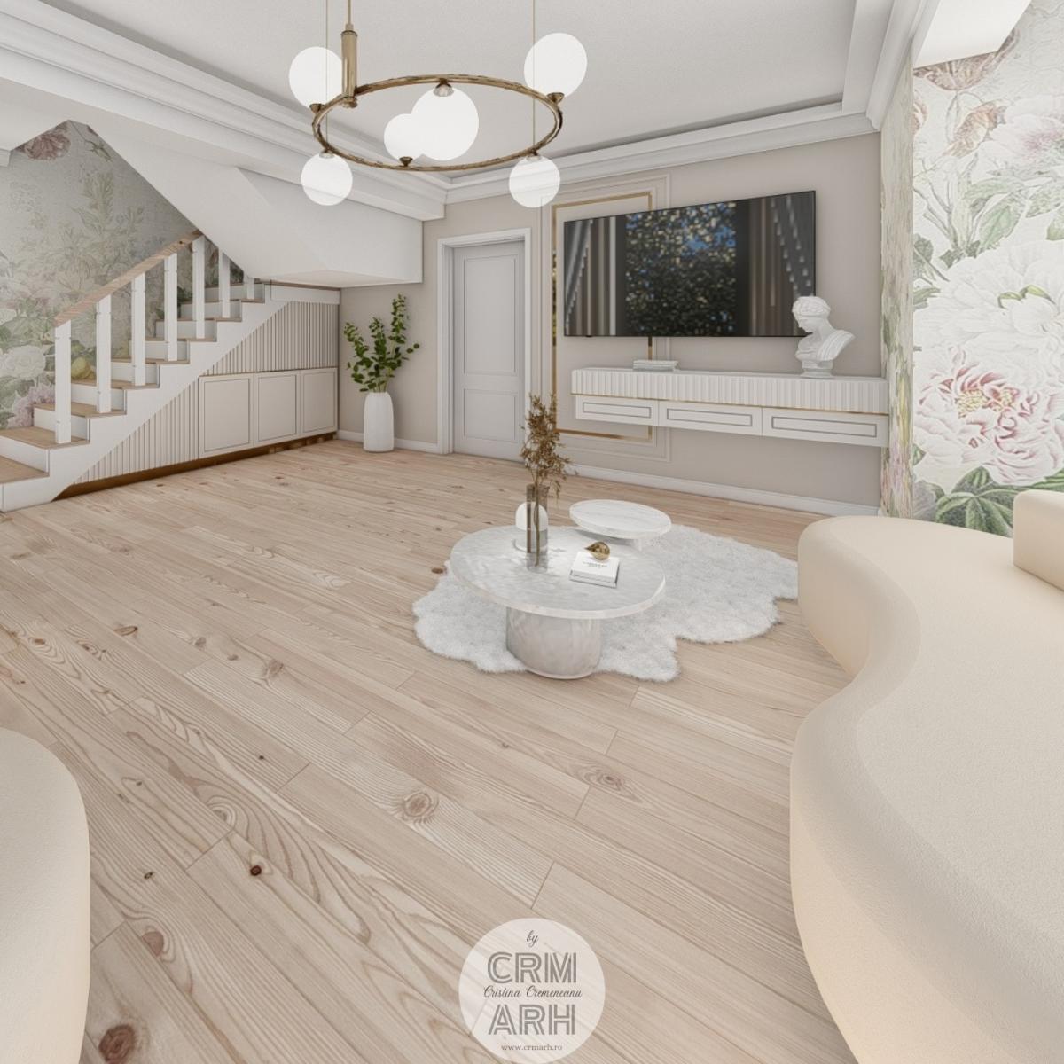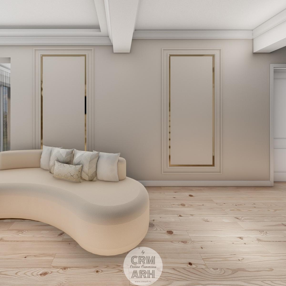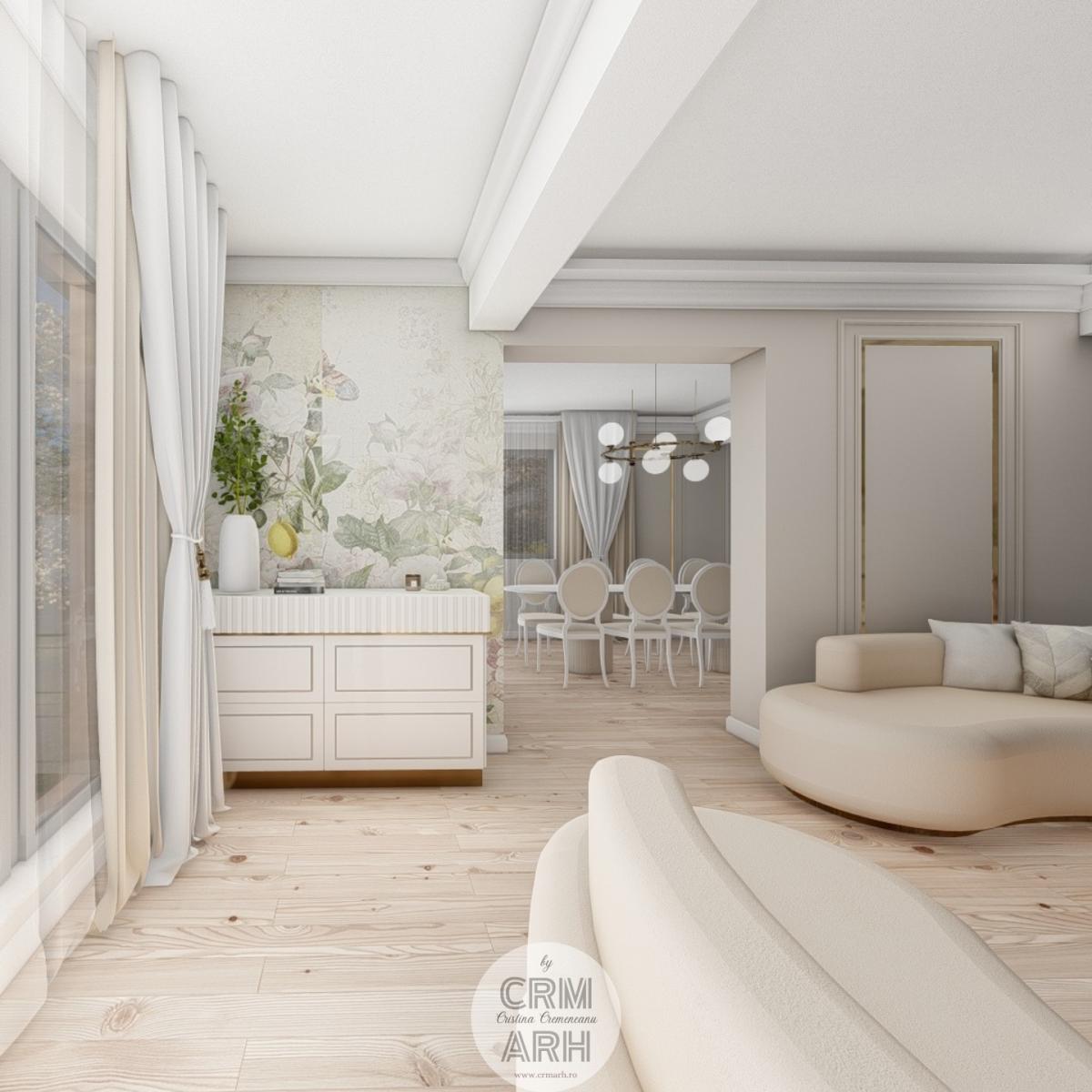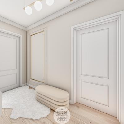 Locuința în stil neoclasic elegant se bazează pe linii simetrice, profile decorative fine, tapet texturat discret și o paletă calmă în tonuri de crem, grej și alb cald. Accentele gold satinat se regăsesc în corpurile de iluminat, mânere, rame și detalii ale mobilierului, aducând senzația de lux fără a încărca spațiul. Tapetul damask modern sau cu relief subtil, cornisele și medalionul pentru lustră completează estetica rafinată. Mobilierul din MDF vopsit mat, cu frezări clasice și rame elegante, definește livingul, bucătăria și dormitorul. Combinat cu textile premium (catifea, draperii grele, covoare moi) și oglinzi cu rame gold, rezultatul este o amenajare coerentă, luminoasă și sofisticată. Continuarea aceleiași scheme cromatice și a acelorași profile în toată casa creează unitate vizuală și un aer modern-neoclasic de înaltă clasă.