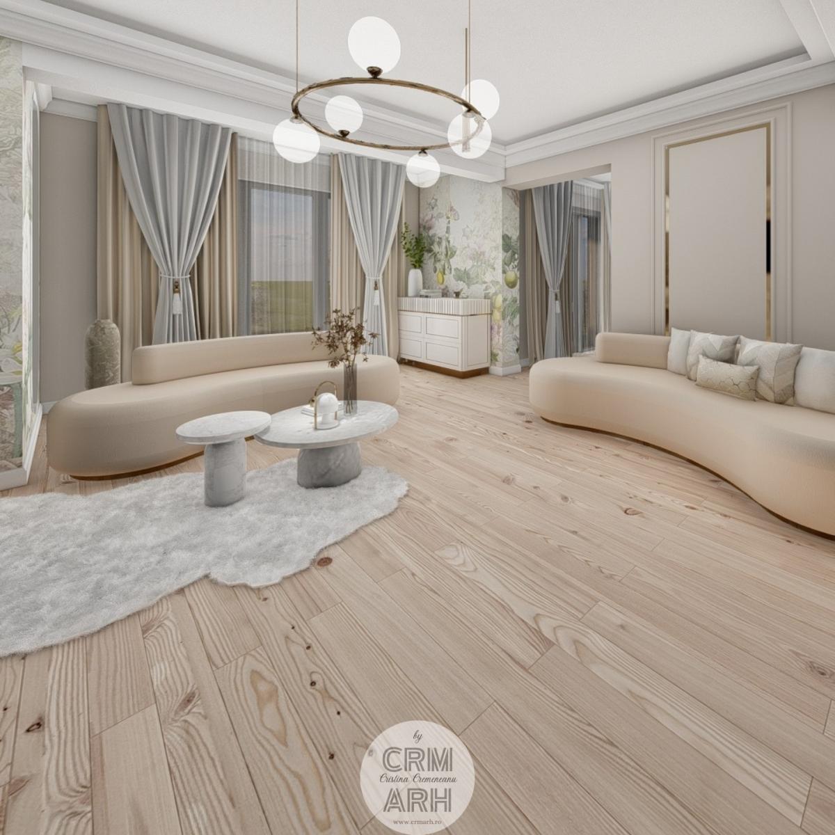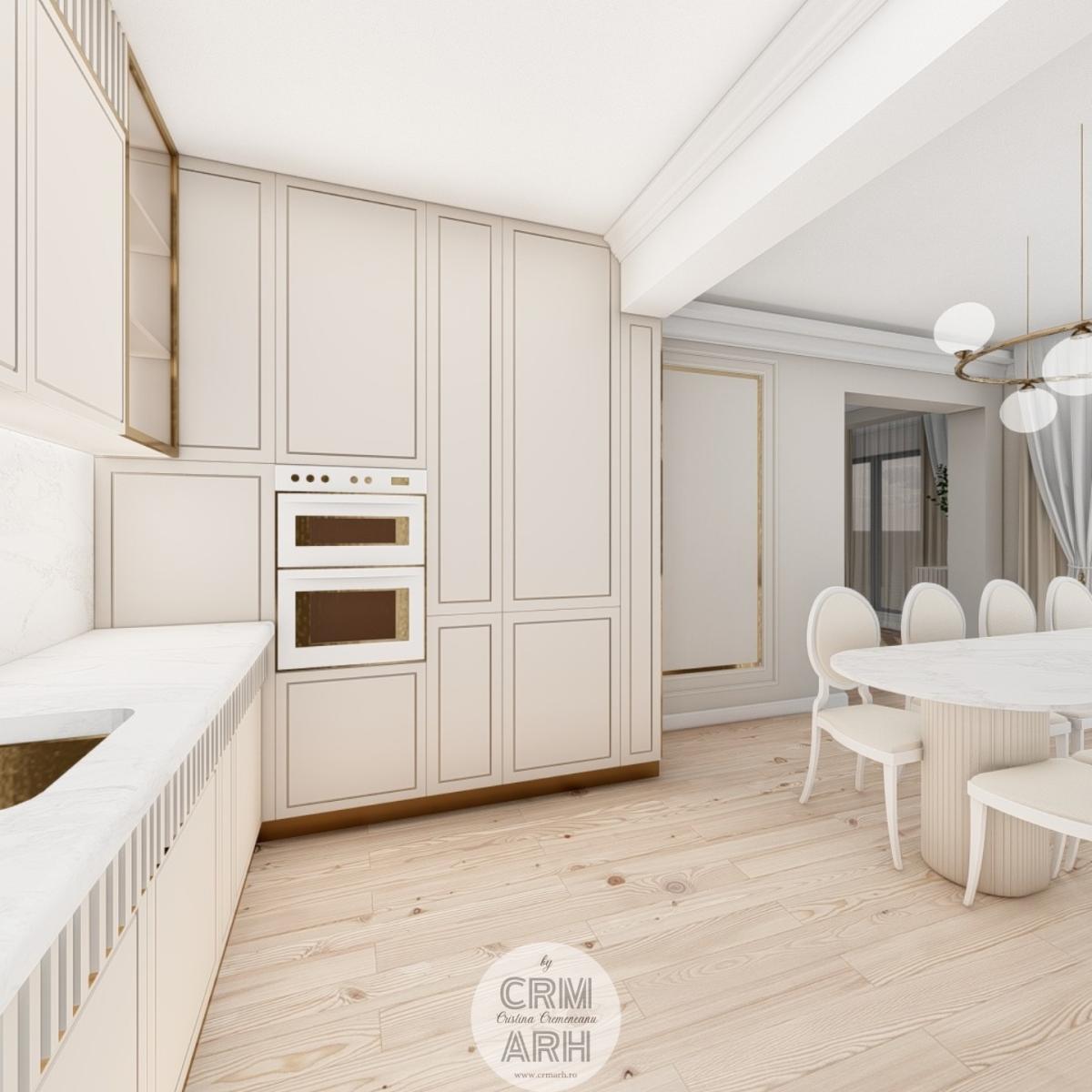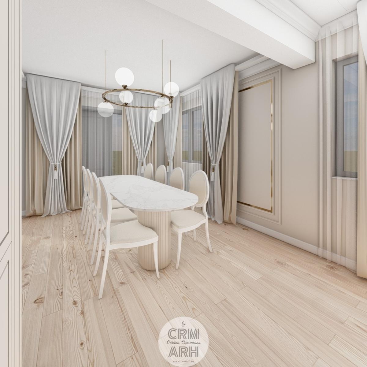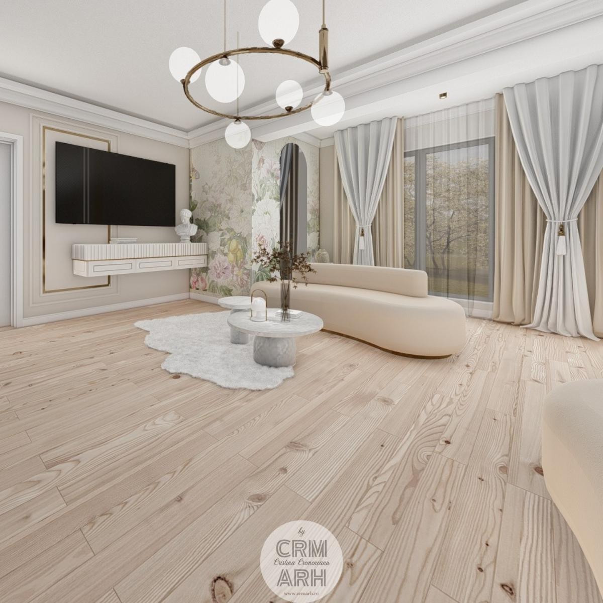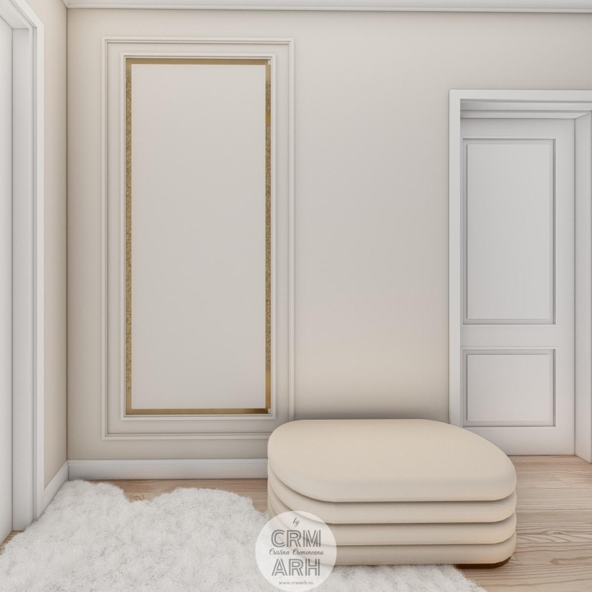 Locuința în stil neoclasic elegant se bazează pe linii simetrice, profile decorative fine, tapet texturat discret și o paletă calmă în tonuri de crem, grej și alb cald. Accentele gold satinat se regăsesc în corpurile de iluminat, mânere, rame și detalii ale mobilierului, aducând senzația de lux fără a încărca spațiul. Tapetul damask modern sau cu relief subtil, cornisele și medalionul pentru lustră completează estetica rafinată. Mobilierul din MDF vopsit mat, cu frezări clasice și rame elegante, definește livingul, bucătăria și dormitorul. Combinat cu textile premium (catifea, draperii grele, covoare moi) și oglinzi cu rame gold, rezultatul este o amenajare coerentă, luminoasă și sofisticată. Continuarea aceleiași scheme cromatice și a acelorași profile în toată casa creează unitate vizuală și un aer modern-neoclasic de înaltă clasă.