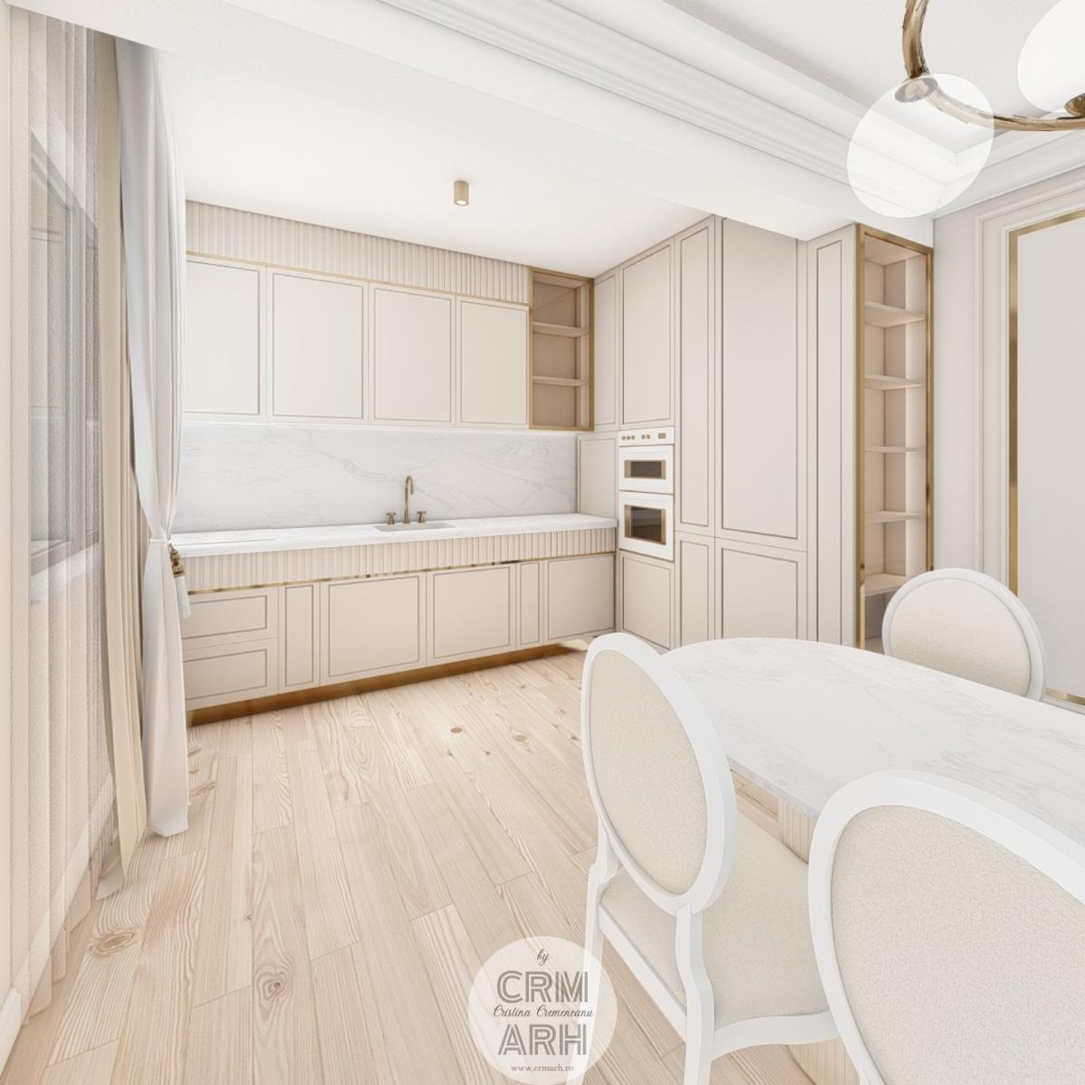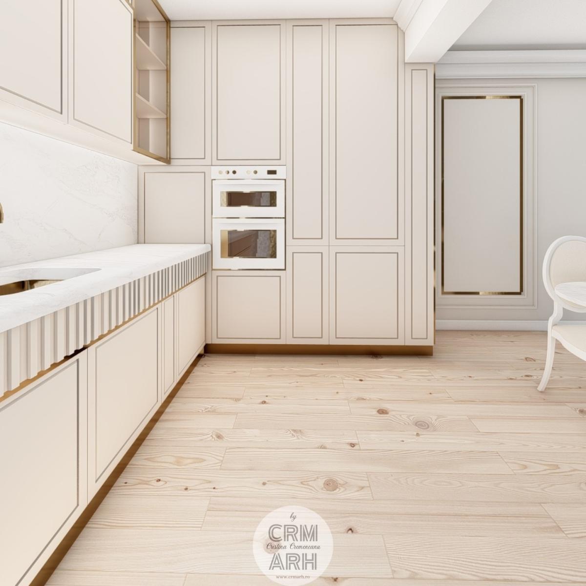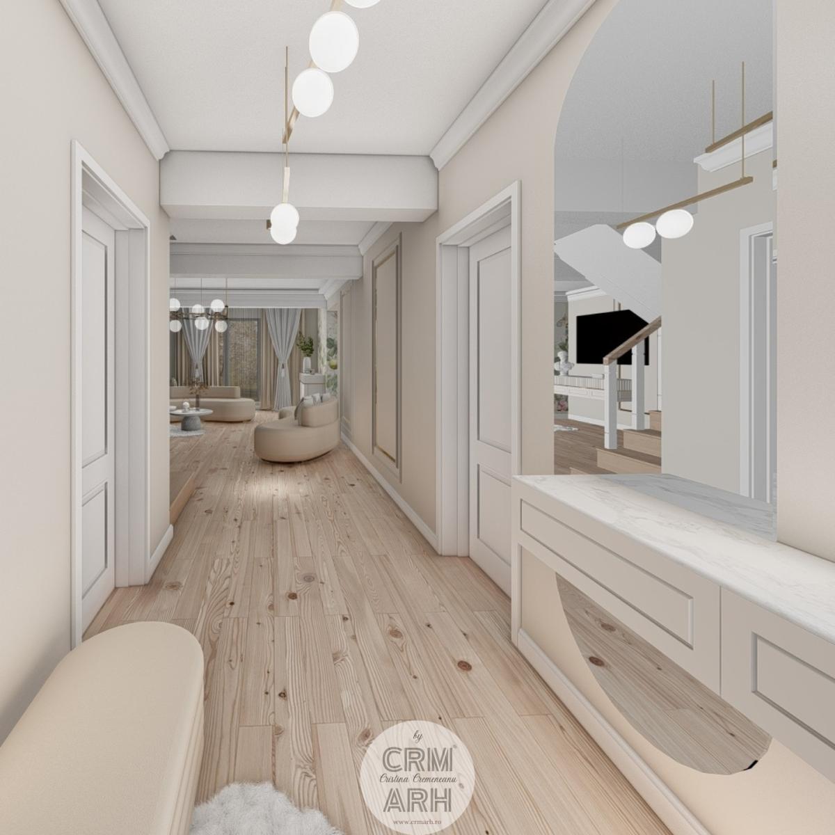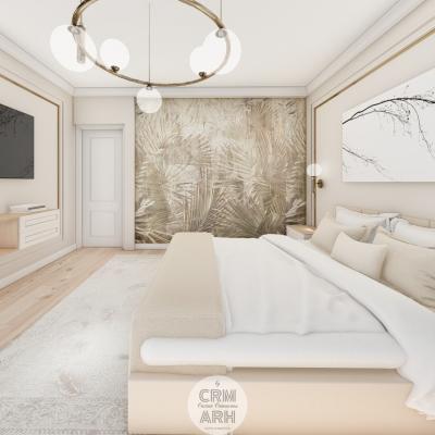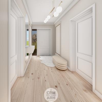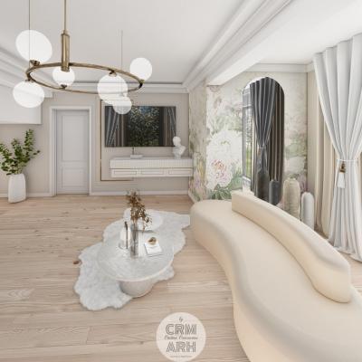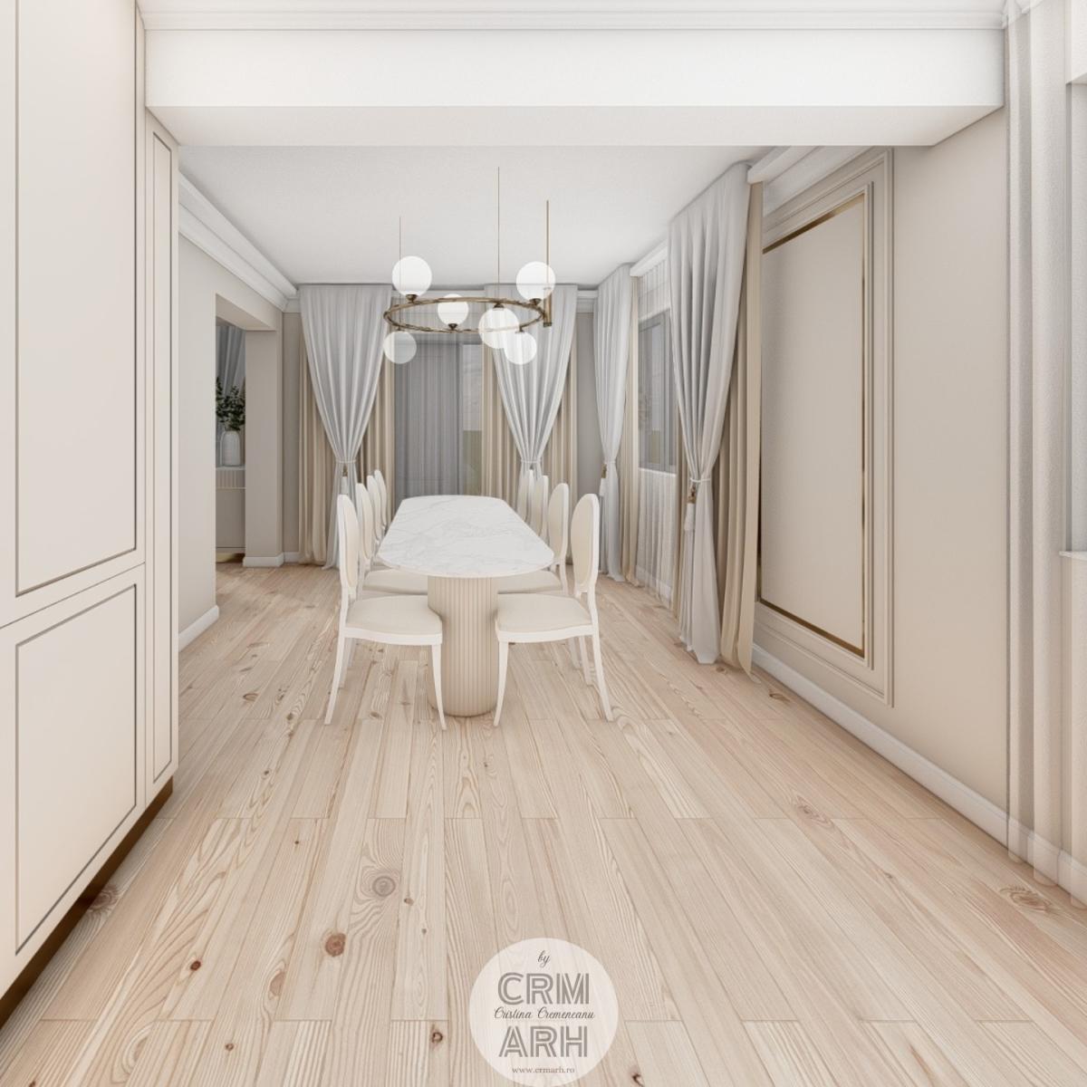 Locuința în stil neoclasic elegant se bazează pe linii simetrice, profile decorative fine, tapet texturat discret și o paletă calmă în tonuri de crem, grej și alb cald. Accentele gold satinat se regăsesc în corpurile de iluminat, mânere, rame și detalii ale mobilierului, aducând senzația de lux fără a încărca spațiul. Tapetul damask modern sau cu relief subtil, cornisele și medalionul pentru lustră completează estetica rafinată. Mobilierul din MDF vopsit mat, cu frezări clasice și rame elegante, definește livingul, bucătăria și dormitorul. Combinat cu textile premium (catifea, draperii grele, covoare moi) și oglinzi cu rame gold, rezultatul este o amenajare coerentă, luminoasă și sofisticată. Continuarea aceleiași scheme cromatice și a acelorași profile în toată casa creează unitate vizuală și un aer modern-neoclasic de înaltă clasă.