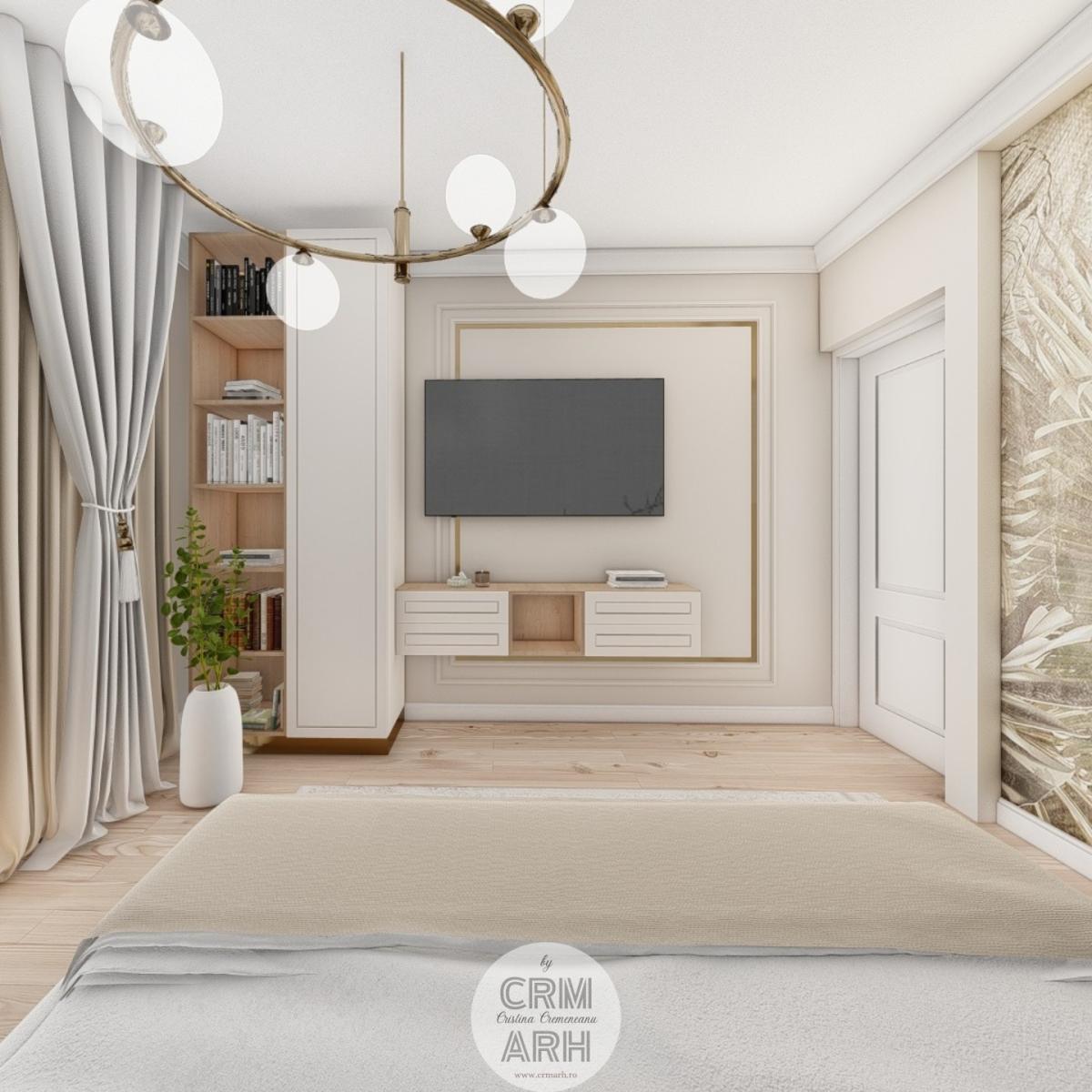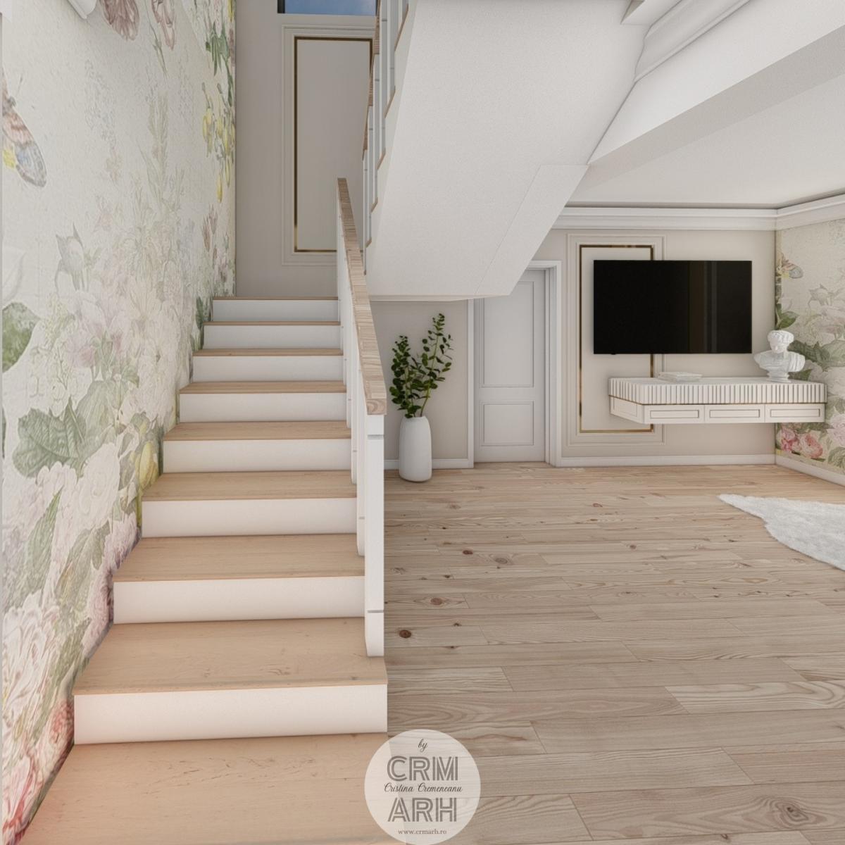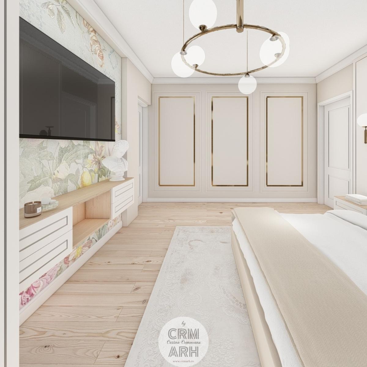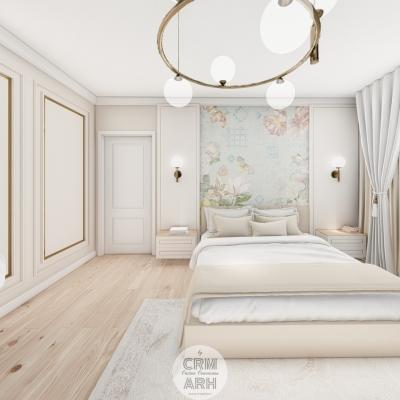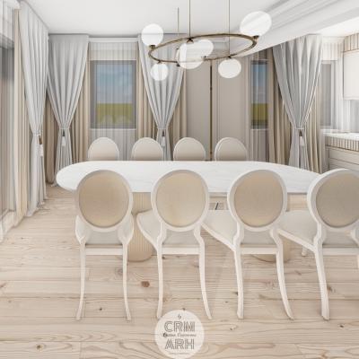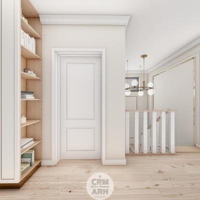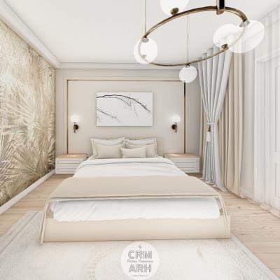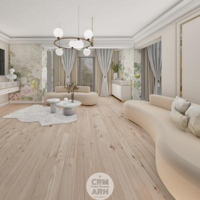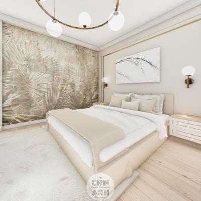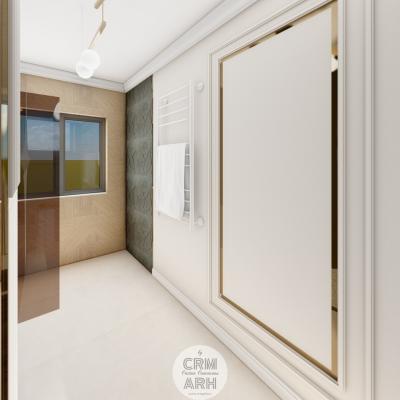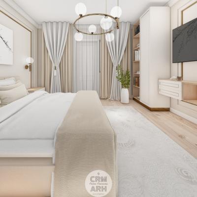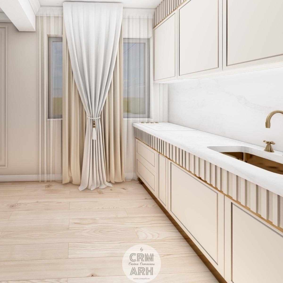 Locuința în stil neoclasic elegant se bazează pe linii simetrice, profile decorative fine, tapet texturat discret și o paletă calmă în tonuri de crem, grej și alb cald. Accentele gold satinat se regăsesc în corpurile de iluminat, mânere, rame și detalii ale mobilierului, aducând senzația de lux fără a încărca spațiul. Tapetul damask modern sau cu relief subtil, cornisele și medalionul pentru lustră completează estetica rafinată. Mobilierul din MDF vopsit mat, cu frezări clasice și rame elegante, definește livingul, bucătăria și dormitorul. Combinat cu textile premium (catifea, draperii grele, covoare moi) și oglinzi cu rame gold, rezultatul este o amenajare coerentă, luminoasă și sofisticată. Continuarea aceleiași scheme cromatice și a acelorași profile în toată casa creează unitate vizuală și un aer modern-neoclasic de înaltă clasă.