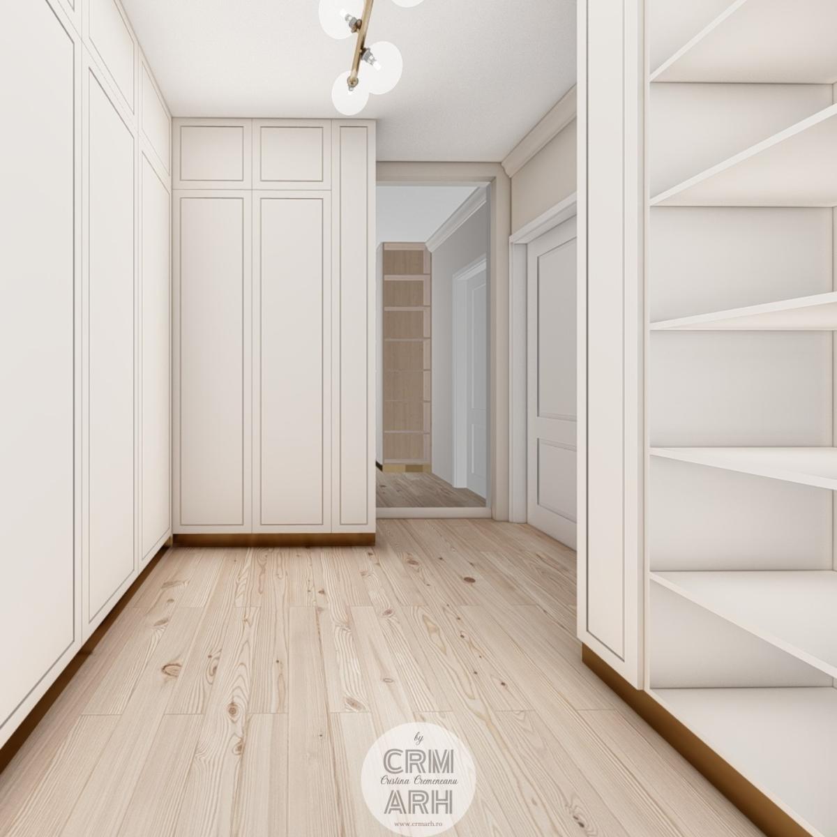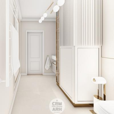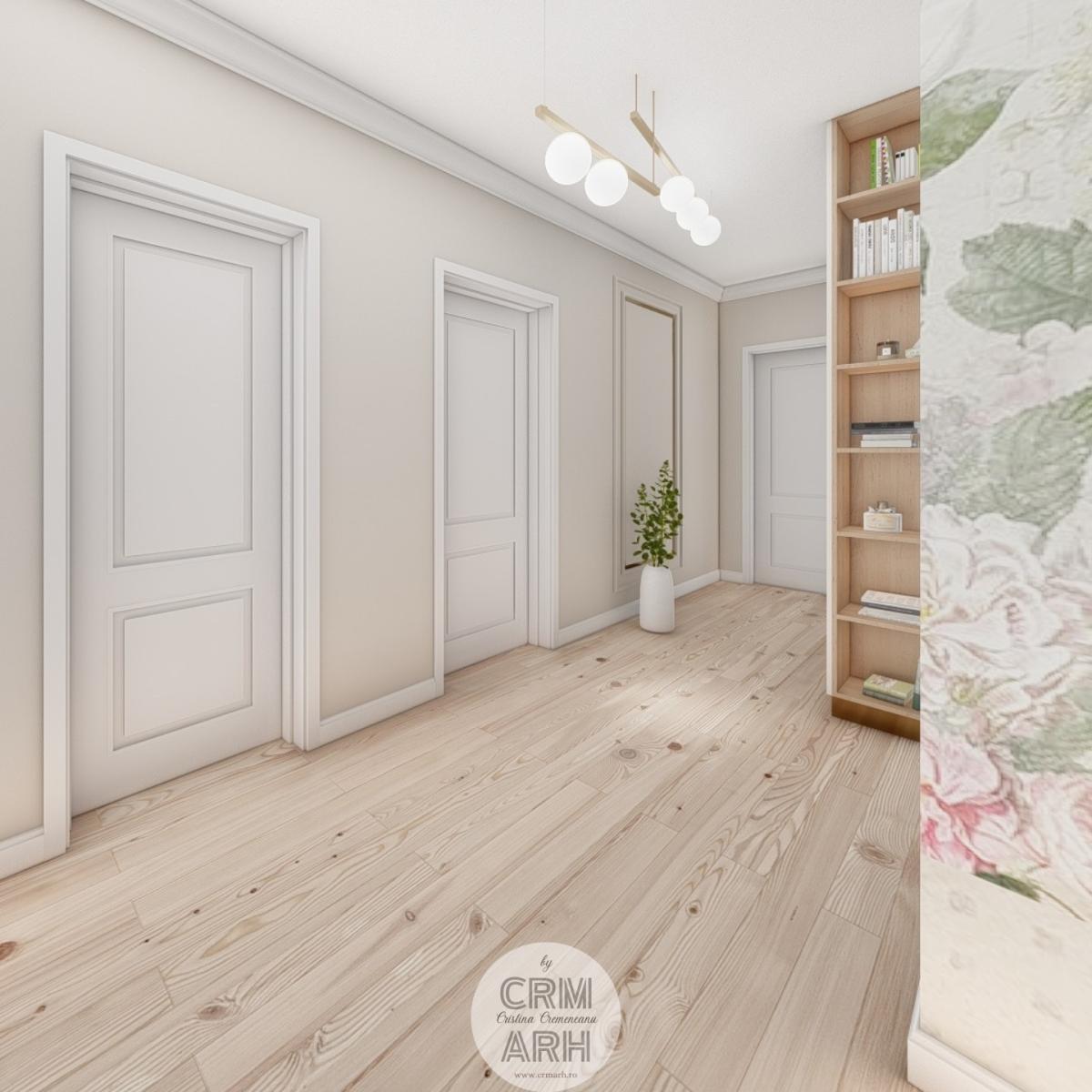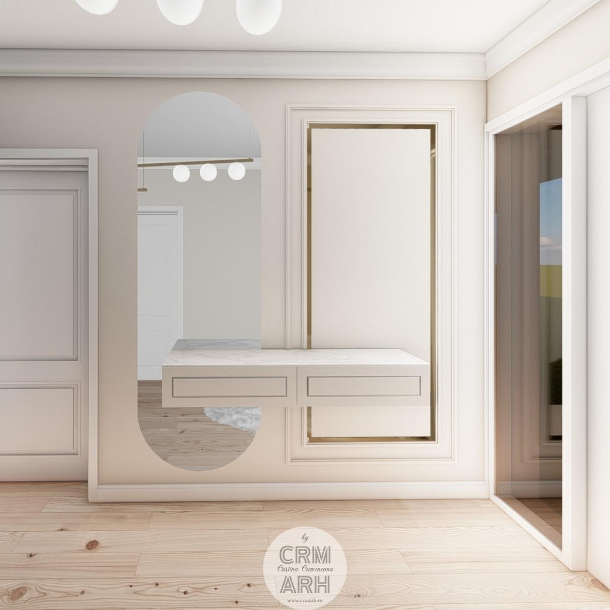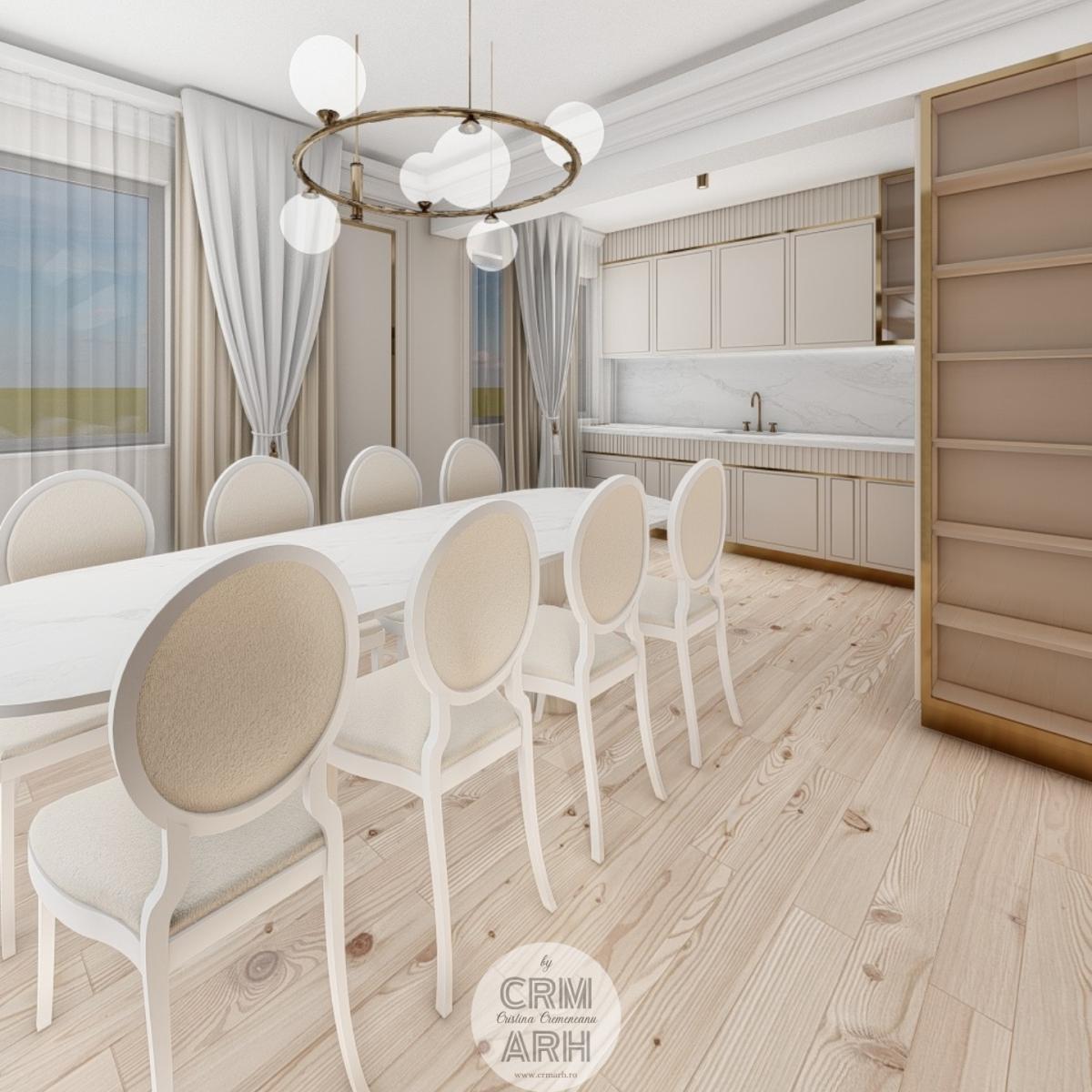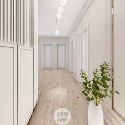 Locuința în stil neoclasic elegant se bazează pe linii simetrice, profile decorative fine, tapet texturat discret și o paletă calmă în tonuri de crem, grej și alb cald. Accentele gold satinat se regăsesc în corpurile de iluminat, mânere, rame și detalii ale mobilierului, aducând senzația de lux fără a încărca spațiul. Tapetul damask modern sau cu relief subtil, cornisele și medalionul pentru lustră completează estetica rafinată. Mobilierul din MDF vopsit mat, cu frezări clasice și rame elegante, definește livingul, bucătăria și dormitorul. Combinat cu textile premium (catifea, draperii grele, covoare moi) și oglinzi cu rame gold, rezultatul este o amenajare coerentă, luminoasă și sofisticată. Continuarea aceleiași scheme cromatice și a acelorași profile în toată casa creează unitate vizuală și un aer modern-neoclasic de înaltă clasă.