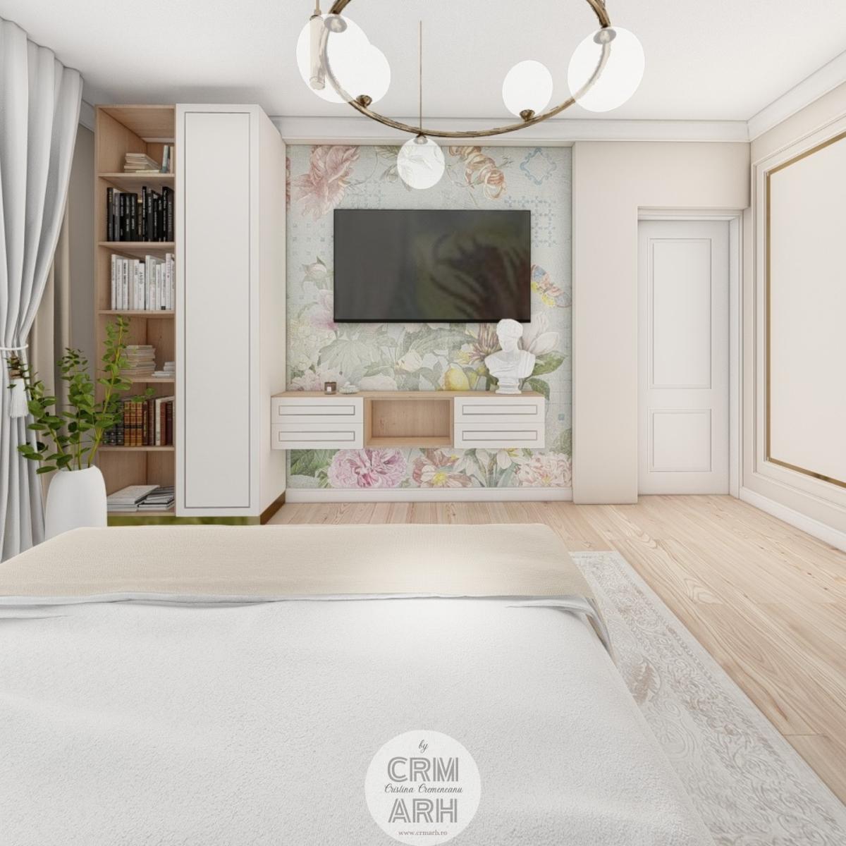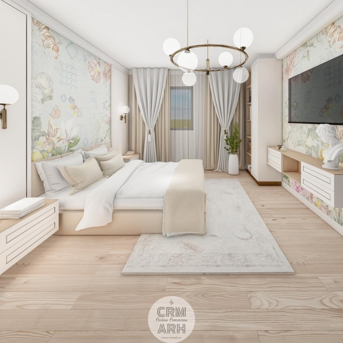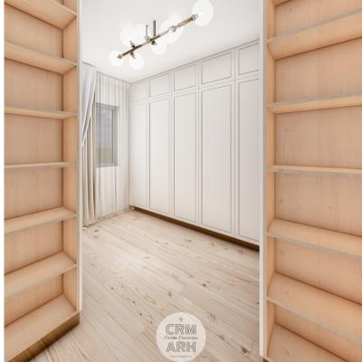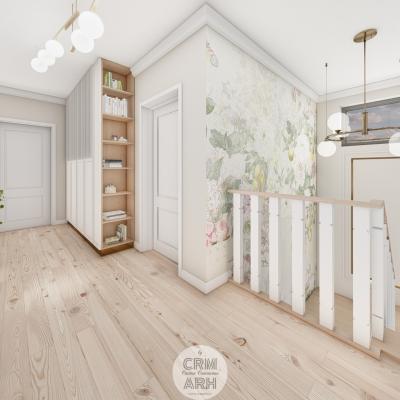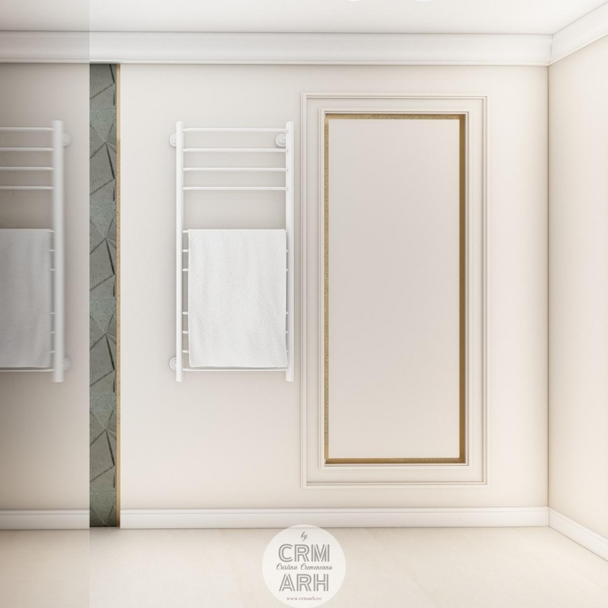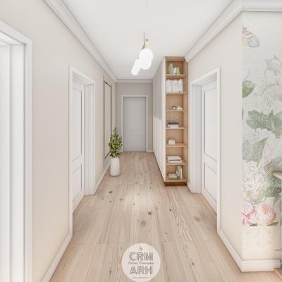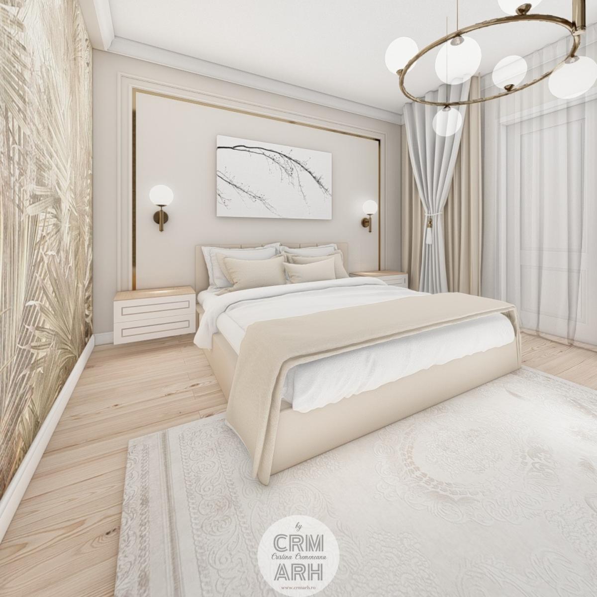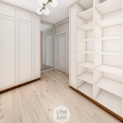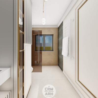 Locuința în stil neoclasic elegant se bazează pe linii simetrice, profile decorative fine, tapet texturat discret și o paletă calmă în tonuri de crem, grej și alb cald. Accentele gold satinat se regăsesc în corpurile de iluminat, mânere, rame și detalii ale mobilierului, aducând senzația de lux fără a încărca spațiul. Tapetul damask modern sau cu relief subtil, cornisele și medalionul pentru lustră completează estetica rafinată. Mobilierul din MDF vopsit mat, cu frezări clasice și rame elegante, definește livingul, bucătăria și dormitorul. Combinat cu textile premium (catifea, draperii grele, covoare moi) și oglinzi cu rame gold, rezultatul este o amenajare coerentă, luminoasă și sofisticată. Continuarea aceleiași scheme cromatice și a acelorași profile în toată casa creează unitate vizuală și un aer modern-neoclasic de înaltă clasă.