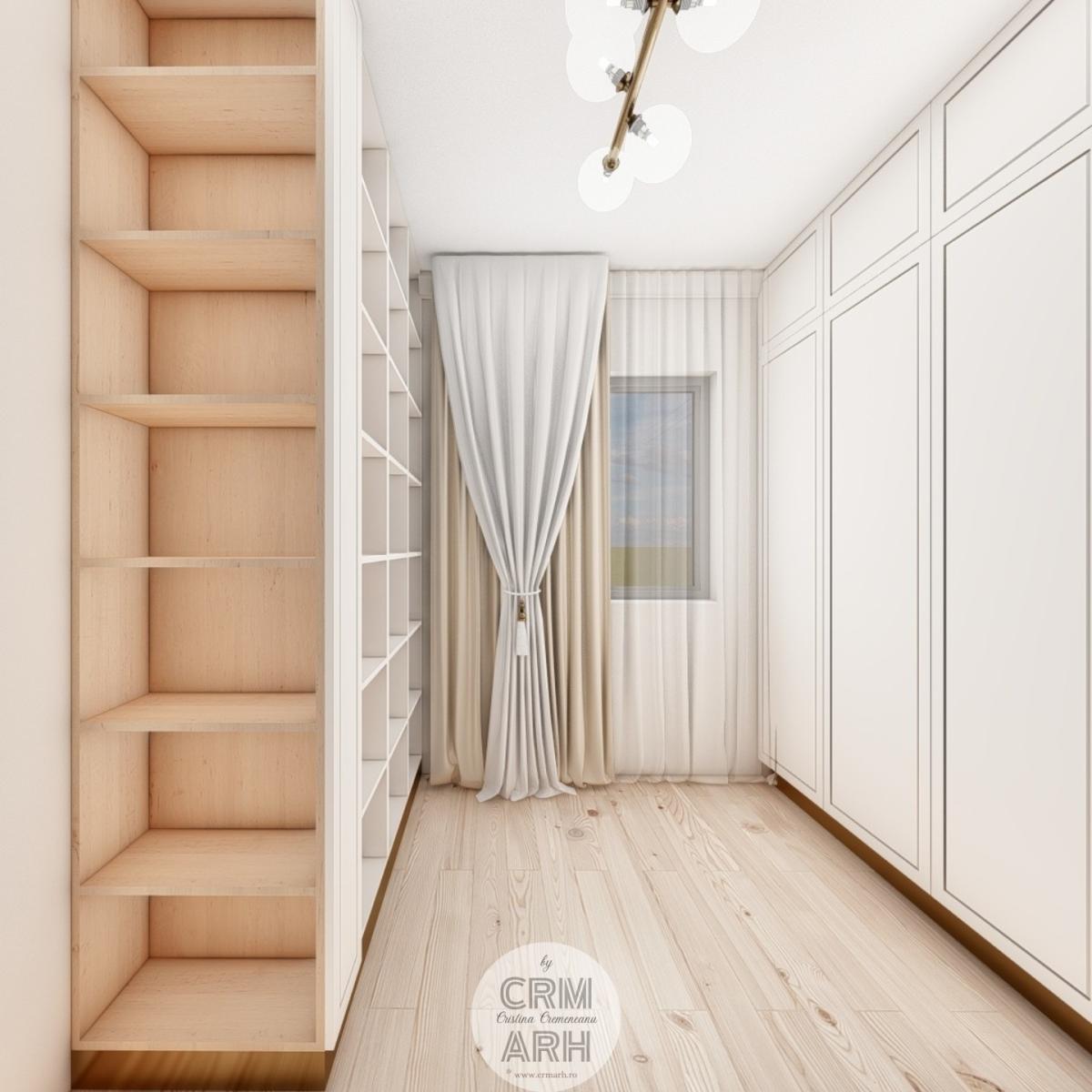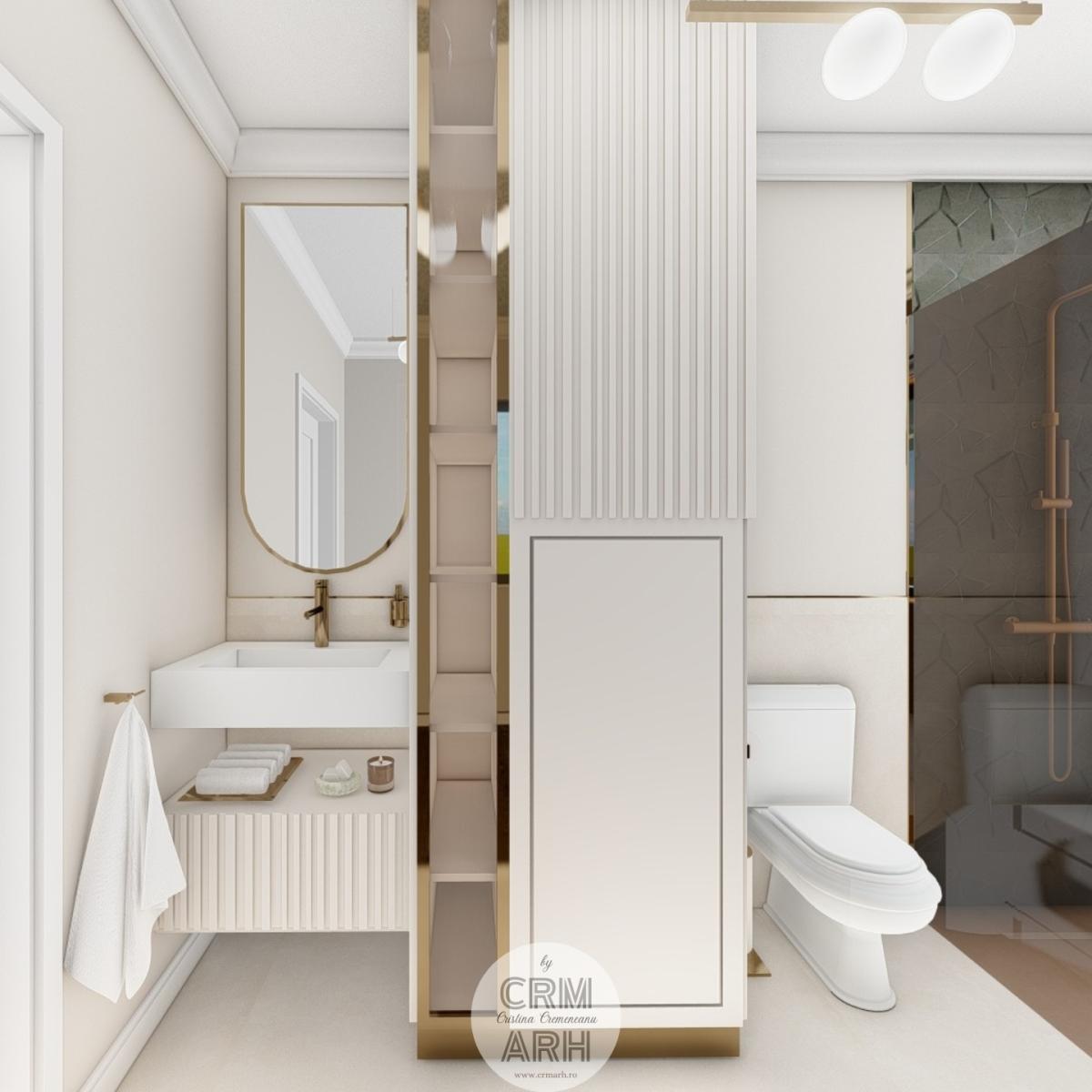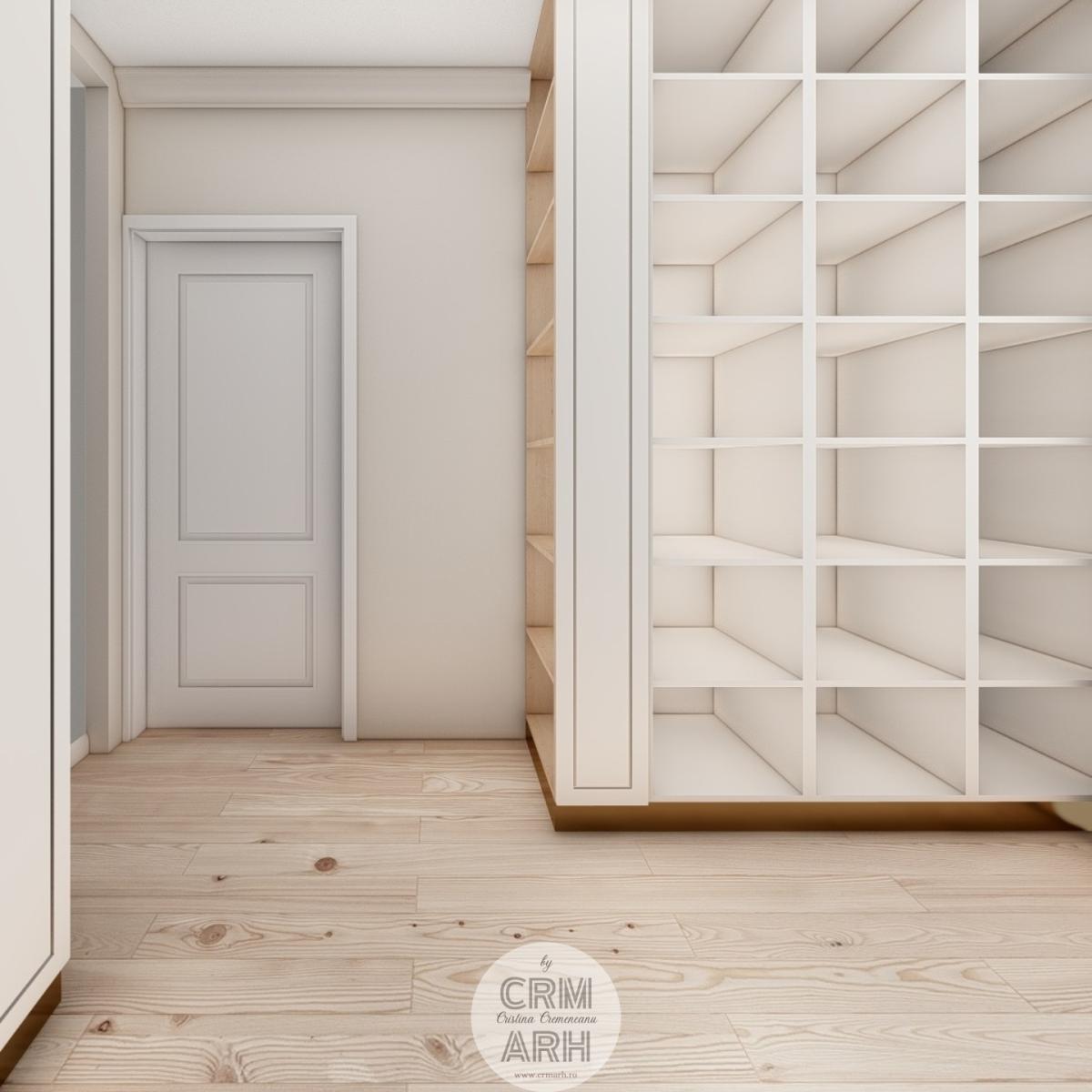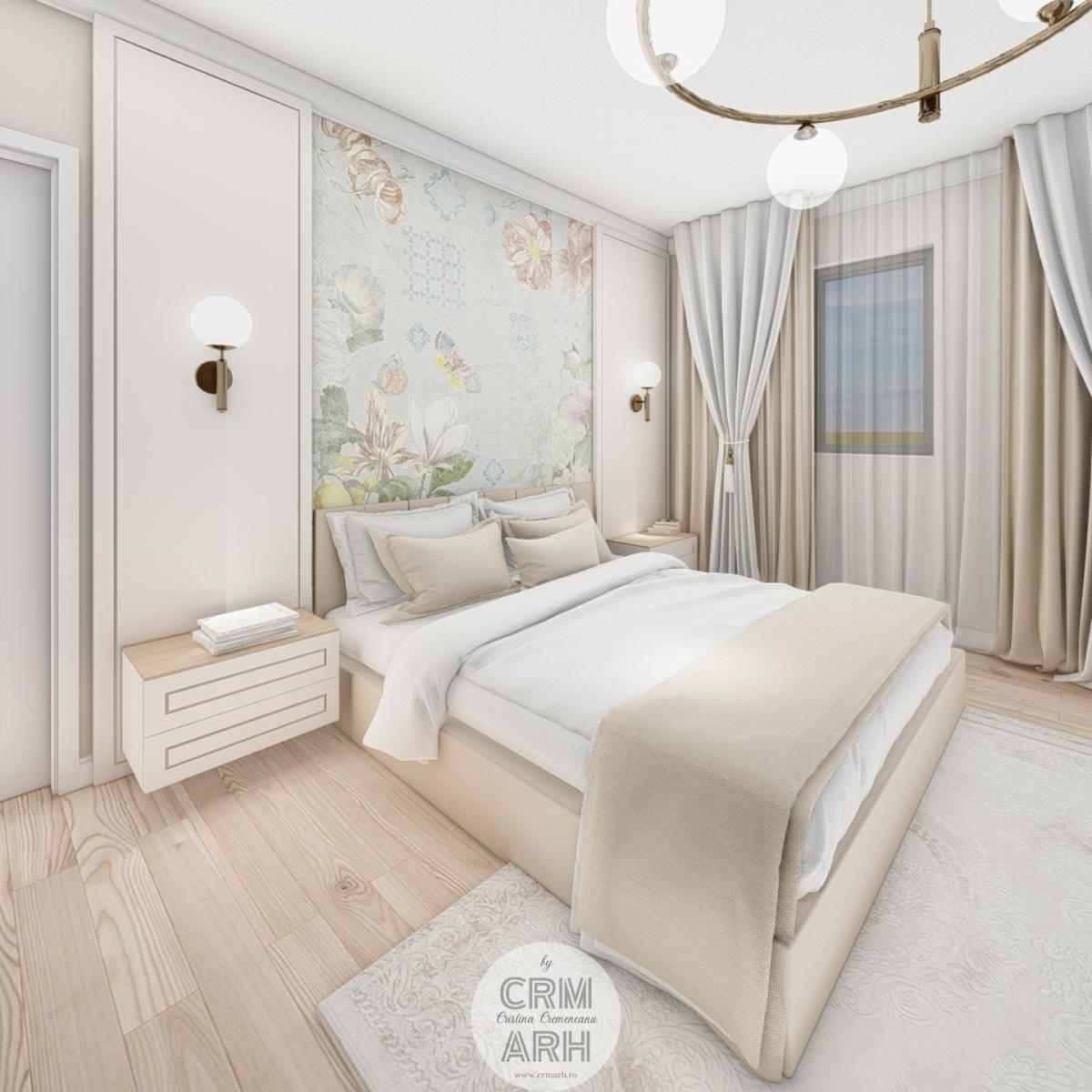 Locuința în stil neoclasic elegant se bazează pe linii simetrice, profile decorative fine, tapet texturat discret și o paletă calmă în tonuri de crem, grej și alb cald. Accentele gold satinat se regăsesc în corpurile de iluminat, mânere, rame și detalii ale mobilierului, aducând senzația de lux fără a încărca spațiul. Tapetul damask modern sau cu relief subtil, cornisele și medalionul pentru lustră completează estetica rafinată. Mobilierul din MDF vopsit mat, cu frezări clasice și rame elegante, definește livingul, bucătăria și dormitorul. Combinat cu textile premium (catifea, draperii grele, covoare moi) și oglinzi cu rame gold, rezultatul este o amenajare coerentă, luminoasă și sofisticată. Continuarea aceleiași scheme cromatice și a acelorași profile în toată casa creează unitate vizuală și un aer modern-neoclasic de înaltă clasă.