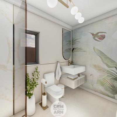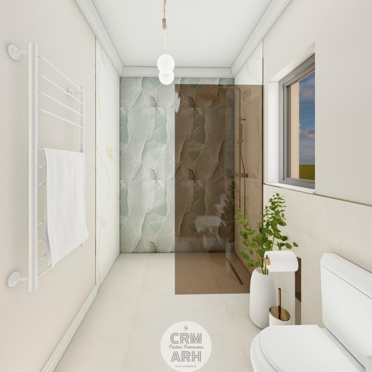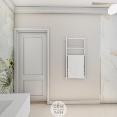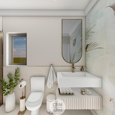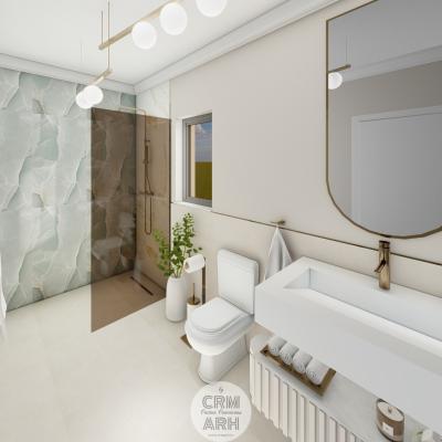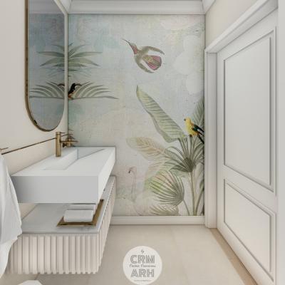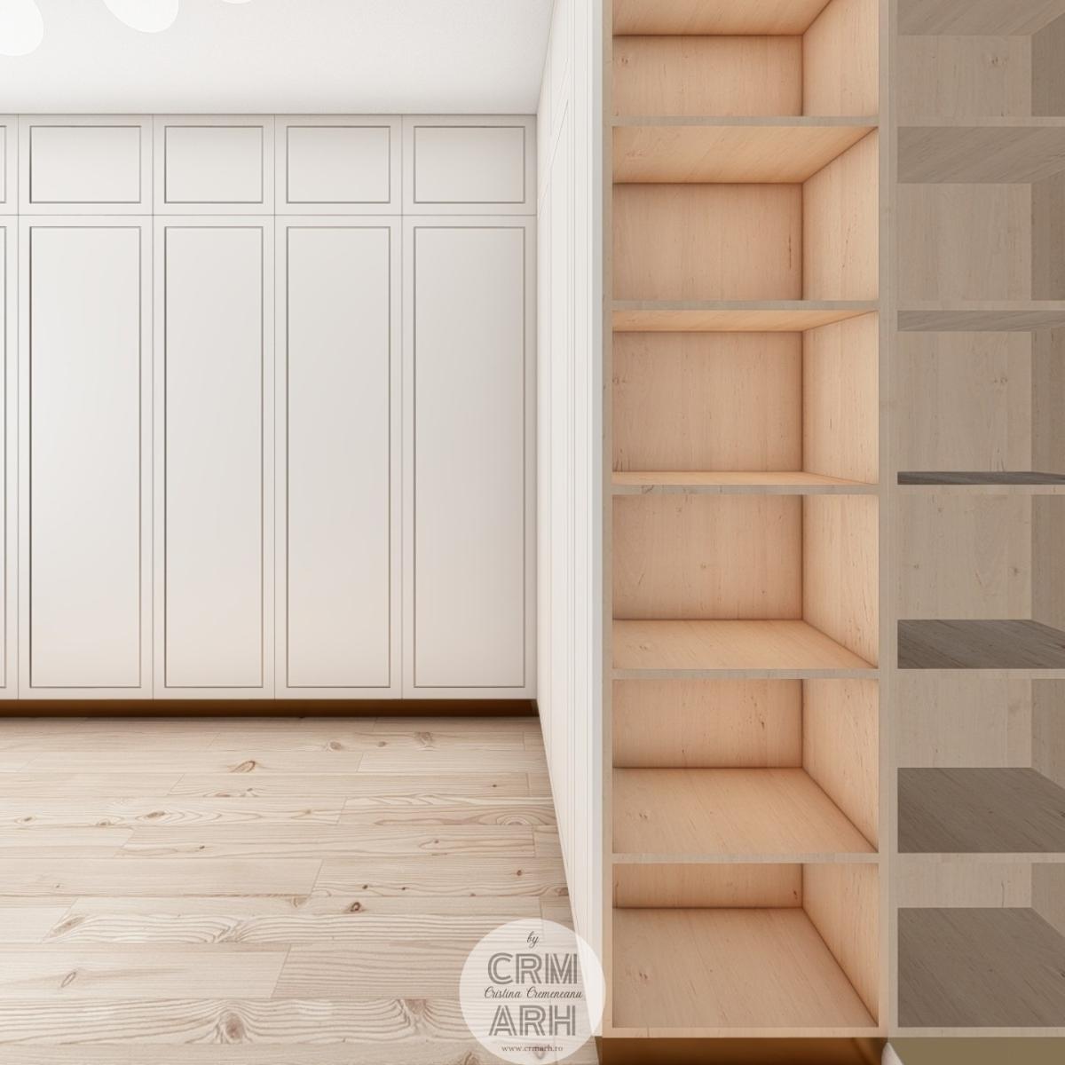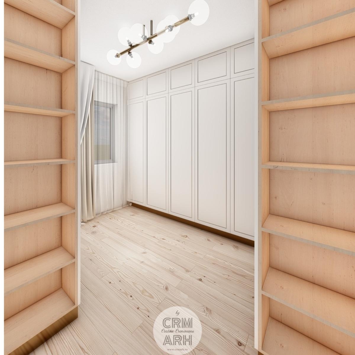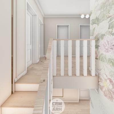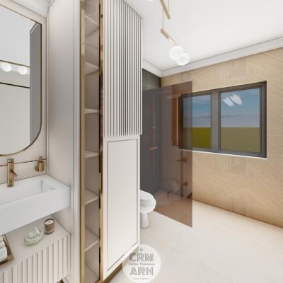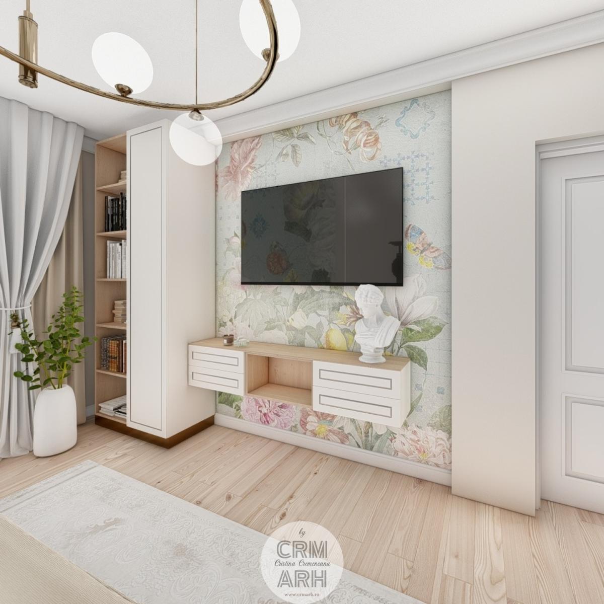 Locuința în stil neoclasic elegant se bazează pe linii simetrice, profile decorative fine, tapet texturat discret și o paletă calmă în tonuri de crem, grej și alb cald. Accentele gold satinat se regăsesc în corpurile de iluminat, mânere, rame și detalii ale mobilierului, aducând senzația de lux fără a încărca spațiul. Tapetul damask modern sau cu relief subtil, cornisele și medalionul pentru lustră completează estetica rafinată. Mobilierul din MDF vopsit mat, cu frezări clasice și rame elegante, definește livingul, bucătăria și dormitorul. Combinat cu textile premium (catifea, draperii grele, covoare moi) și oglinzi cu rame gold, rezultatul este o amenajare coerentă, luminoasă și sofisticată. Continuarea aceleiași scheme cromatice și a acelorași profile în toată casa creează unitate vizuală și un aer modern-neoclasic de înaltă clasă.