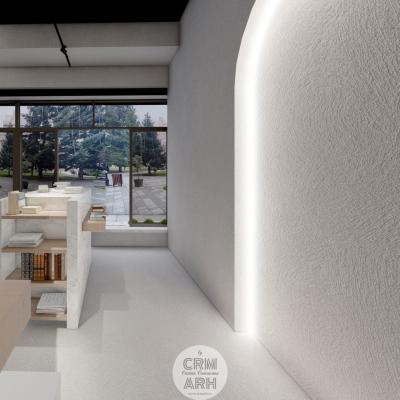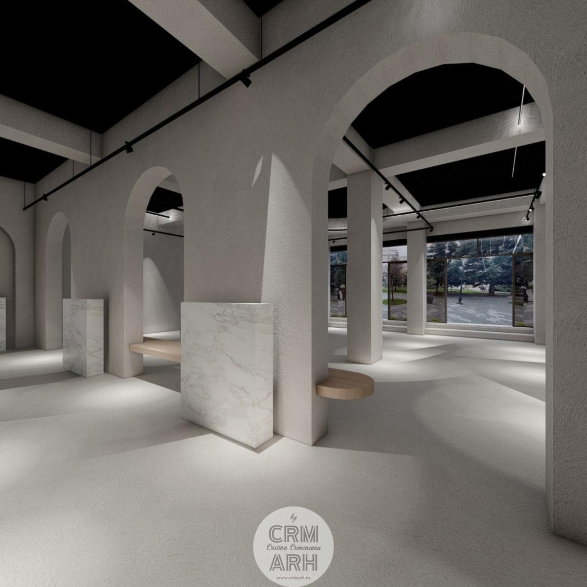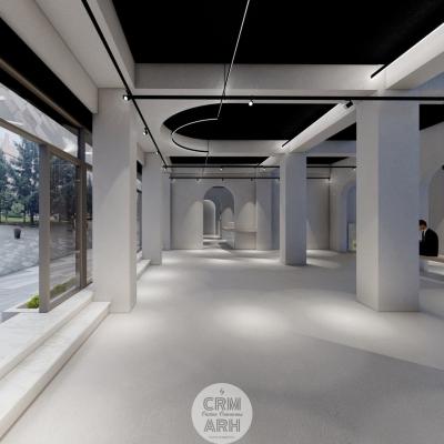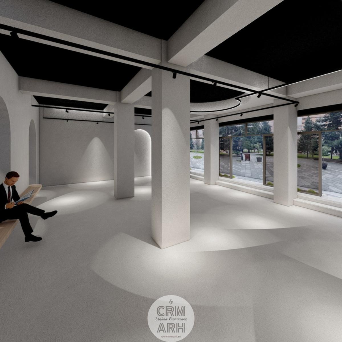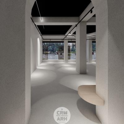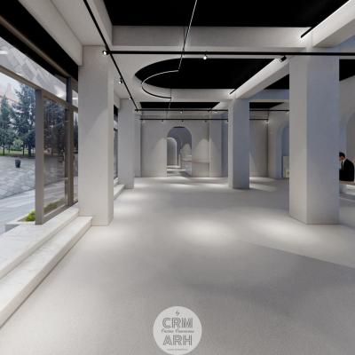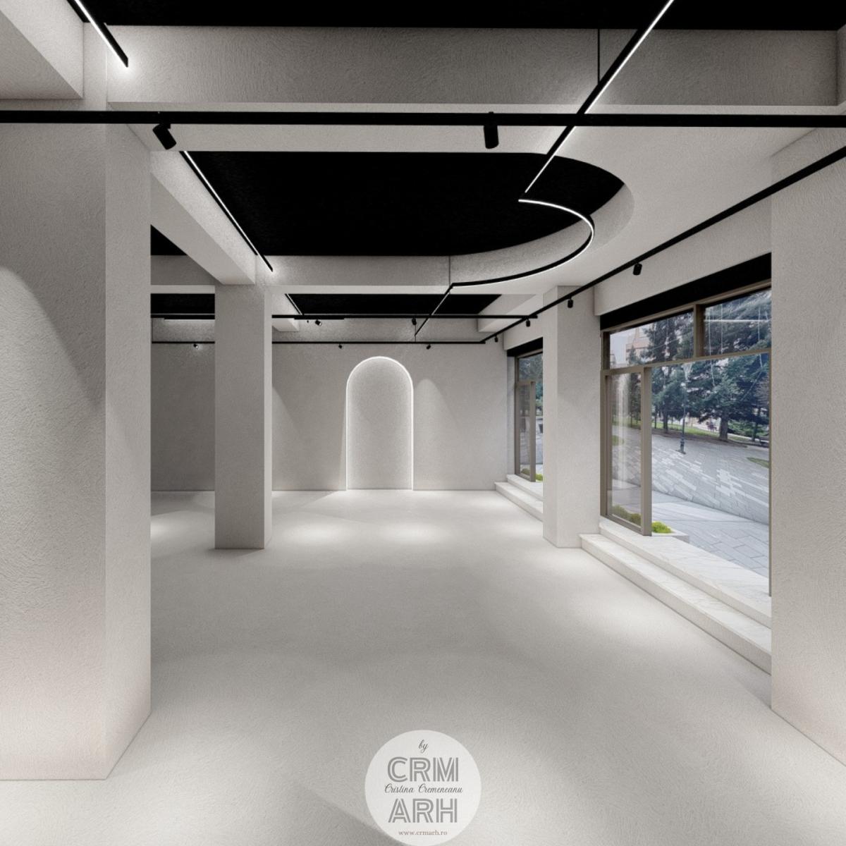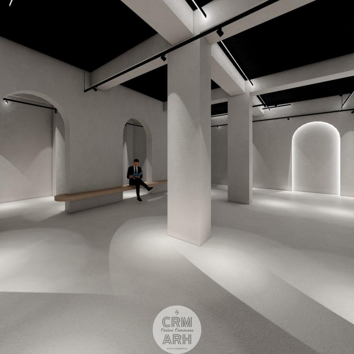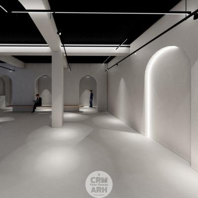 Galeria de artă în stil contemporan este un spațiu aerisit și modern, cu finisaje din microciment care oferă un fundal neutru pentru operele expuse. Arcadele luminate cu LED creează ritm și accente vizuale elegante, iar sinele magnetice suspendate permit expunerea flexibilă și modulară a lucrărilor. Mobilierul minimalist, cu linii simple și materiale neutre, completează designul fără a distrage atenția de la artă. Spațiul este deschis și funcțional, permițând vizitatorilor să se bucure de opere din multiple unghiuri și să experimenteze o atmosferă sofisticată și contemporană.
