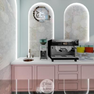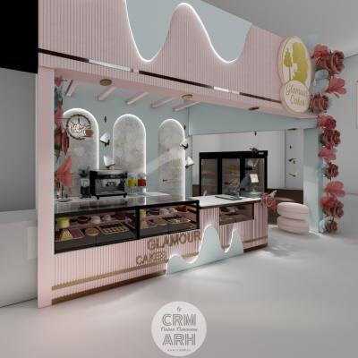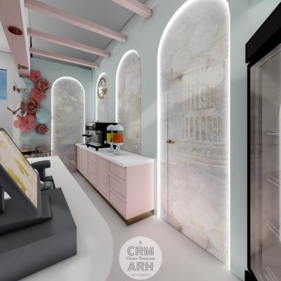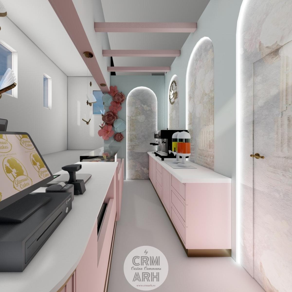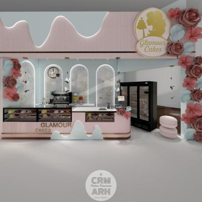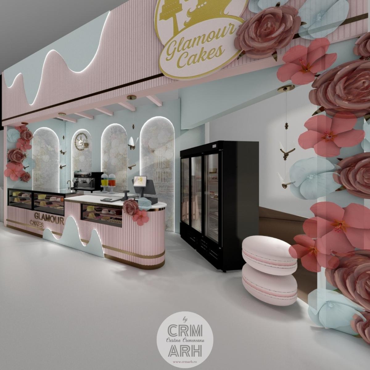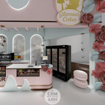 Cofetăria Glamour Cakes din food court-ul mall-ului din Craiova este un spațiu feminin, sofisticat și jucăuș, cu nuanțe pastelate, mobilier din MDF riflat roz și detalii aurii care adaugă rafinament. Tapeturile delicate și florile gigant creează puncte vizuale spectaculoase, conferind spațiului un look prietenos și instagramabil. Mobilierul și accentele decorative sunt gândite pentru a evidenția eleganța și confortul, cu zone de luat masa intime și colțuri foto-friendly. Îmbinarea pastelurilor cu detaliile gold și florile impun o atmosferă glamour, transformând cofetăria într-un loc memorabil și atrăgător pentru vizitatori.