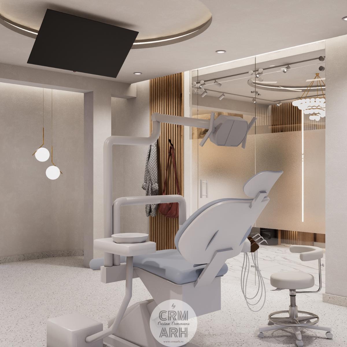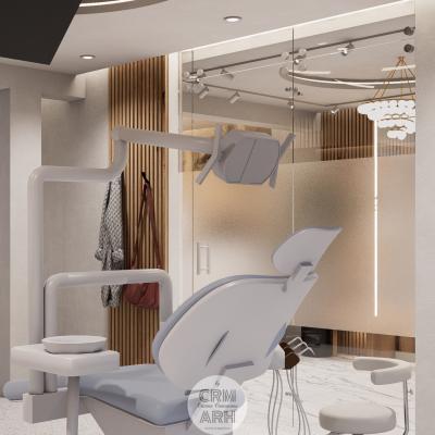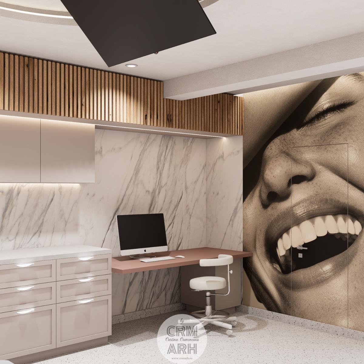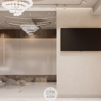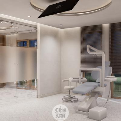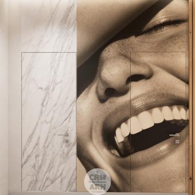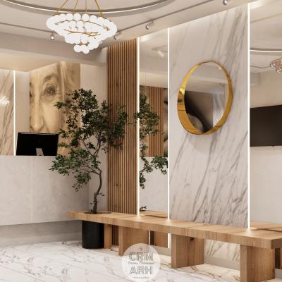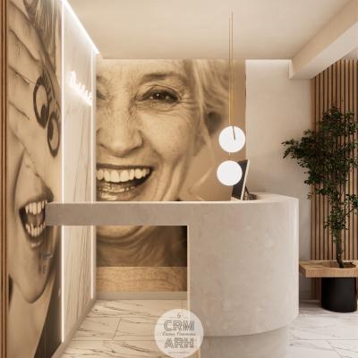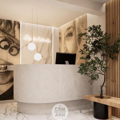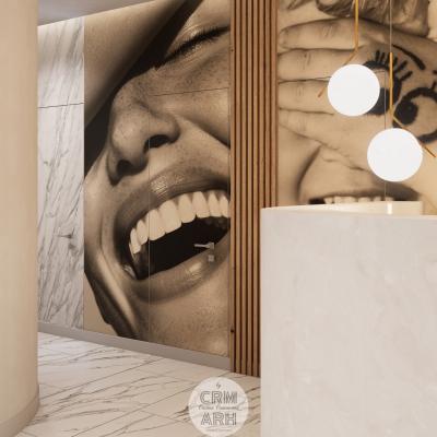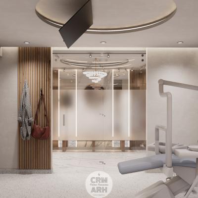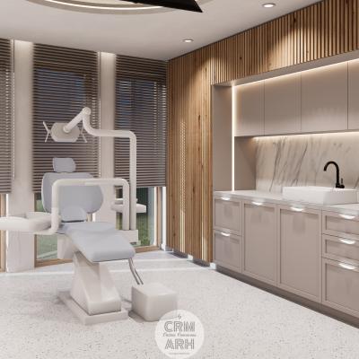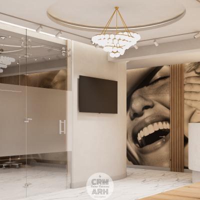 Cabinetul stomatologic de lux este conceput în tonuri neutre, cu inserții de lemn și marmură care adaugă căldură și textură, iar accentele aurii conferă rafinament și eleganță. Tapetul personalizat și luminile ambientale creează o atmosferă calmă și primitoare, evidențiind sofisticarea spațiului. Mobilierul cu linii curate, riflajele decorative și iluminatul bine gândit pun în valoare designul și funcționalitatea. Spațiul este deschis și fluid, cu zone de așteptare confortabile și săli de tratament elegante, transformând cabinetul într-un mediu luxos, modern și primitor pentru pacienți.