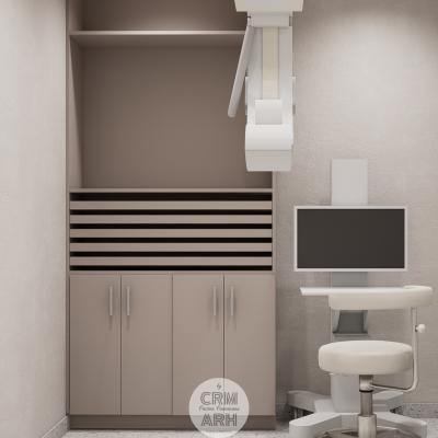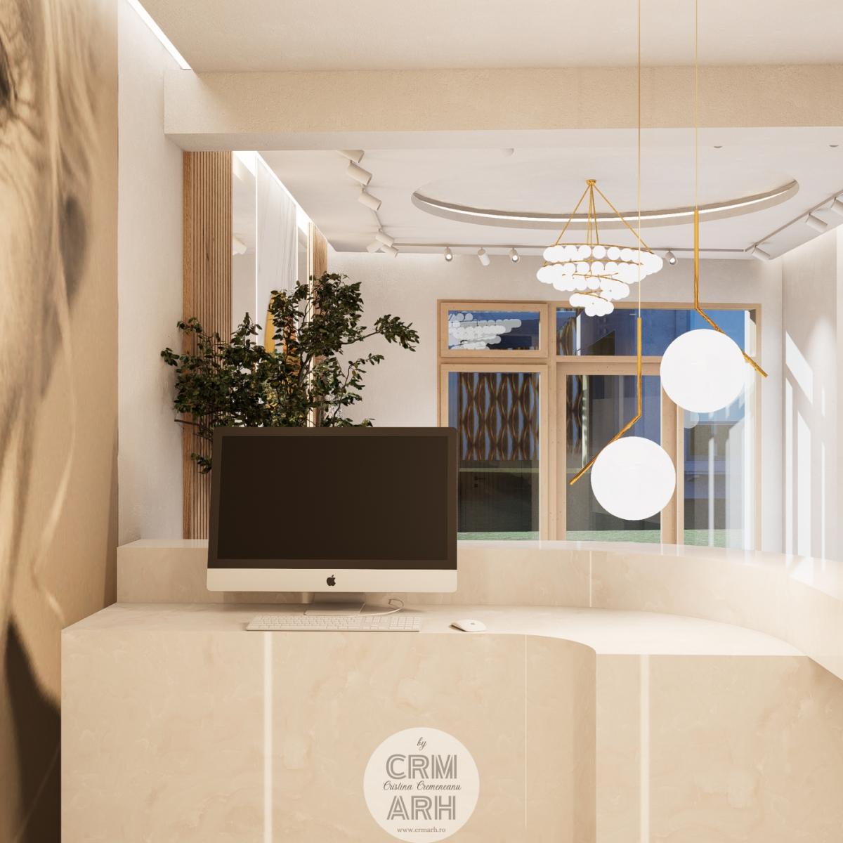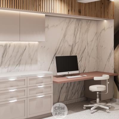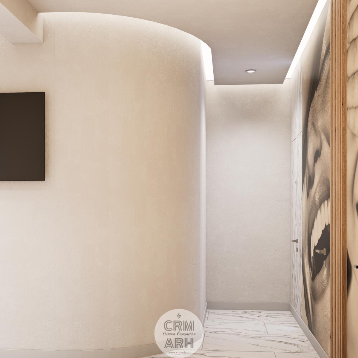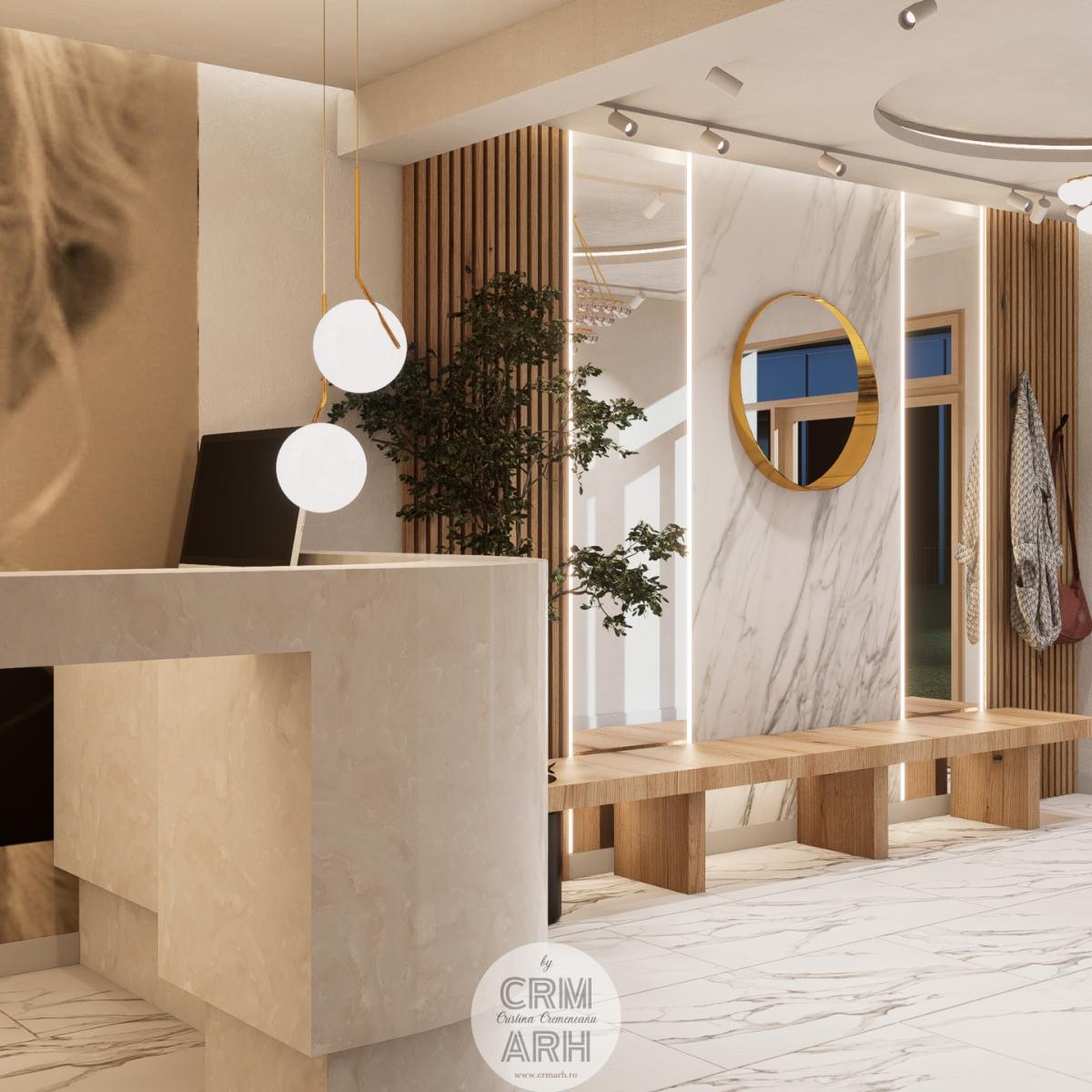 Cabinetul stomatologic de lux este conceput în tonuri neutre, cu inserții de lemn și marmură care adaugă căldură și textură, iar accentele aurii conferă rafinament și eleganță. Tapetul personalizat și luminile ambientale creează o atmosferă calmă și primitoare, evidențiind sofisticarea spațiului. Mobilierul cu linii curate, riflajele decorative și iluminatul bine gândit pun în valoare designul și funcționalitatea. Spațiul este deschis și fluid, cu zone de așteptare confortabile și săli de tratament elegante, transformând cabinetul într-un mediu luxos, modern și primitor pentru pacienți.