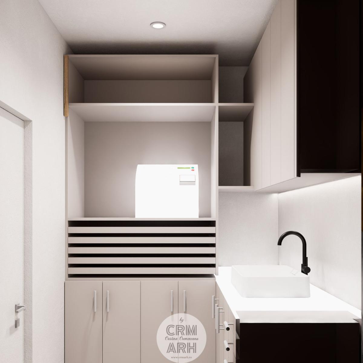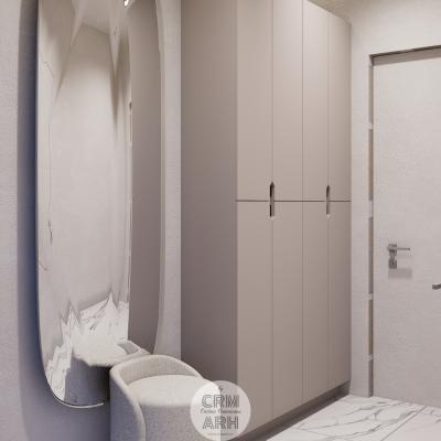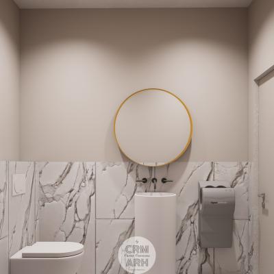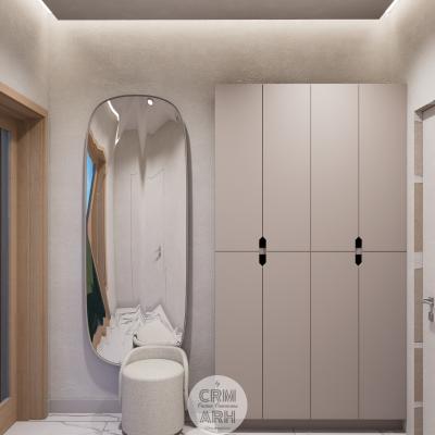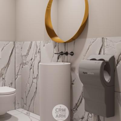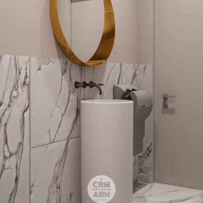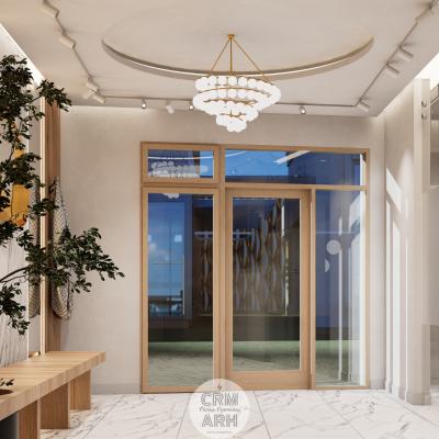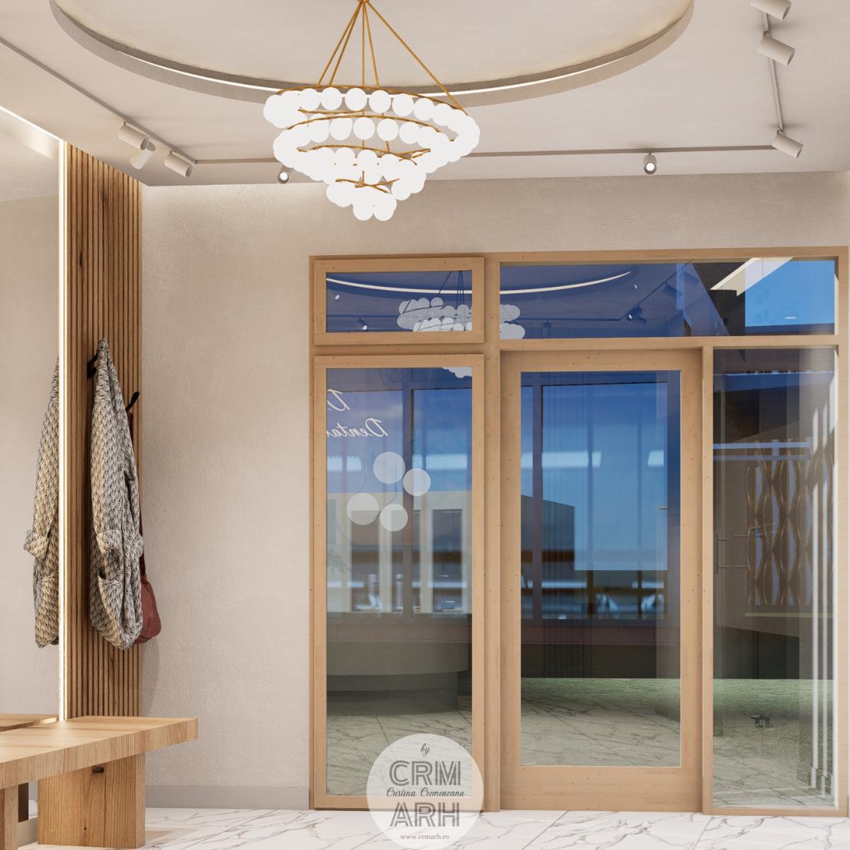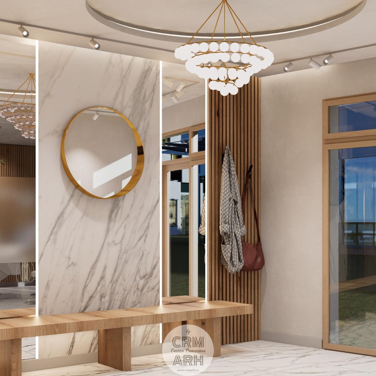 Cabinetul stomatologic de lux este conceput în tonuri neutre, cu inserții de lemn și marmură care adaugă căldură și textură, iar accentele aurii conferă rafinament și eleganță. Tapetul personalizat și luminile ambientale creează o atmosferă calmă și primitoare, evidențiind sofisticarea spațiului. Mobilierul cu linii curate, riflajele decorative și iluminatul bine gândit pun în valoare designul și funcționalitatea. Spațiul este deschis și fluid, cu zone de așteptare confortabile și săli de tratament elegante, transformând cabinetul într-un mediu luxos, modern și primitor pentru pacienți.