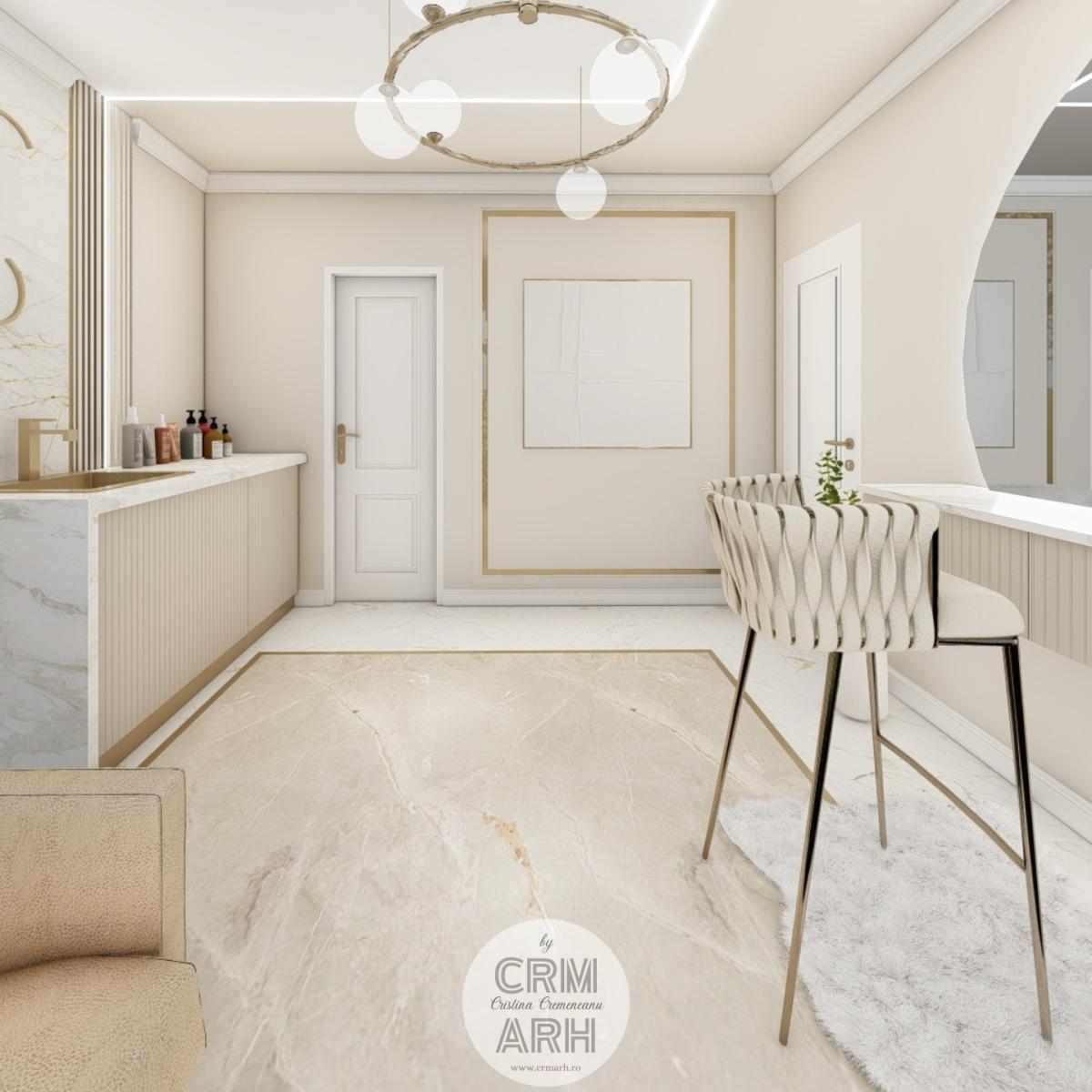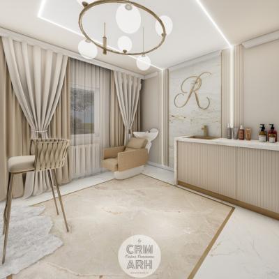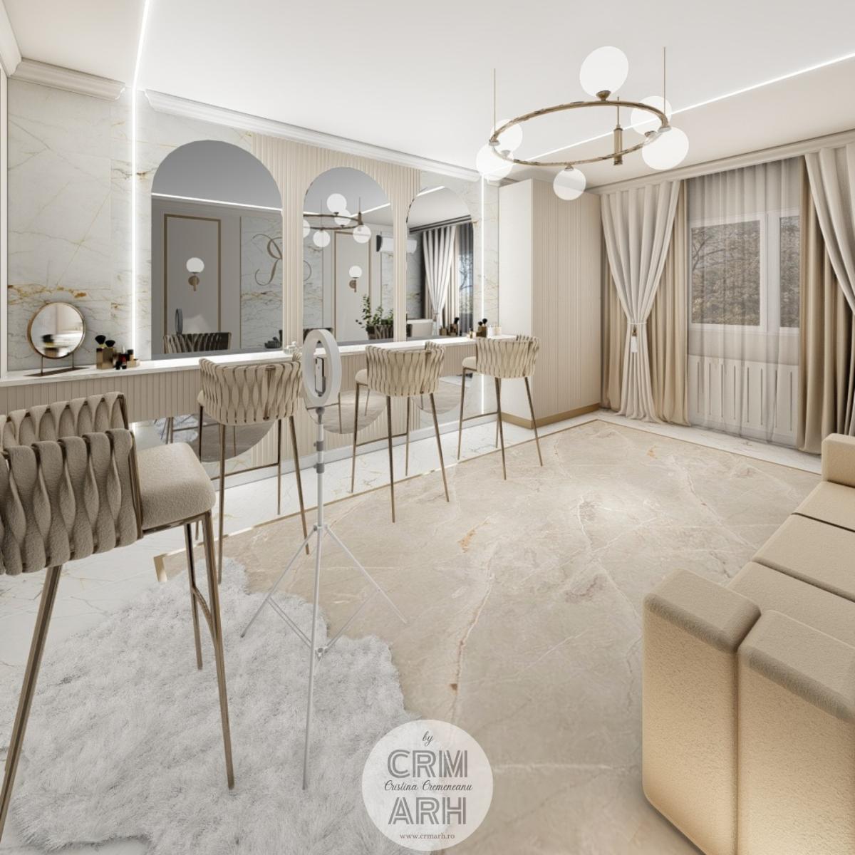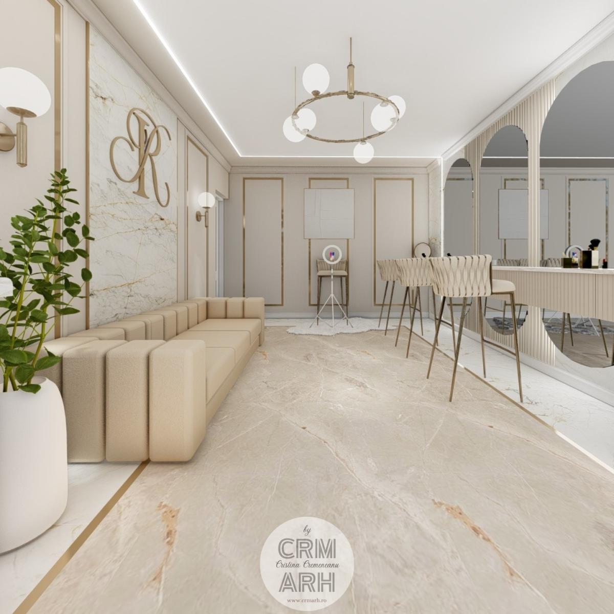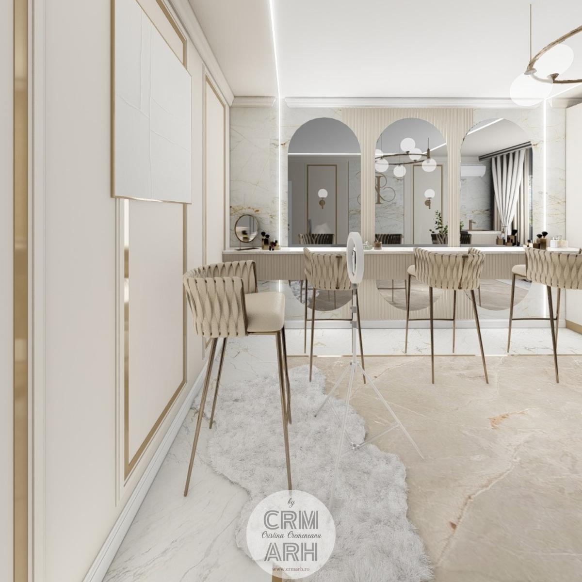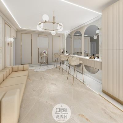 Salonul de machiaj și păr este amenajat într-un stil luxury glam, cu nuanțe calde de crem și bej, puse în valoare de accente gold, riflaje verticale și profile decorative elegante. Oglinzile mari cu iluminare LED și finisajele rafinate creează un spațiu luminos, sofisticat și extrem de feminin. Zonele de machiaj și coafor sunt organizate cu mobilier custom și detalii premium, iar iluminatul ambiental integrat accentuează eleganța spațiului. Pardoseala cu aspect de marmură și recepția cu riflaje și logo auriu completează un concept modern, coerent și exclusivist.