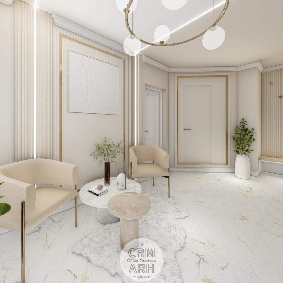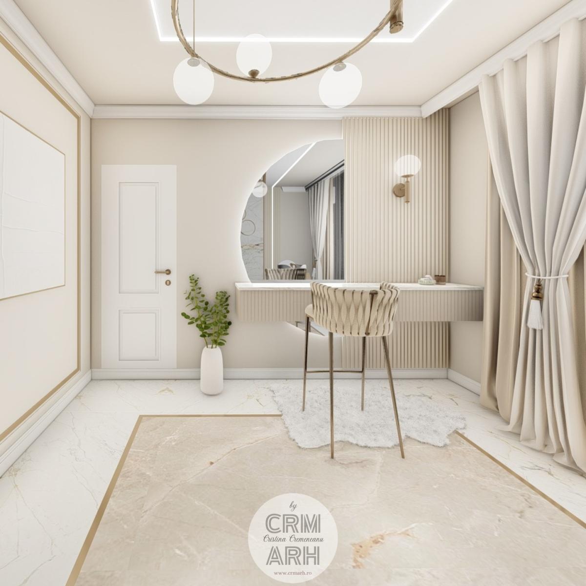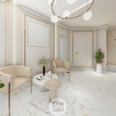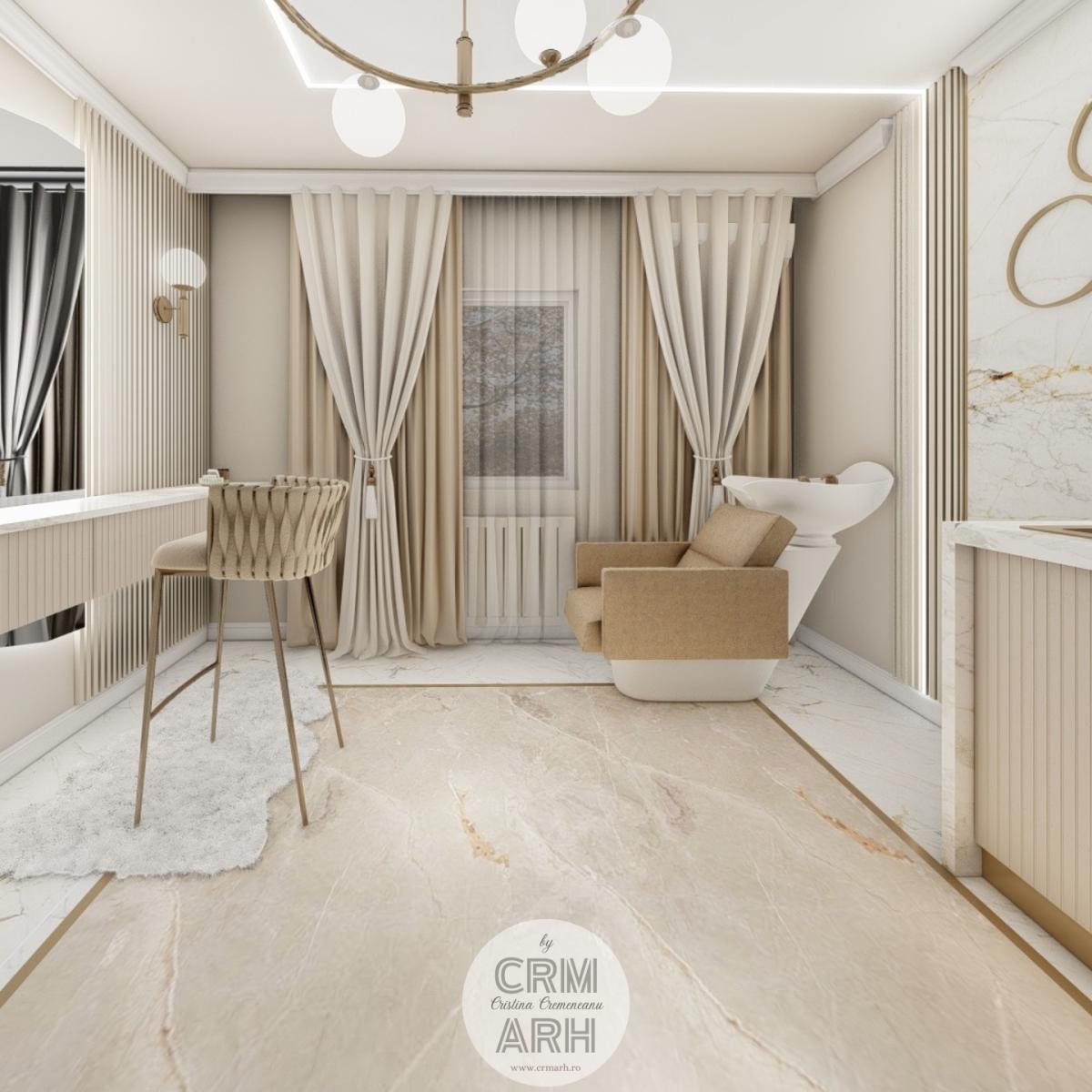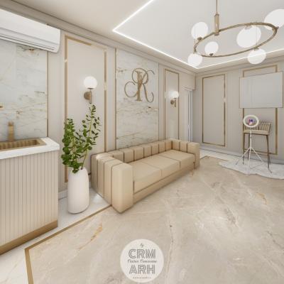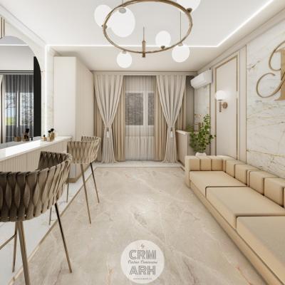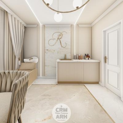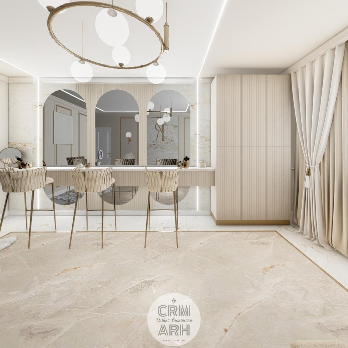 Salonul de machiaj și păr este amenajat într-un stil luxury glam, cu nuanțe calde de crem și bej, puse în valoare de accente gold, riflaje verticale și profile decorative elegante. Oglinzile mari cu iluminare LED și finisajele rafinate creează un spațiu luminos, sofisticat și extrem de feminin. Zonele de machiaj și coafor sunt organizate cu mobilier custom și detalii premium, iar iluminatul ambiental integrat accentuează eleganța spațiului. Pardoseala cu aspect de marmură și recepția cu riflaje și logo auriu completează un concept modern, coerent și exclusivist.