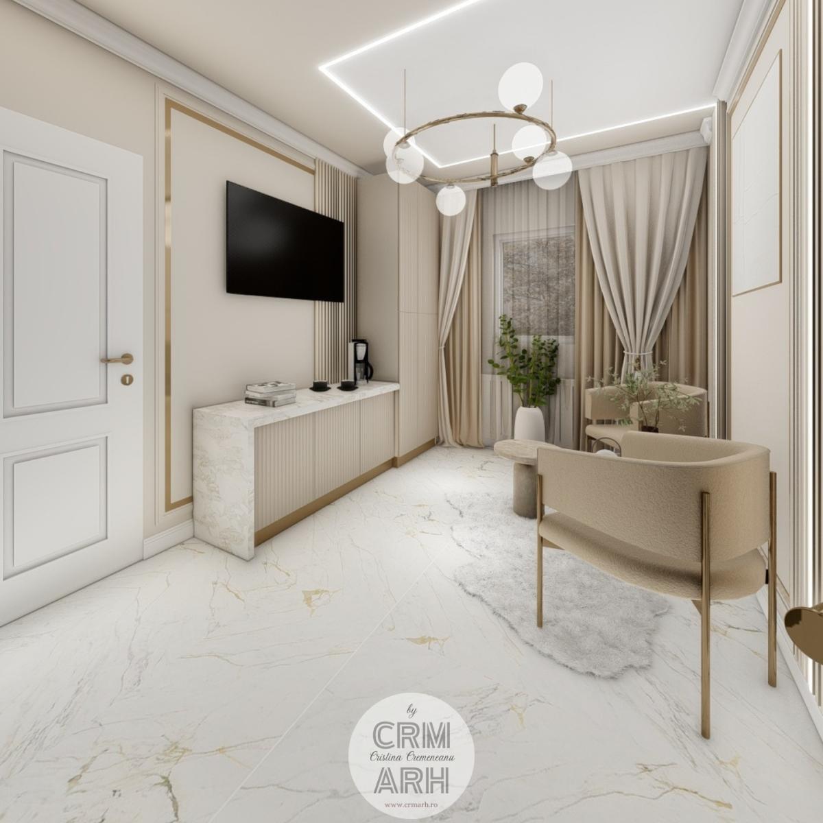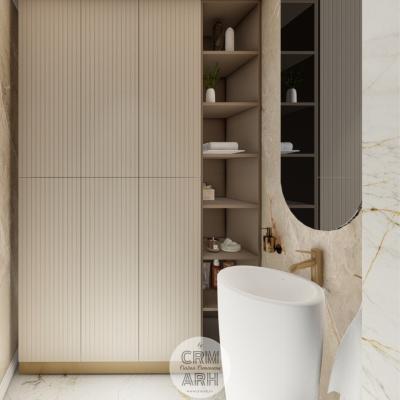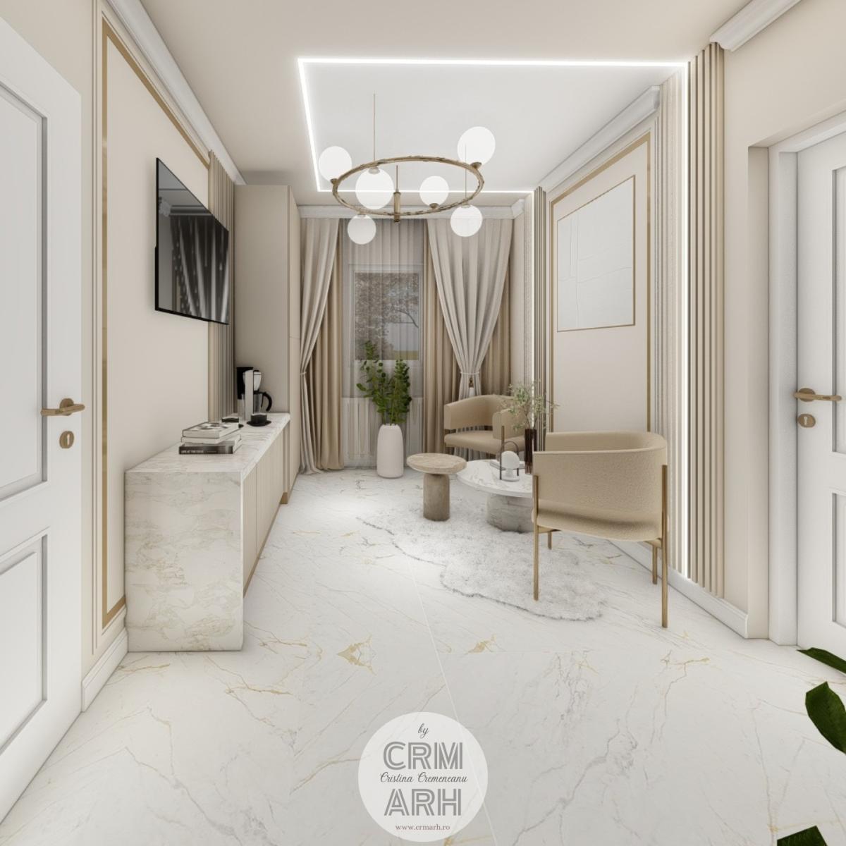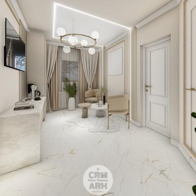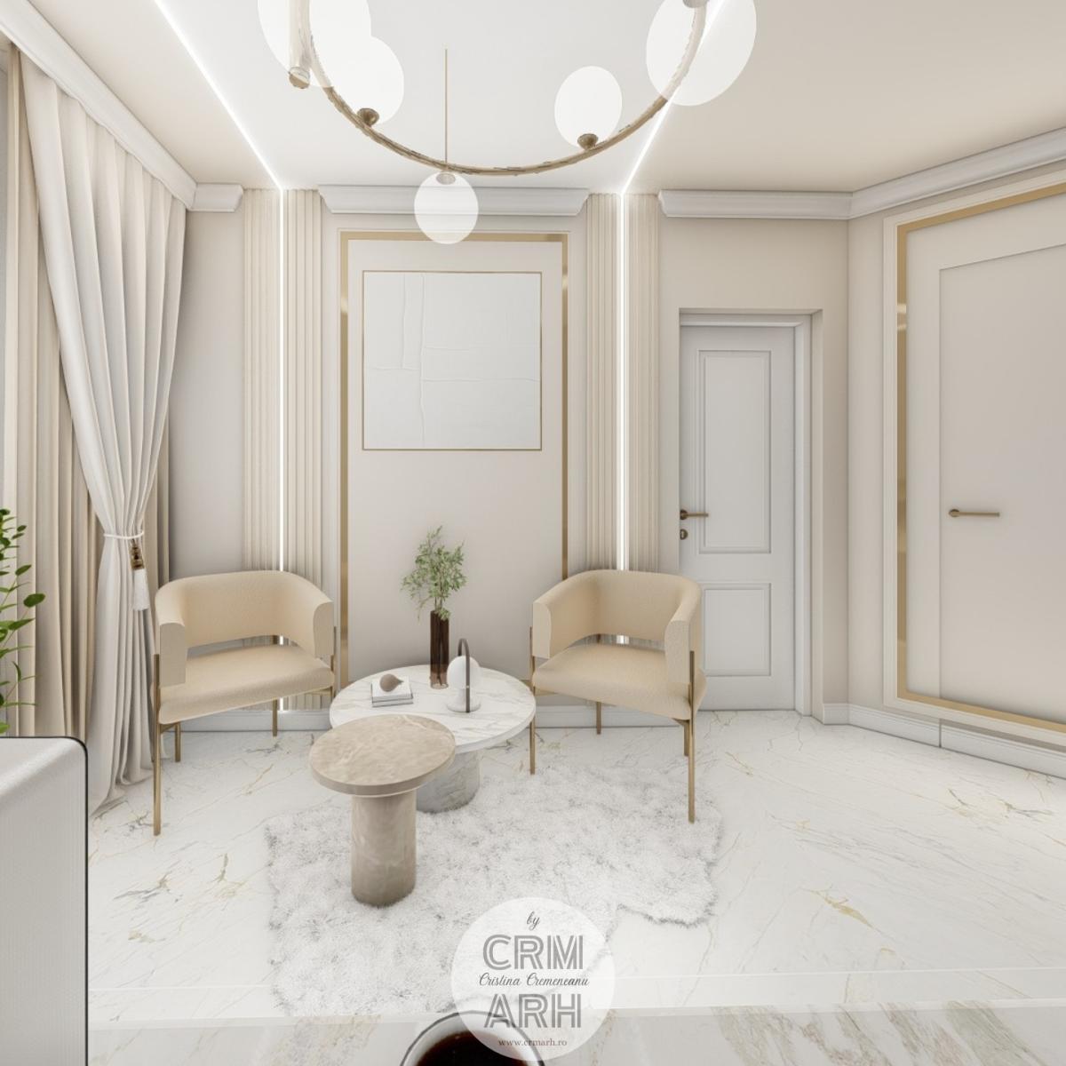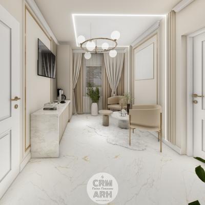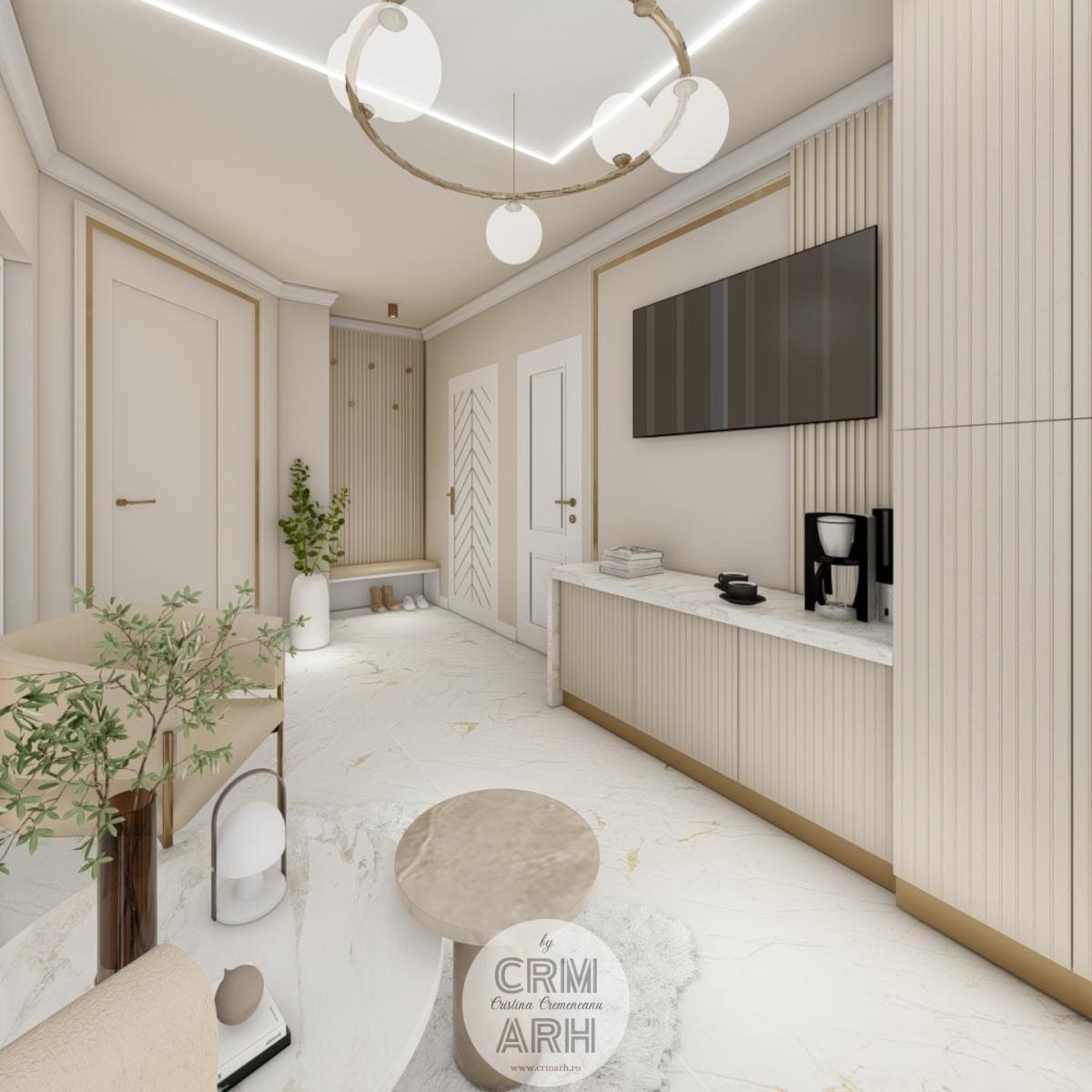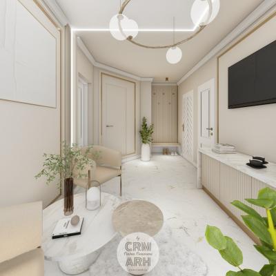 Salonul de machiaj și păr este amenajat într-un stil luxury glam, cu nuanțe calde de crem și bej, puse în valoare de accente gold, riflaje verticale și profile decorative elegante. Oglinzile mari cu iluminare LED și finisajele rafinate creează un spațiu luminos, sofisticat și extrem de feminin. Zonele de machiaj și coafor sunt organizate cu mobilier custom și detalii premium, iar iluminatul ambiental integrat accentuează eleganța spațiului. Pardoseala cu aspect de marmură și recepția cu riflaje și logo auriu completează un concept modern, coerent și exclusivist.