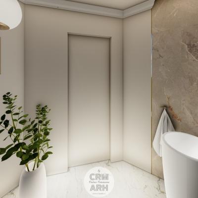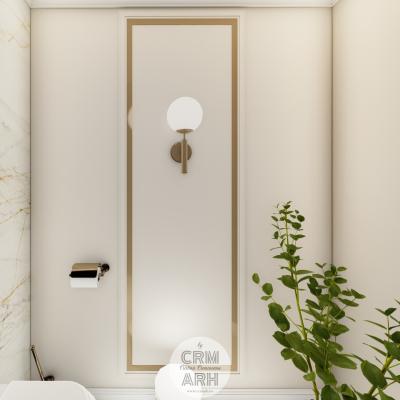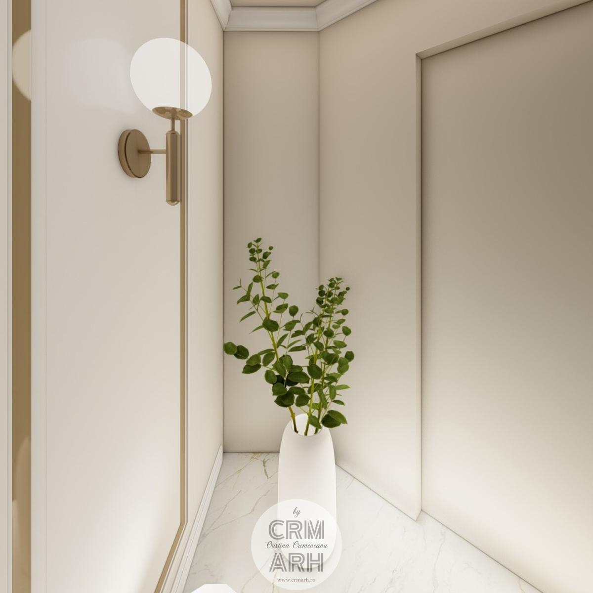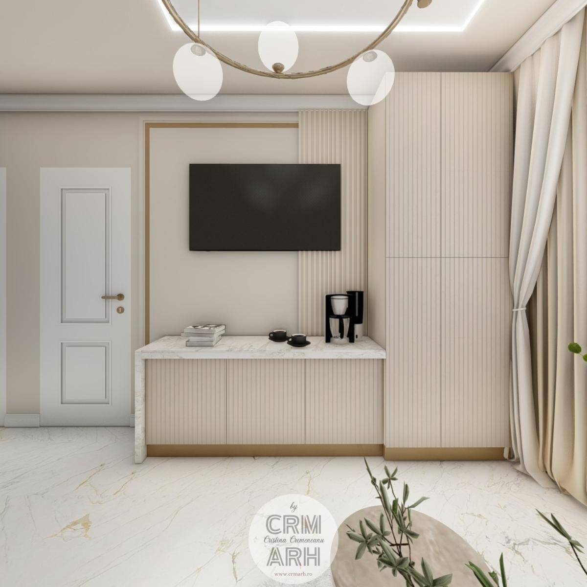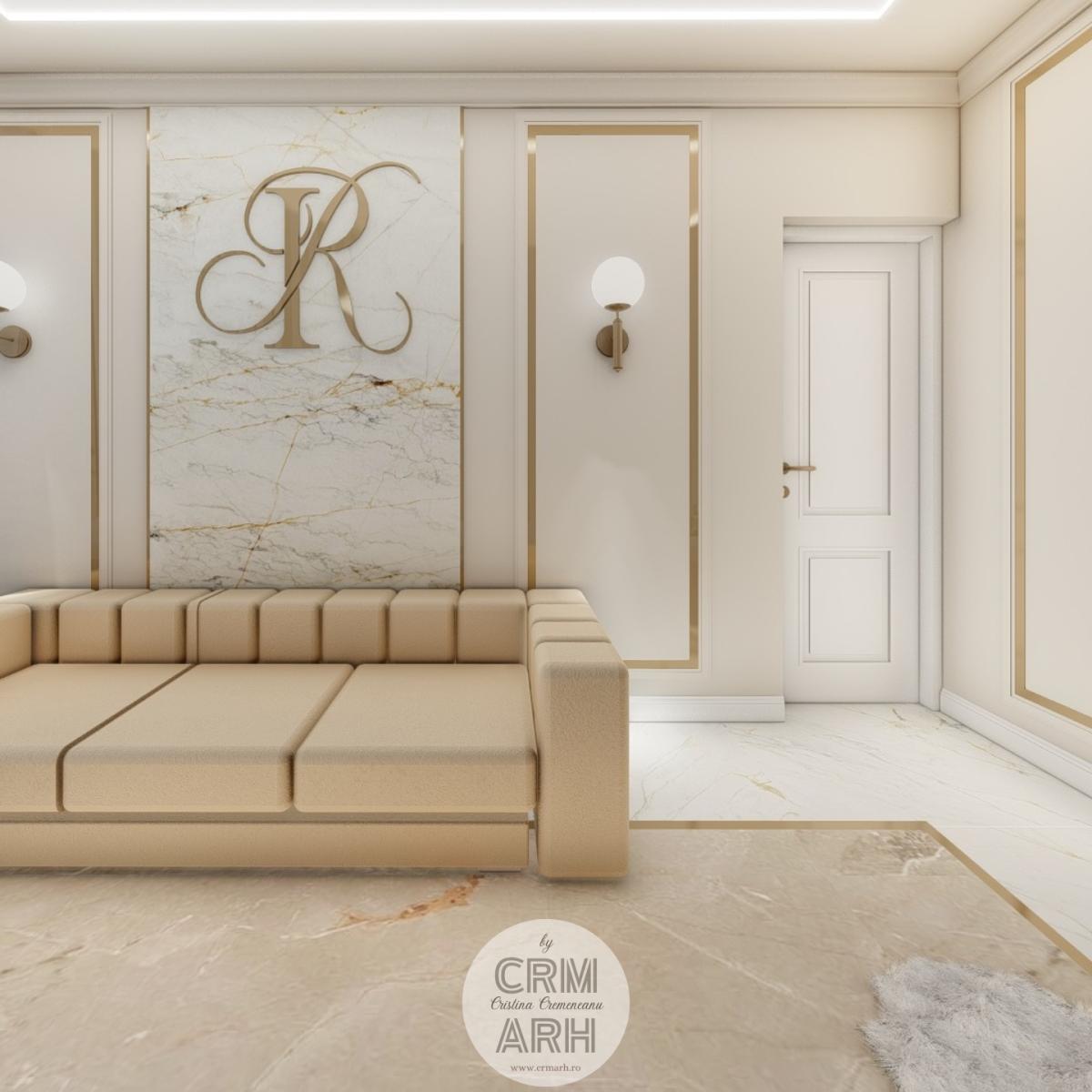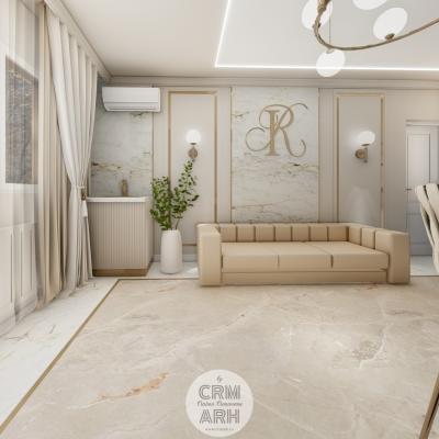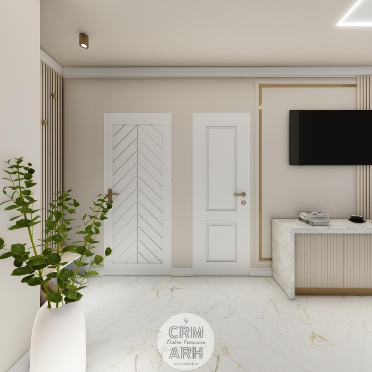 Salonul de machiaj și păr este amenajat într-un stil luxury glam, cu nuanțe calde de crem și bej, puse în valoare de accente gold, riflaje verticale și profile decorative elegante. Oglinzile mari cu iluminare LED și finisajele rafinate creează un spațiu luminos, sofisticat și extrem de feminin. Zonele de machiaj și coafor sunt organizate cu mobilier custom și detalii premium, iar iluminatul ambiental integrat accentuează eleganța spațiului. Pardoseala cu aspect de marmură și recepția cu riflaje și logo auriu completează un concept modern, coerent și exclusivist.