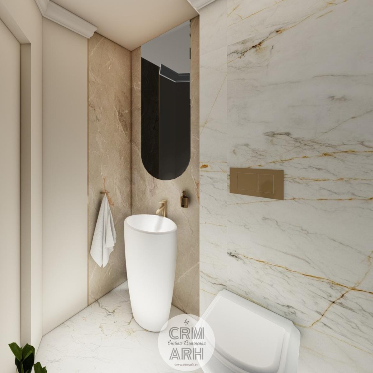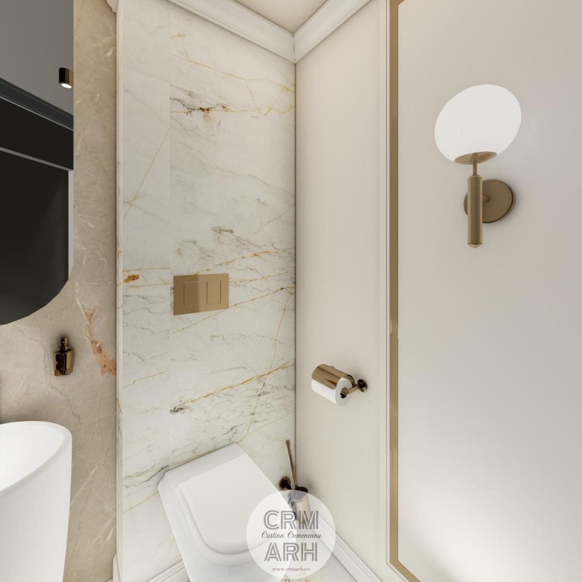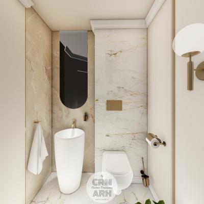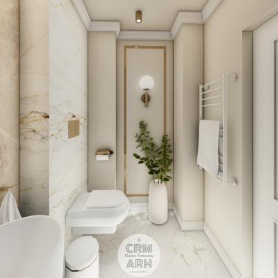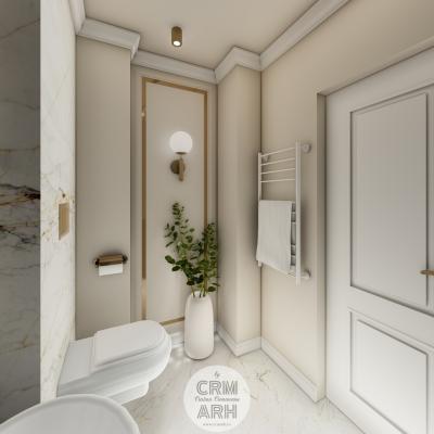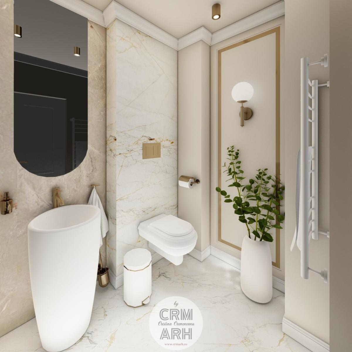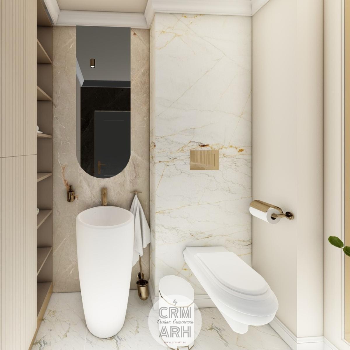 Salonul de machiaj și păr este amenajat într-un stil luxury glam, cu nuanțe calde de crem și bej, puse în valoare de accente gold, riflaje verticale și profile decorative elegante. Oglinzile mari cu iluminare LED și finisajele rafinate creează un spațiu luminos, sofisticat și extrem de feminin. Zonele de machiaj și coafor sunt organizate cu mobilier custom și detalii premium, iar iluminatul ambiental integrat accentuează eleganța spațiului. Pardoseala cu aspect de marmură și recepția cu riflaje și logo auriu completează un concept modern, coerent și exclusivist.