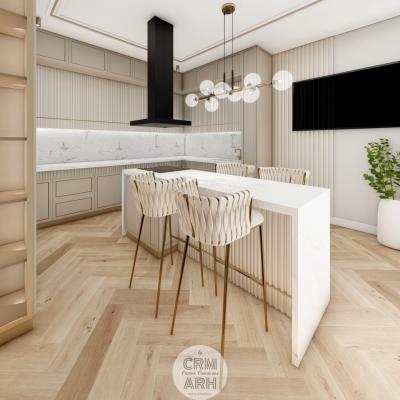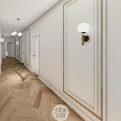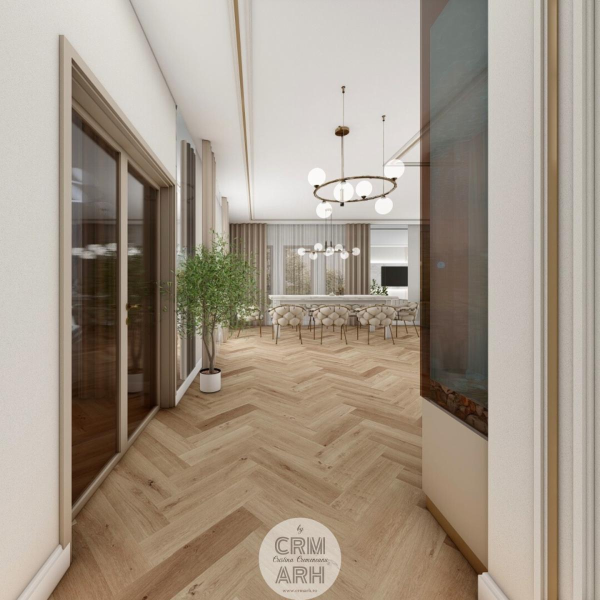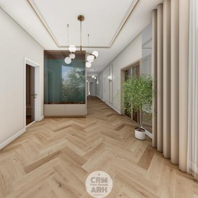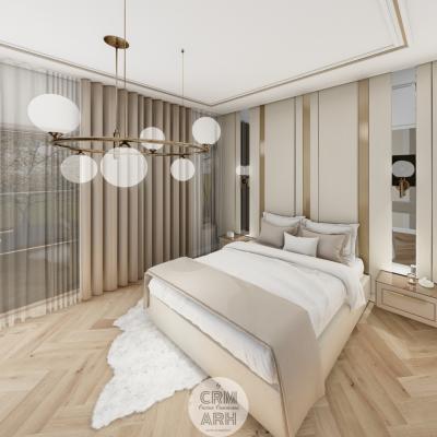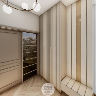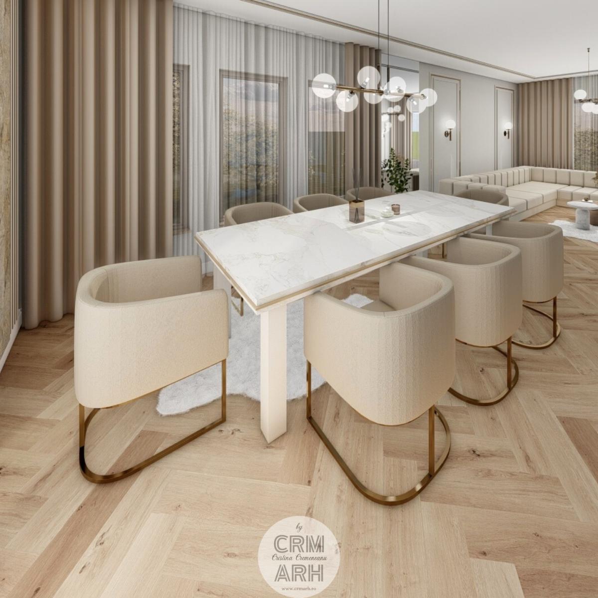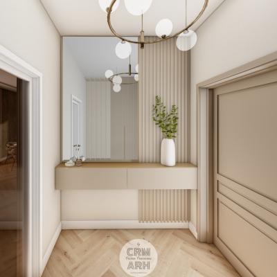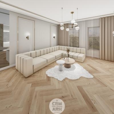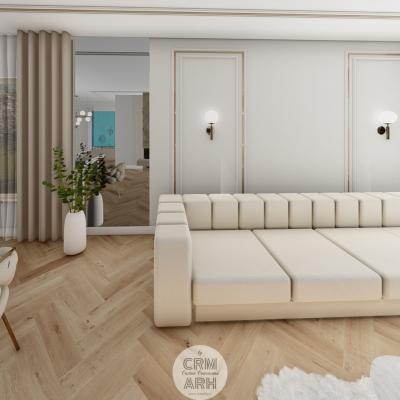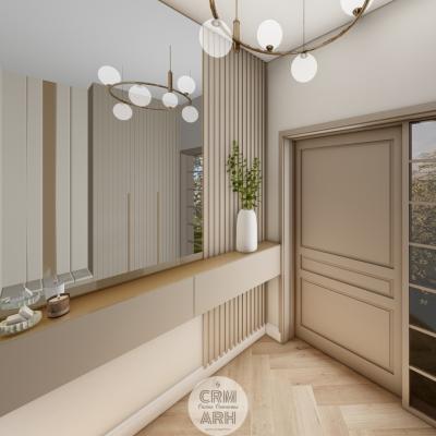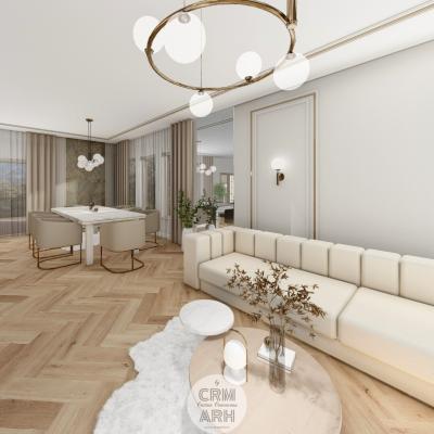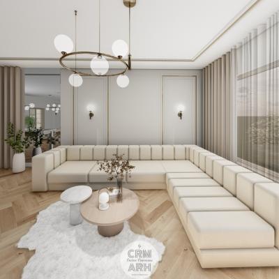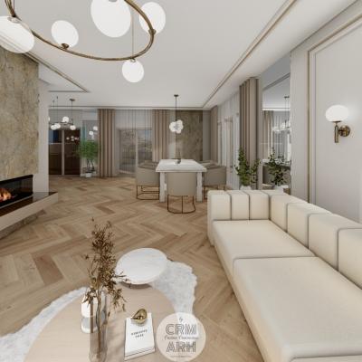 Un design de casă elegantă în nuanțe de bej și alb emană rafinament și echilibru, fiind o alegere atemporală care aduce luminozitate și armonie spațiilor. Pereții în tonuri calde de bej deschis sau crem sunt puși în valoare de profile decorative clasice albe, care conturează subtil pereții, tavanele și ușile. Aceste detalii adaugă profunzime și eleganță fără a încărca vizual. Podelele din parchet deschis, cu texturi naturale, completează perfect paleta cromatică, iar textilele fine — catifea, in sau bumbac premium — întregesc atmosfera sofisticată. Elementele moderne precum riflajele din lemn natur sau vopsite alb aduc un contrast rafinat și o notă de actualitate, în timp ce oglinzile decorative amplifică lumina și spațiul, oferind reflexii spectaculoase.