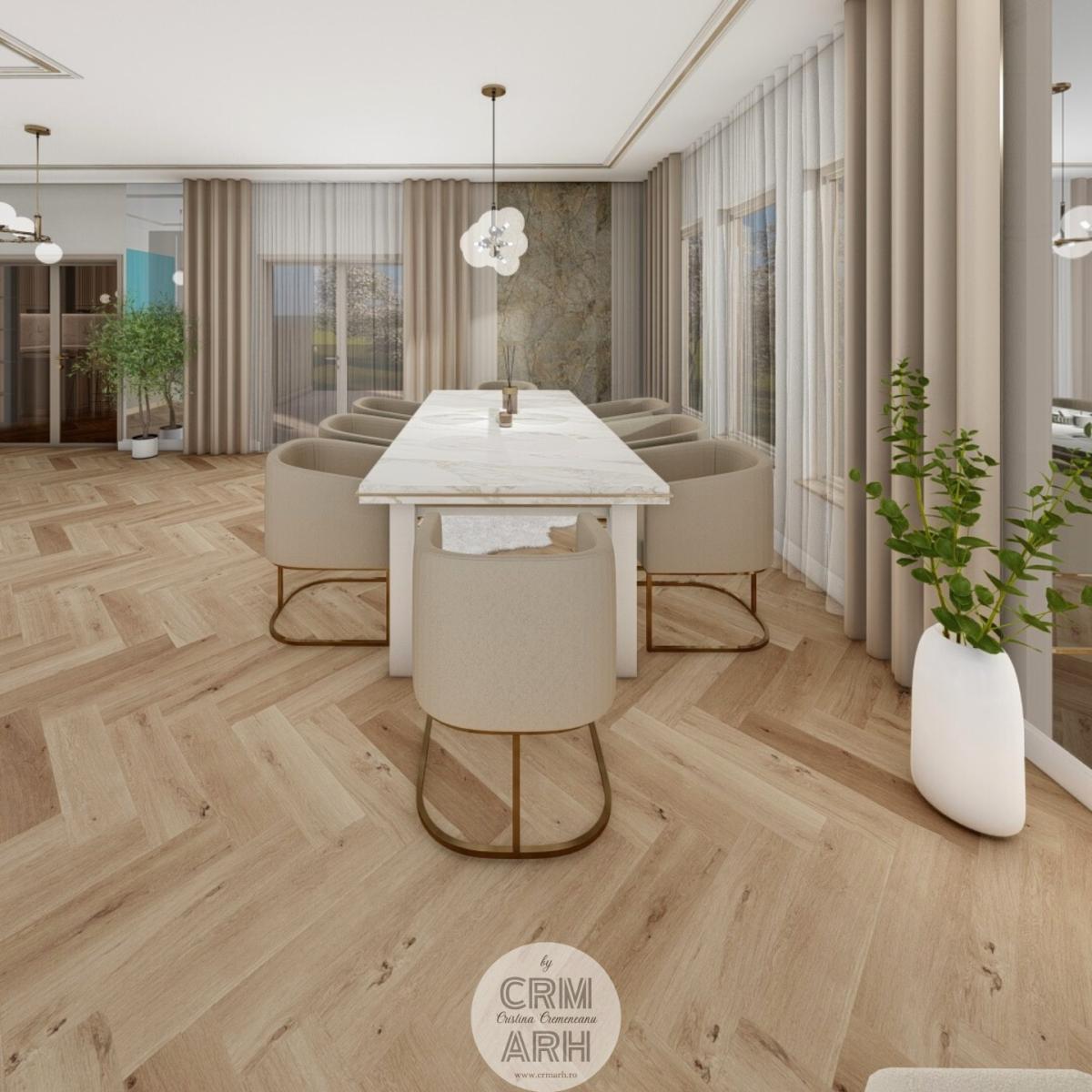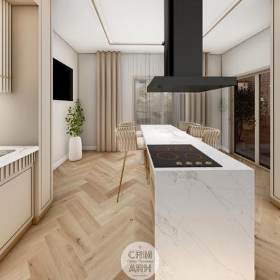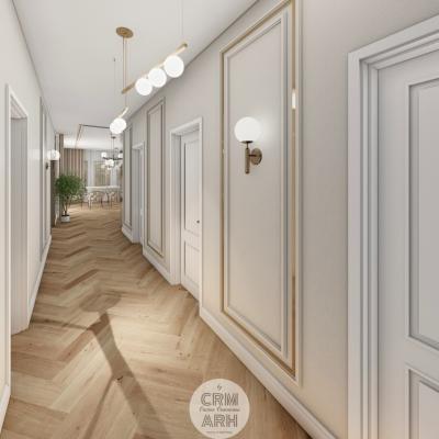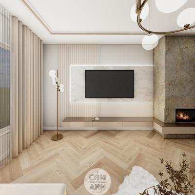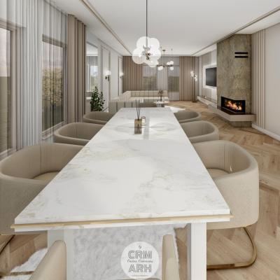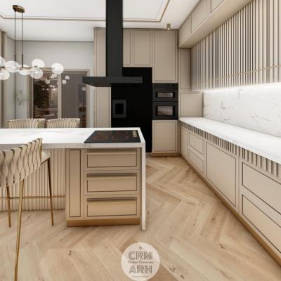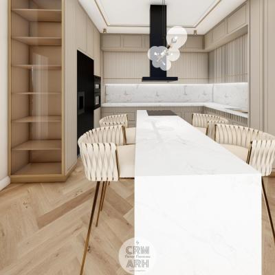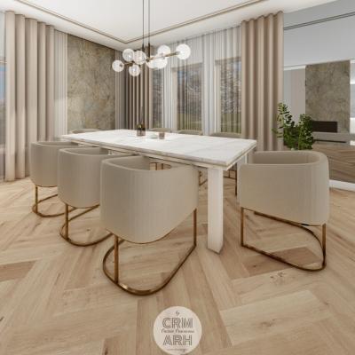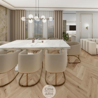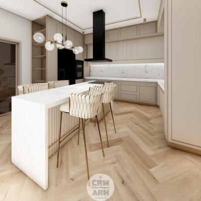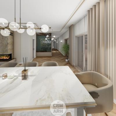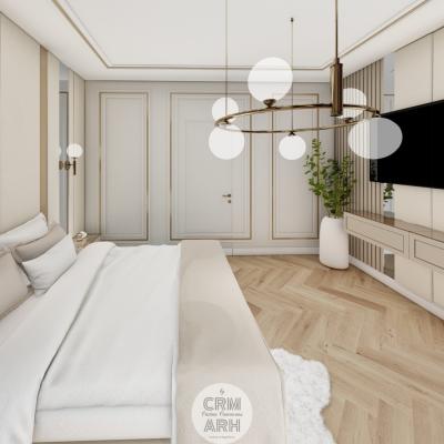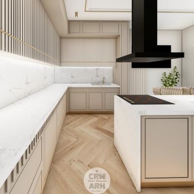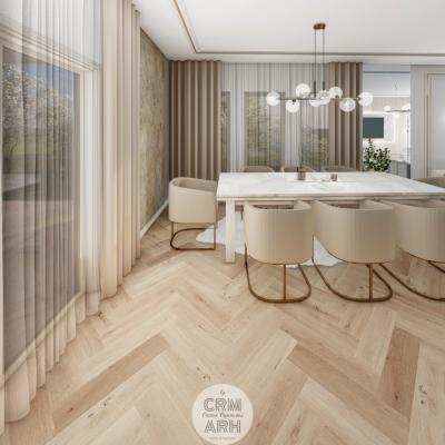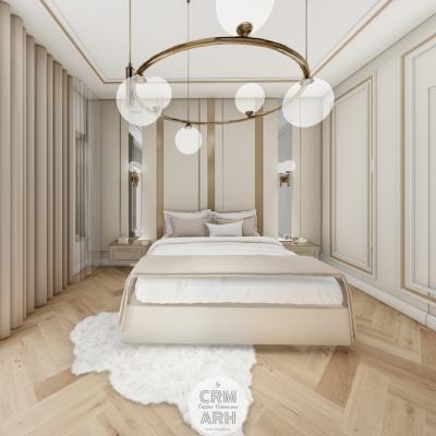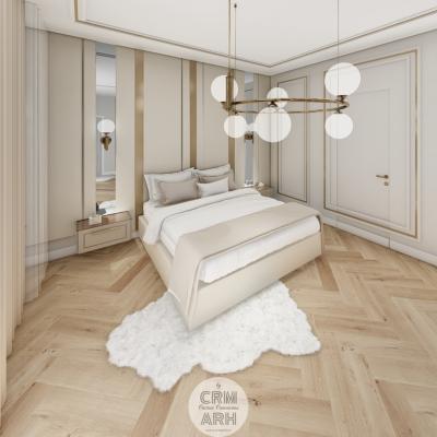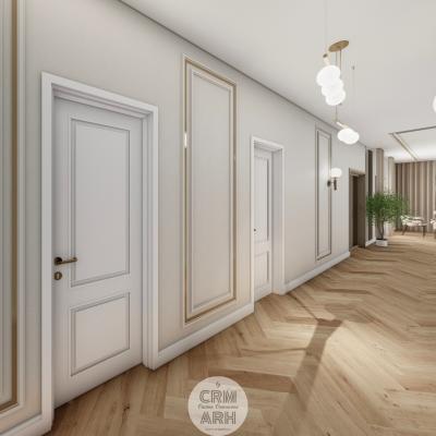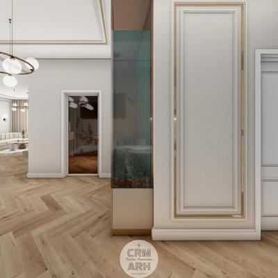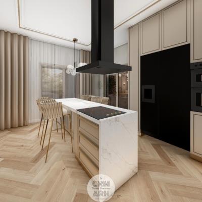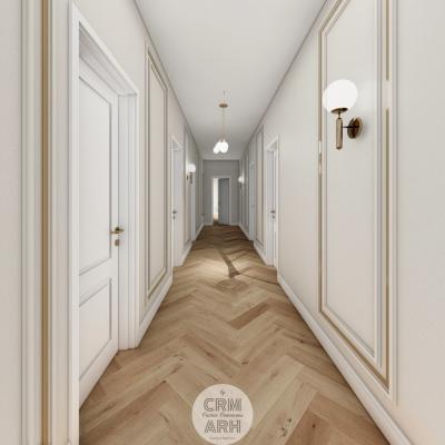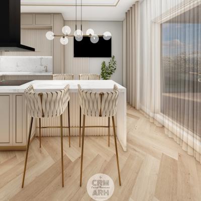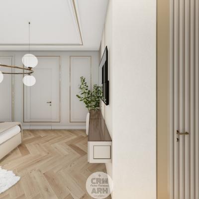 Un design de casă elegantă în nuanțe de bej și alb emană rafinament și echilibru, fiind o alegere atemporală care aduce luminozitate și armonie spațiilor. Pereții în tonuri calde de bej deschis sau crem sunt puși în valoare de profile decorative clasice albe, care conturează subtil pereții, tavanele și ușile. Aceste detalii adaugă profunzime și eleganță fără a încărca vizual. Podelele din parchet deschis, cu texturi naturale, completează perfect paleta cromatică, iar textilele fine — catifea, in sau bumbac premium — întregesc atmosfera sofisticată. Elementele moderne precum riflajele din lemn natur sau vopsite alb aduc un contrast rafinat și o notă de actualitate, în timp ce oglinzile decorative amplifică lumina și spațiul, oferind reflexii spectaculoase.