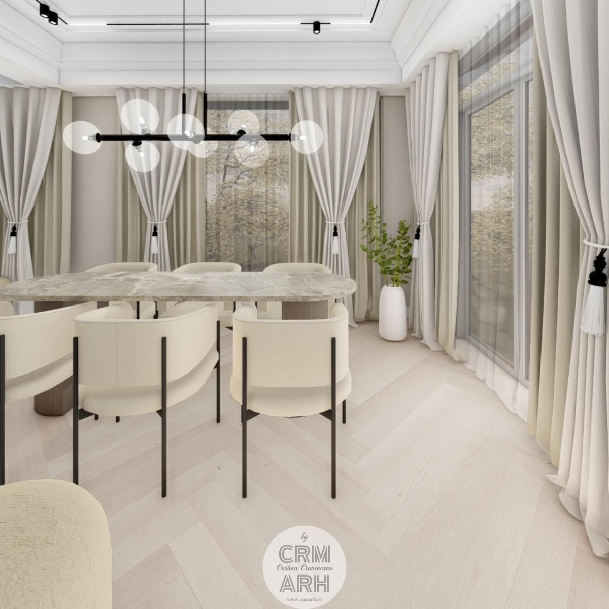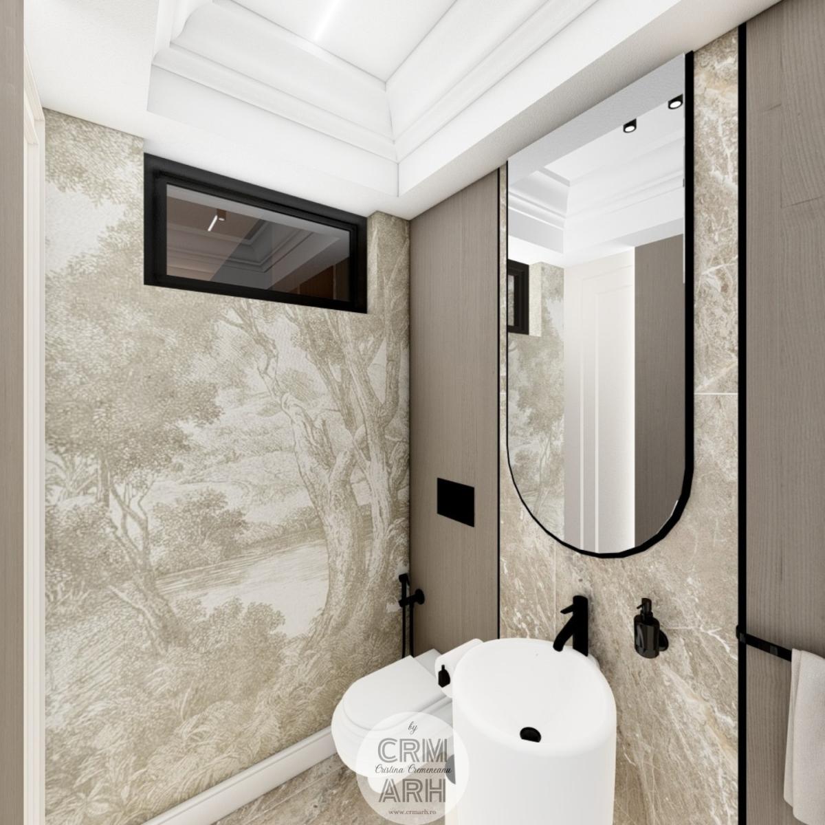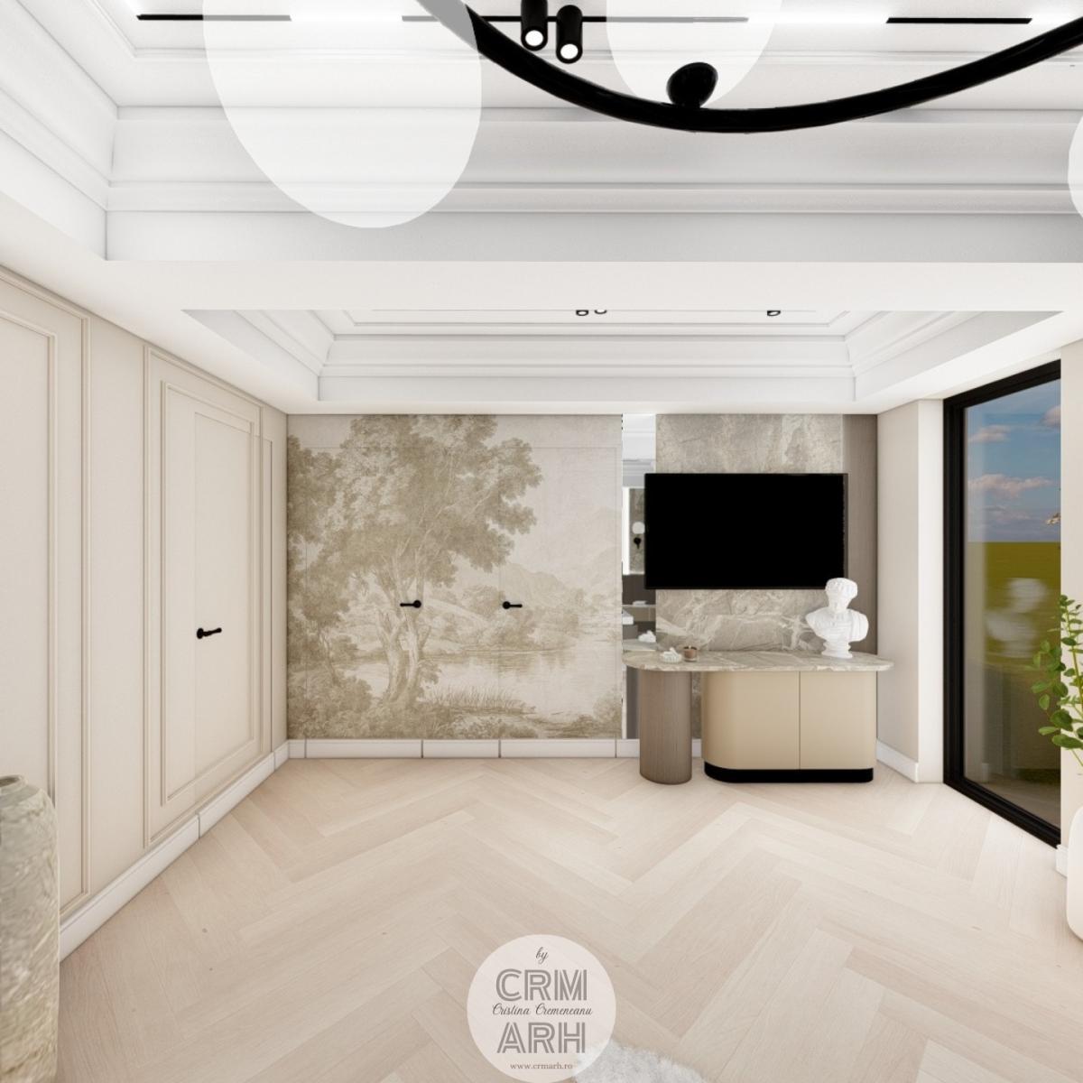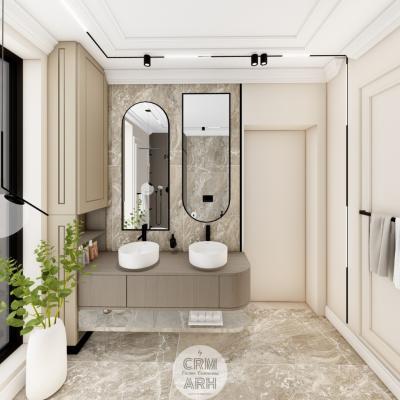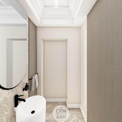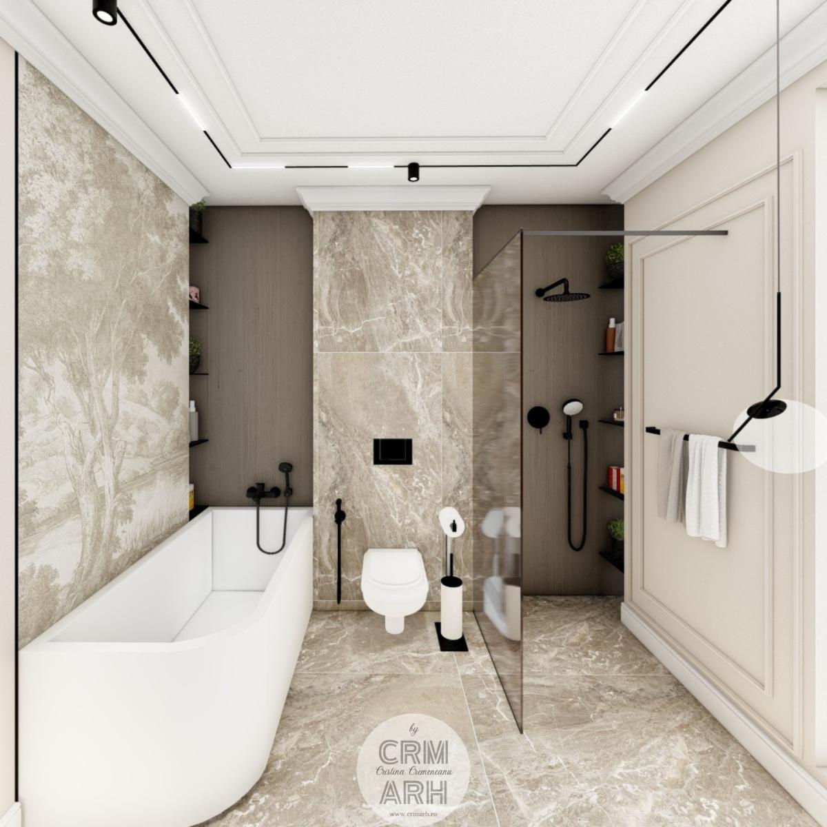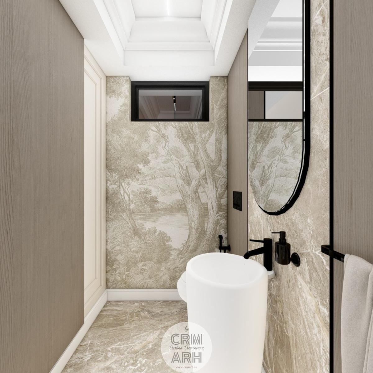 În această amenajare, nuanțele de bej domină spațiul, creând o bază caldă, luminoasă și echilibrată. Texturile moi ale pereților și finisajele fine ale mobilierului sunt puse în valoare de tonurile naturale de lemn, care adaugă profunzime și confort vizual. Pentru a echilibra armonia cromatică, intervin accentele metalice negre ,discrete, dar puternice, în picioarele mobilierului, mânere, rame de oglinzi sau corpurile de iluminat. Aceste detalii aduc o notă modernă și ancorează spațiul în prezent, fără a rupe eleganța clasică. Iluminatul cu globuri suspendate completează compoziția, subliniind atmosfera sofisticată și echilibrul dintre tradiție și modernitate.