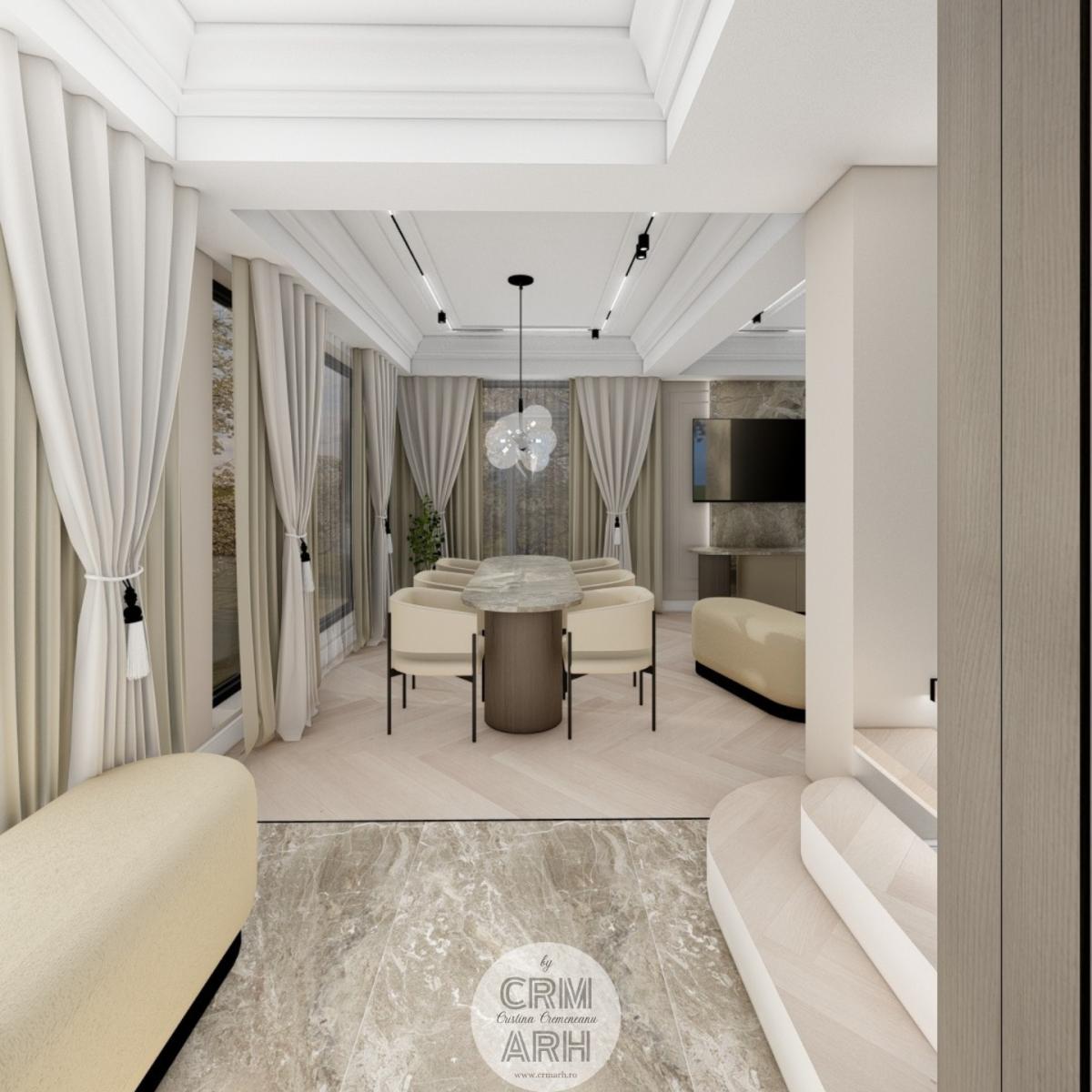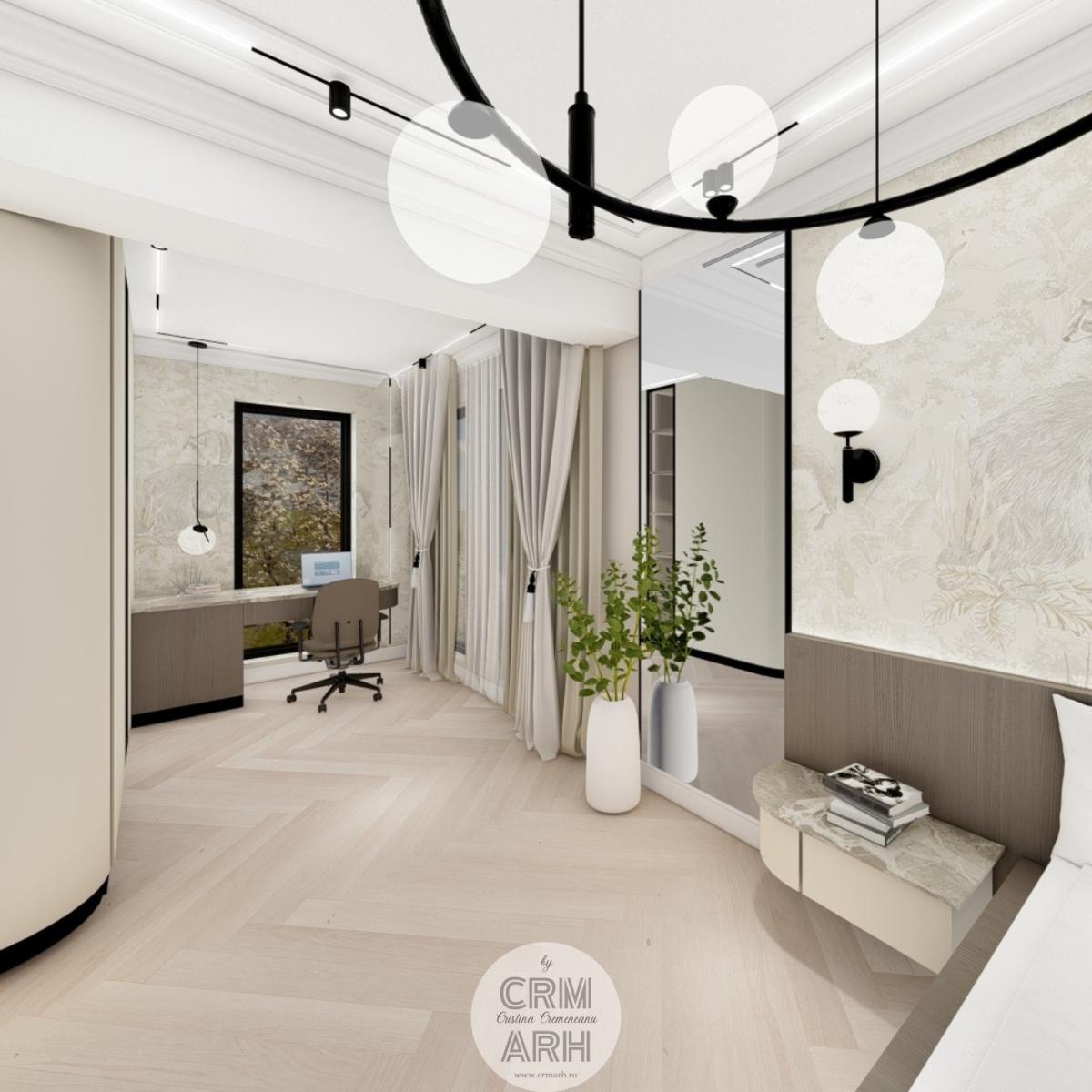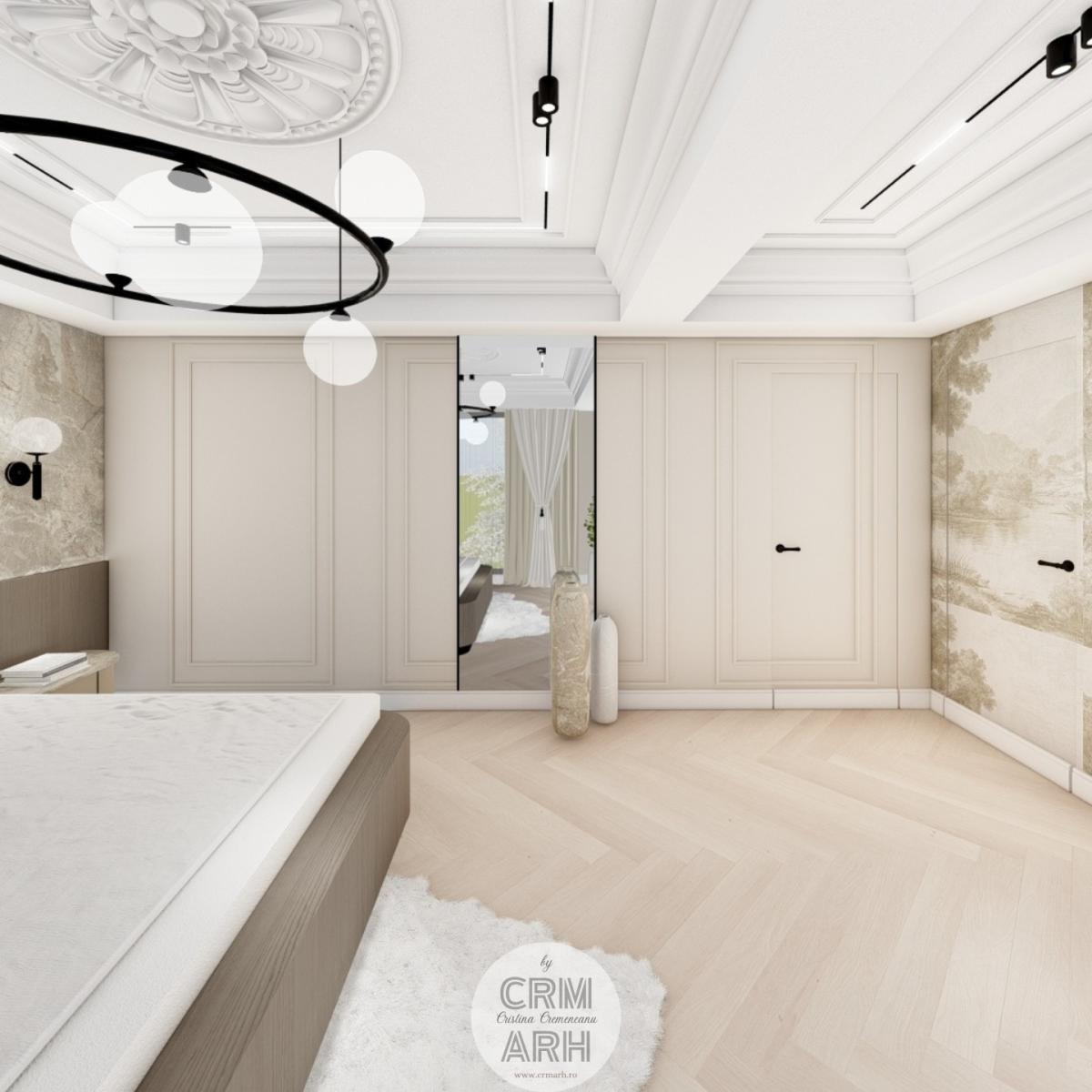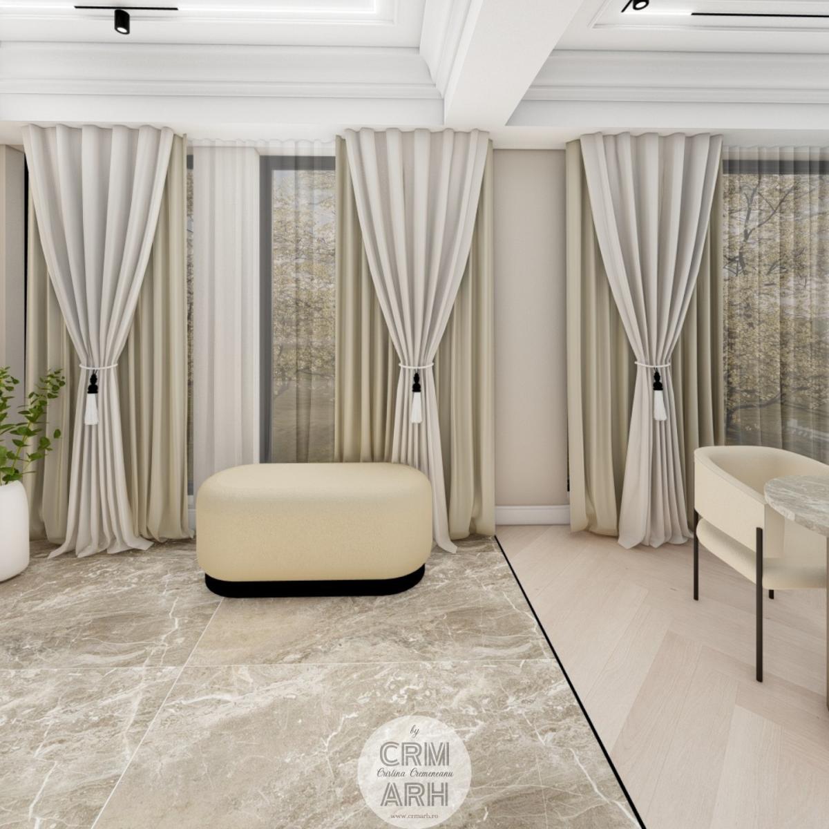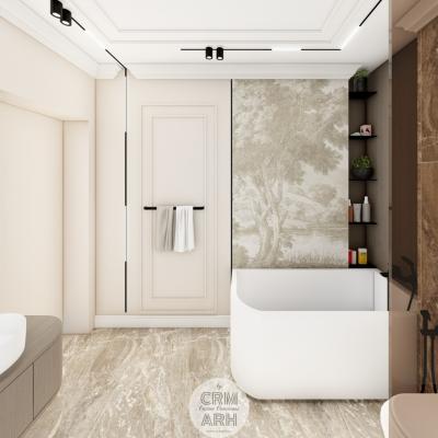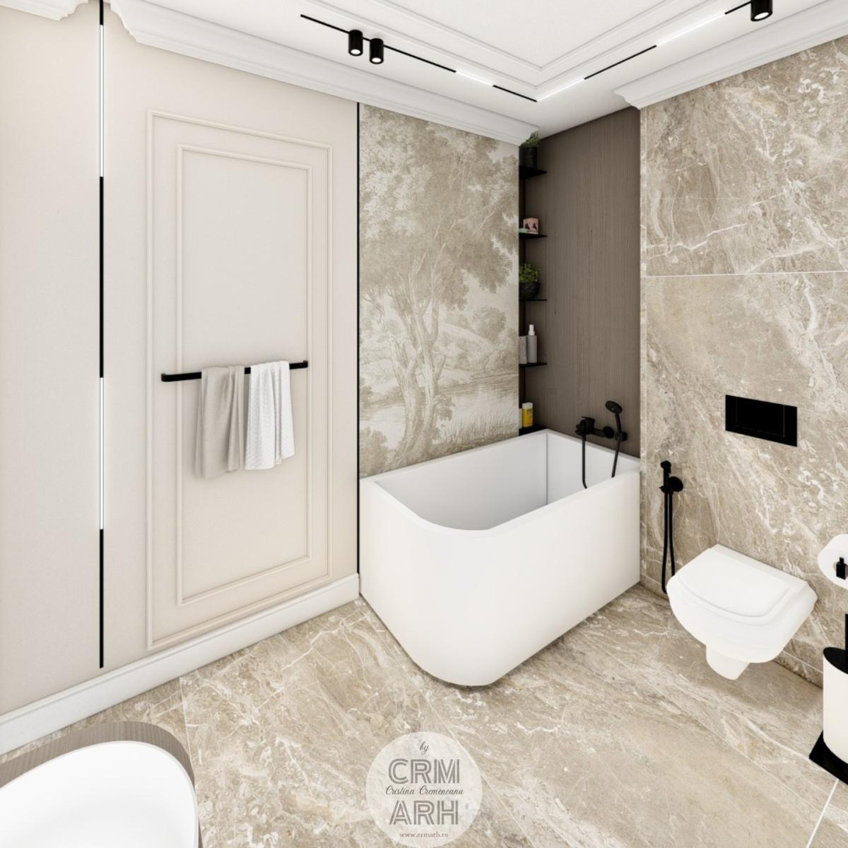 În această amenajare, nuanțele de bej domină spațiul, creând o bază caldă, luminoasă și echilibrată. Texturile moi ale pereților și finisajele fine ale mobilierului sunt puse în valoare de tonurile naturale de lemn, care adaugă profunzime și confort vizual. Pentru a echilibra armonia cromatică, intervin accentele metalice negre ,discrete, dar puternice, în picioarele mobilierului, mânere, rame de oglinzi sau corpurile de iluminat. Aceste detalii aduc o notă modernă și ancorează spațiul în prezent, fără a rupe eleganța clasică. Iluminatul cu globuri suspendate completează compoziția, subliniind atmosfera sofisticată și echilibrul dintre tradiție și modernitate.