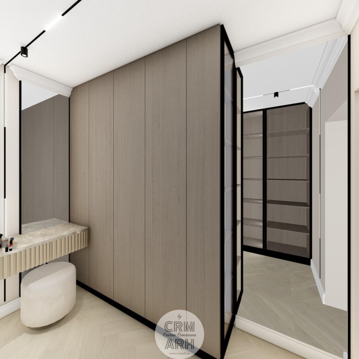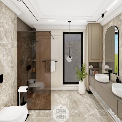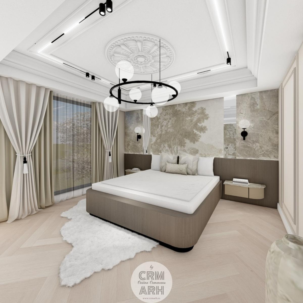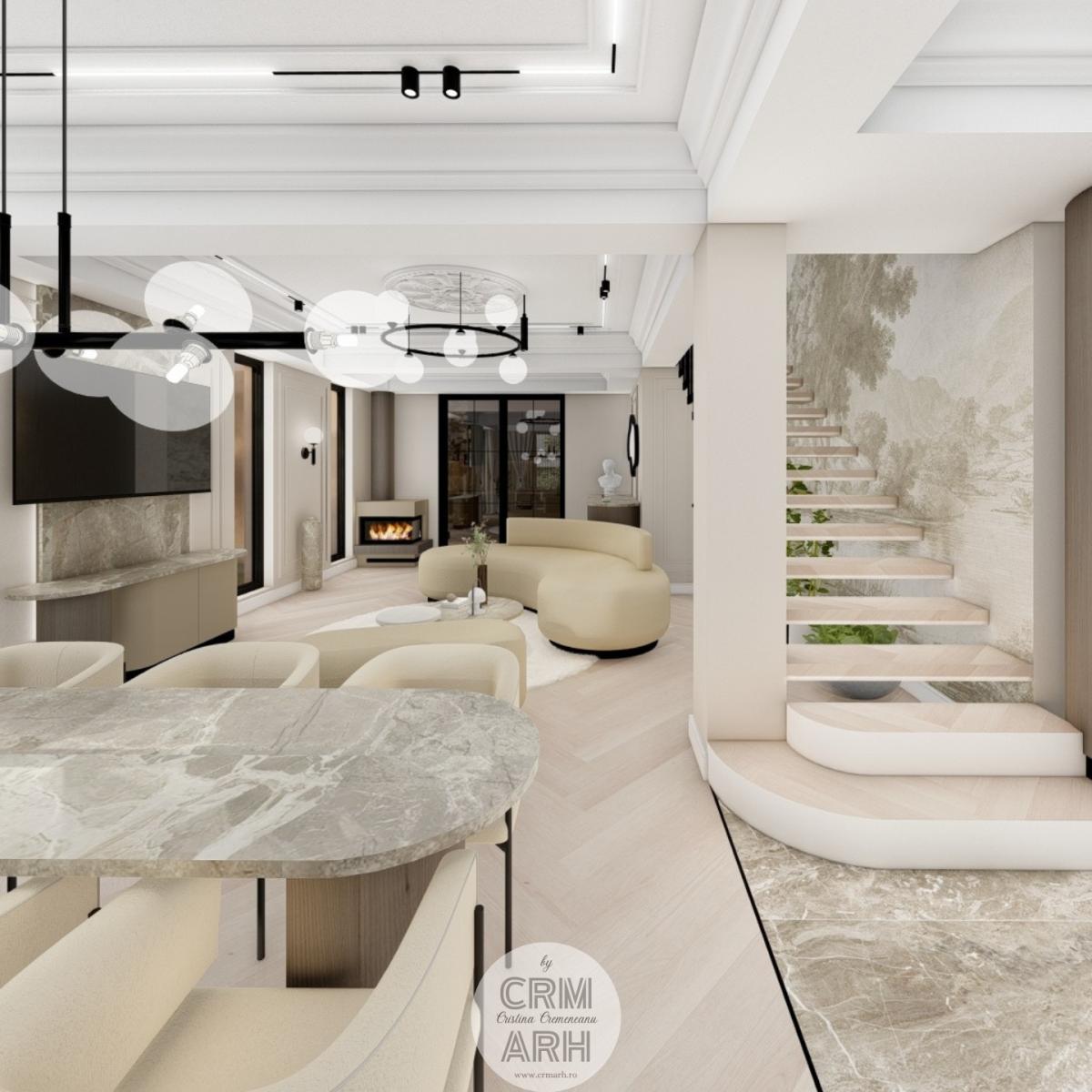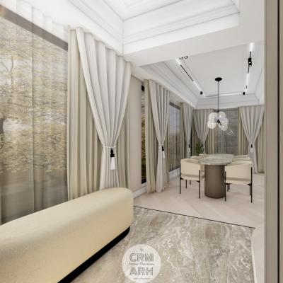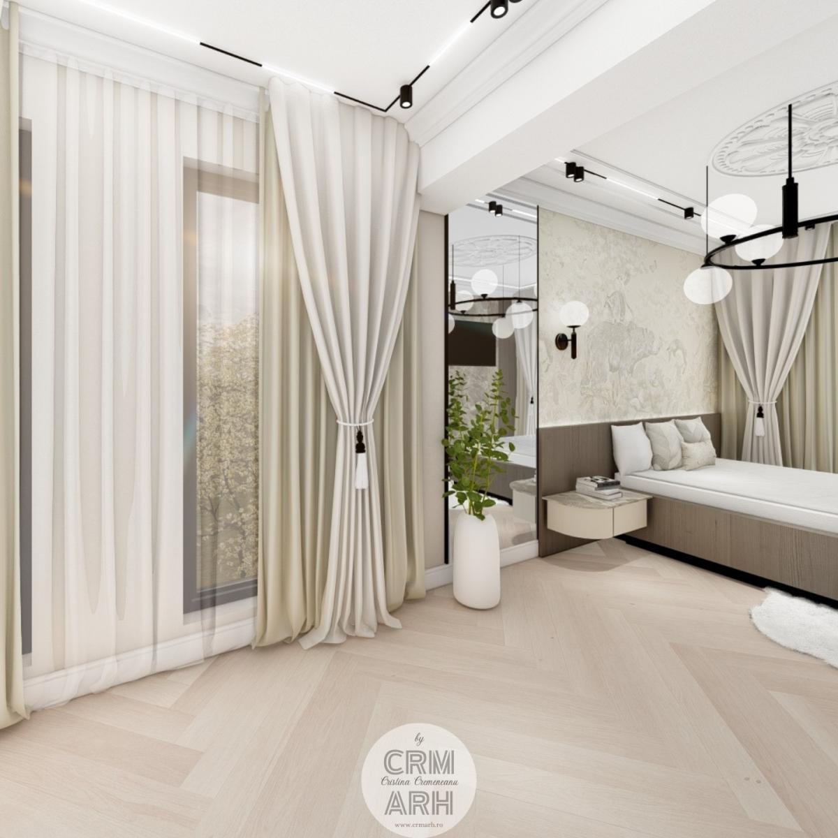 În această amenajare, nuanțele de bej domină spațiul, creând o bază caldă, luminoasă și echilibrată. Texturile moi ale pereților și finisajele fine ale mobilierului sunt puse în valoare de tonurile naturale de lemn, care adaugă profunzime și confort vizual. Pentru a echilibra armonia cromatică, intervin accentele metalice negre ,discrete, dar puternice, în picioarele mobilierului, mânere, rame de oglinzi sau corpurile de iluminat. Aceste detalii aduc o notă modernă și ancorează spațiul în prezent, fără a rupe eleganța clasică. Iluminatul cu globuri suspendate completează compoziția, subliniind atmosfera sofisticată și echilibrul dintre tradiție și modernitate.