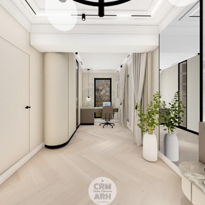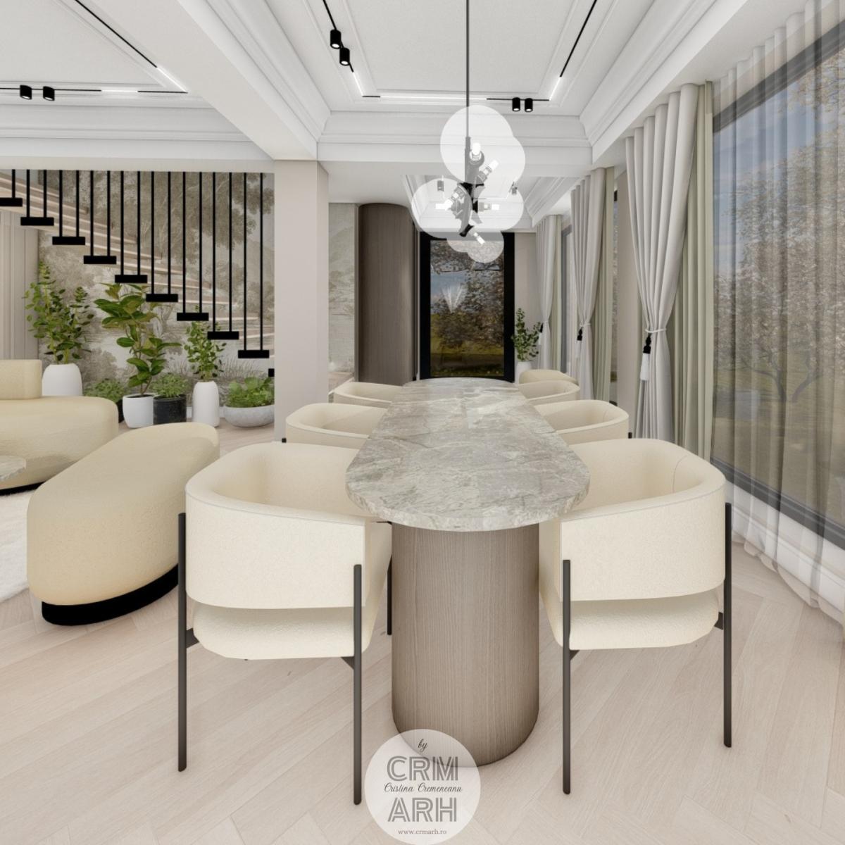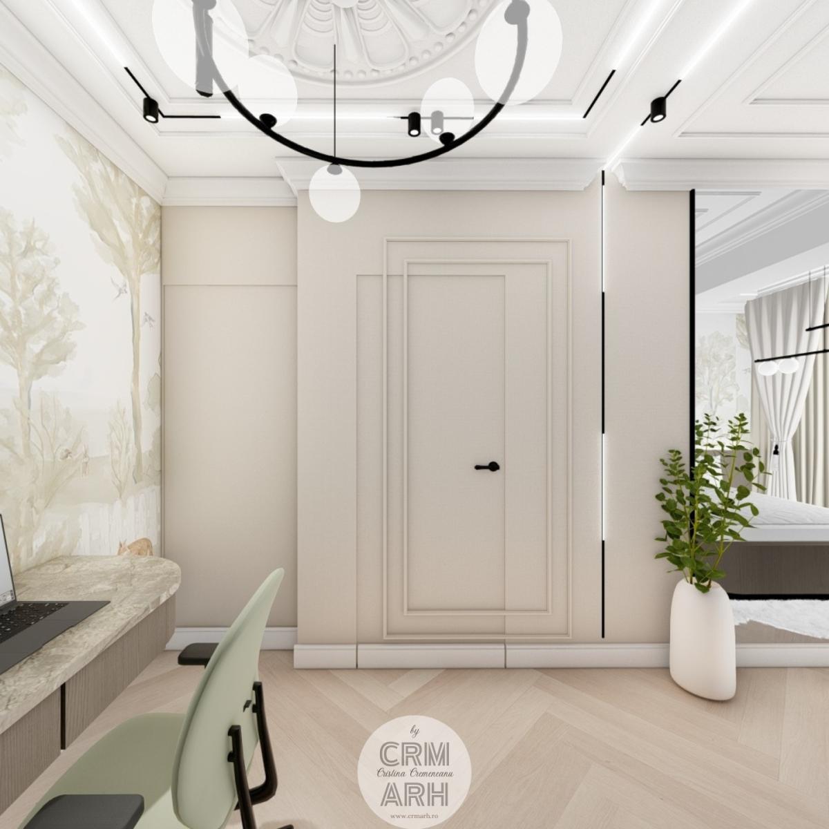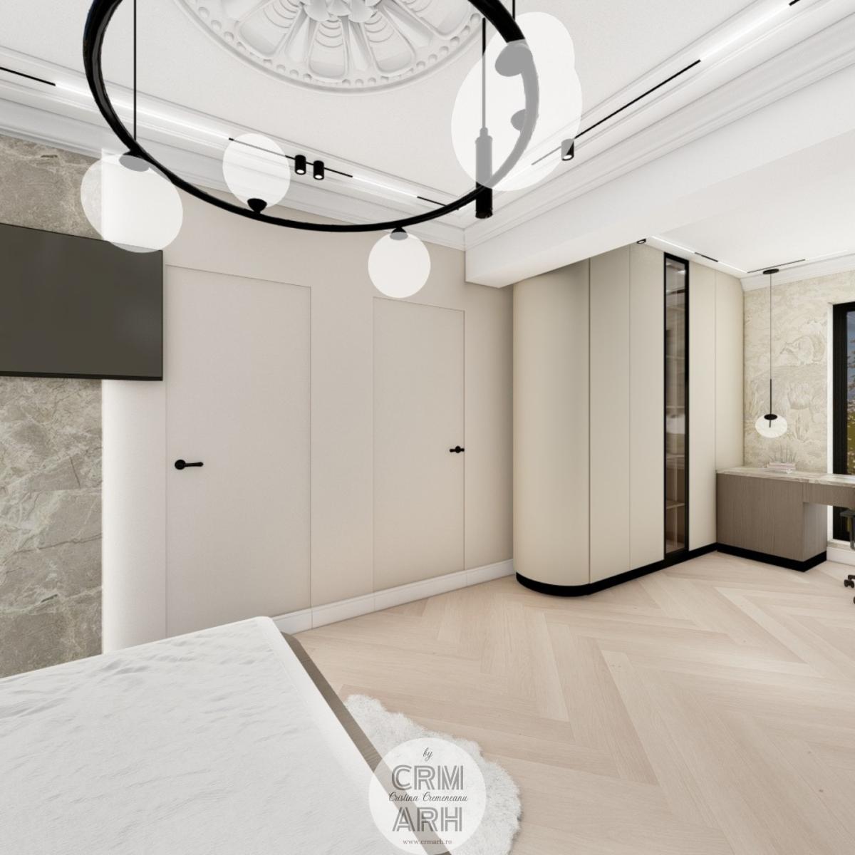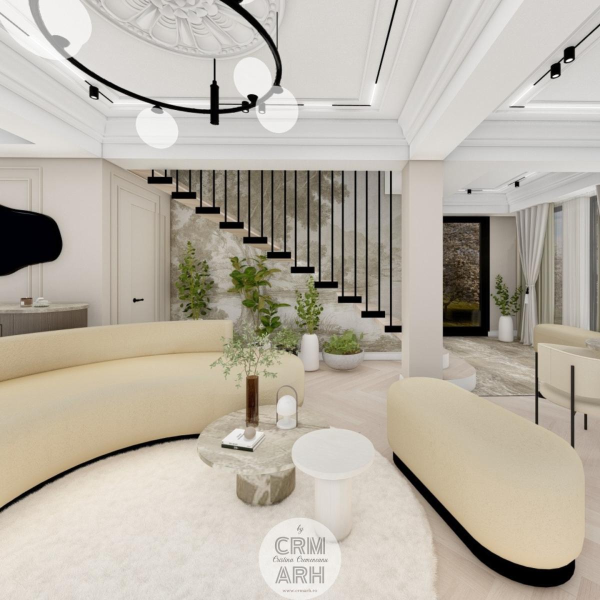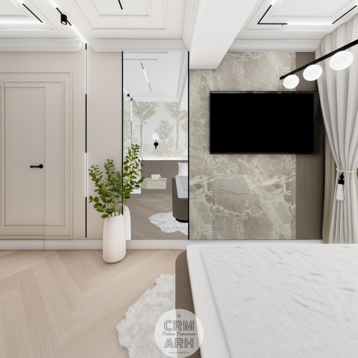 În această amenajare, nuanțele de bej domină spațiul, creând o bază caldă, luminoasă și echilibrată. Texturile moi ale pereților și finisajele fine ale mobilierului sunt puse în valoare de tonurile naturale de lemn, care adaugă profunzime și confort vizual. Pentru a echilibra armonia cromatică, intervin accentele metalice negre ,discrete, dar puternice, în picioarele mobilierului, mânere, rame de oglinzi sau corpurile de iluminat. Aceste detalii aduc o notă modernă și ancorează spațiul în prezent, fără a rupe eleganța clasică. Iluminatul cu globuri suspendate completează compoziția, subliniind atmosfera sofisticată și echilibrul dintre tradiție și modernitate.