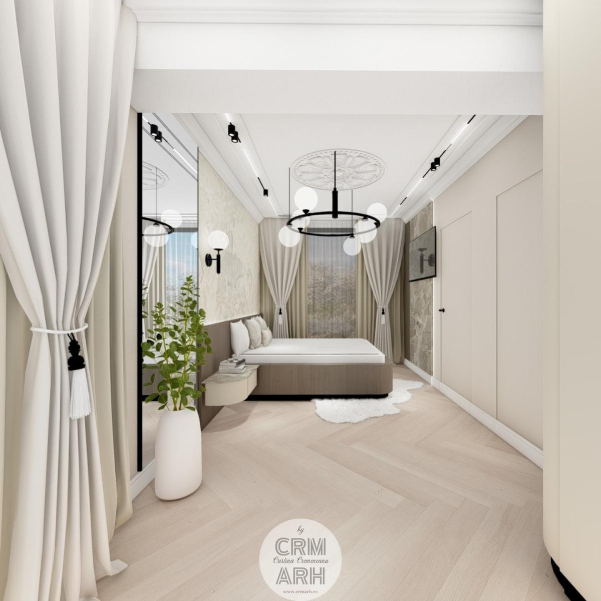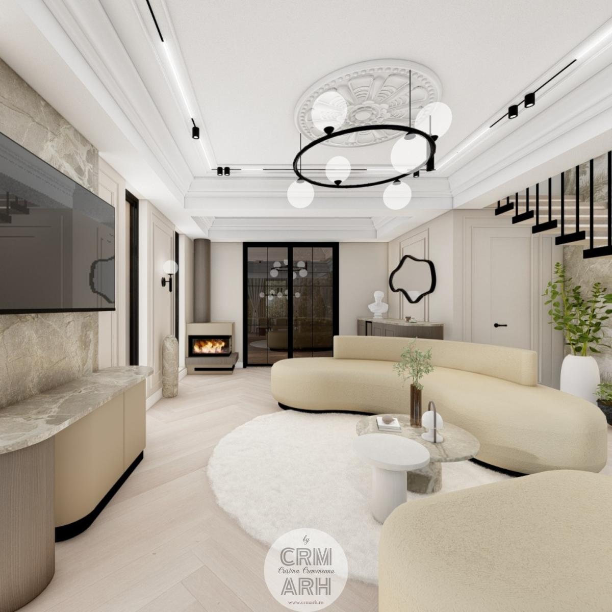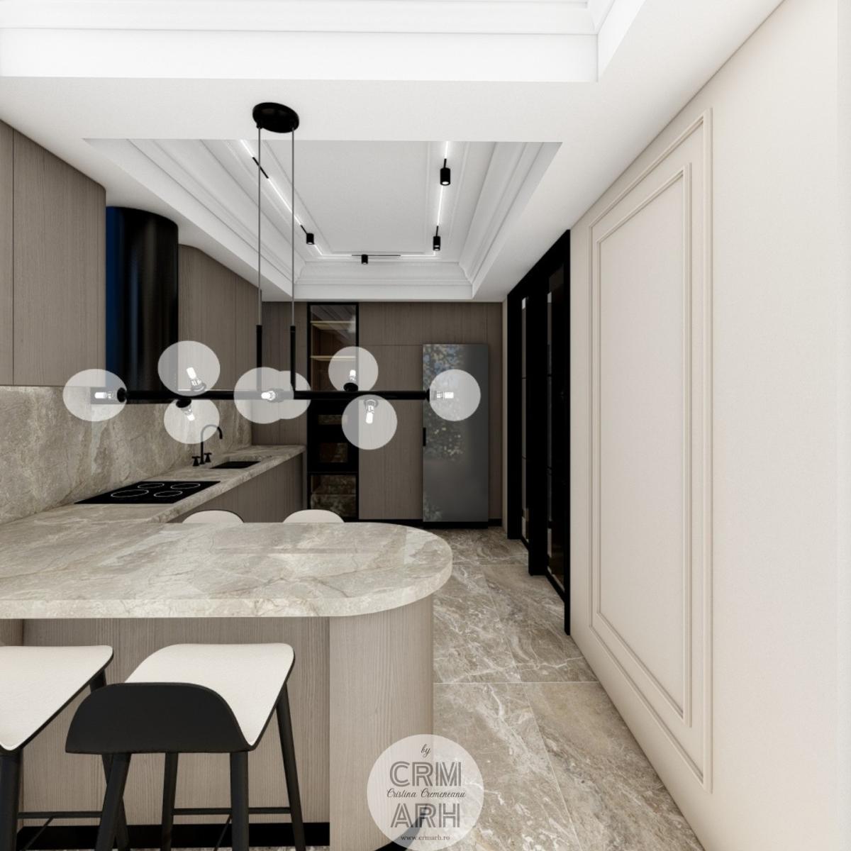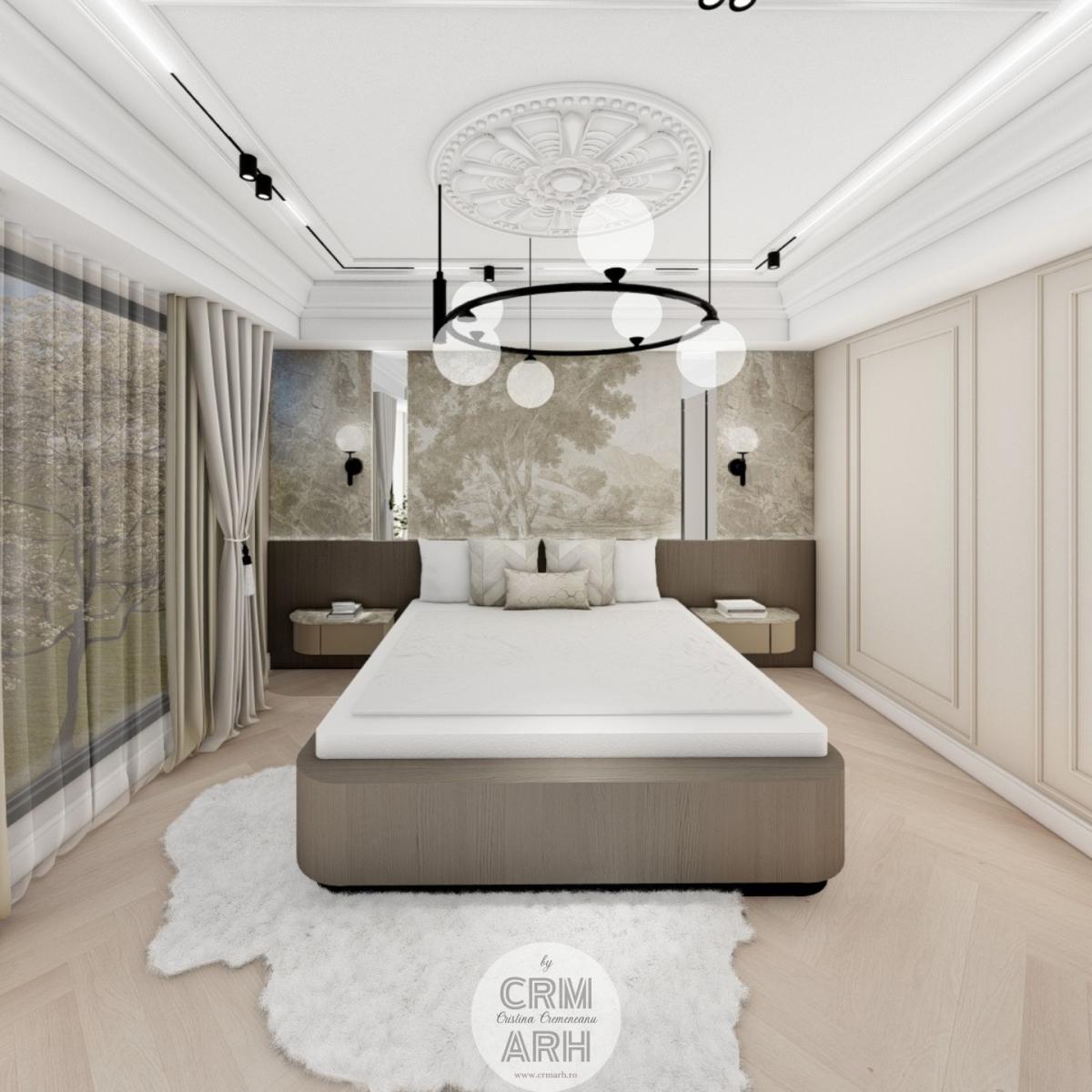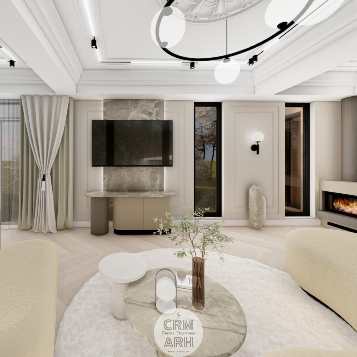 În această amenajare, nuanțele de bej domină spațiul, creând o bază caldă, luminoasă și echilibrată. Texturile moi ale pereților și finisajele fine ale mobilierului sunt puse în valoare de tonurile naturale de lemn, care adaugă profunzime și confort vizual. Pentru a echilibra armonia cromatică, intervin accentele metalice negre ,discrete, dar puternice, în picioarele mobilierului, mânere, rame de oglinzi sau corpurile de iluminat. Aceste detalii aduc o notă modernă și ancorează spațiul în prezent, fără a rupe eleganța clasică. Iluminatul cu globuri suspendate completează compoziția, subliniind atmosfera sofisticată și echilibrul dintre tradiție și modernitate.