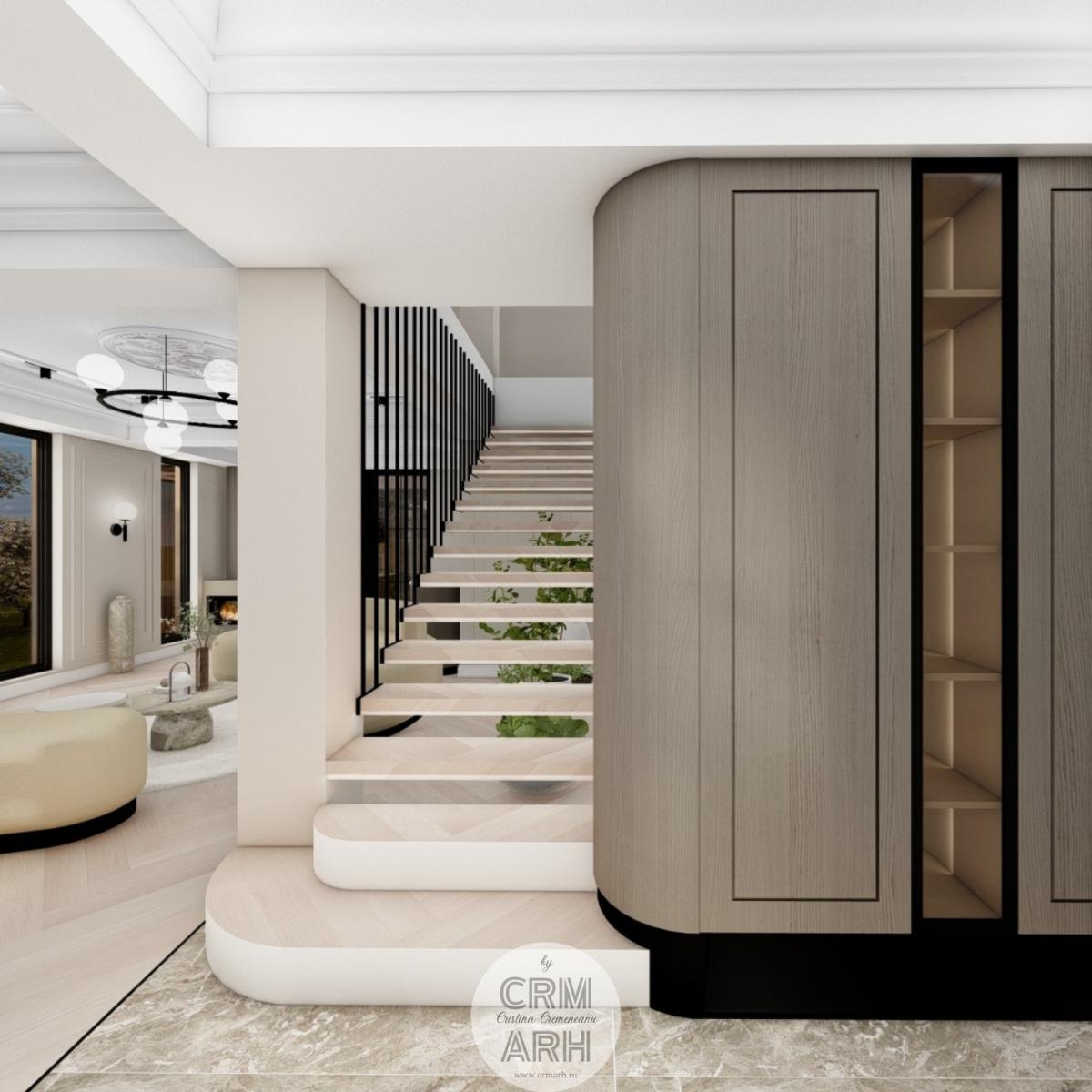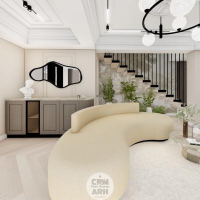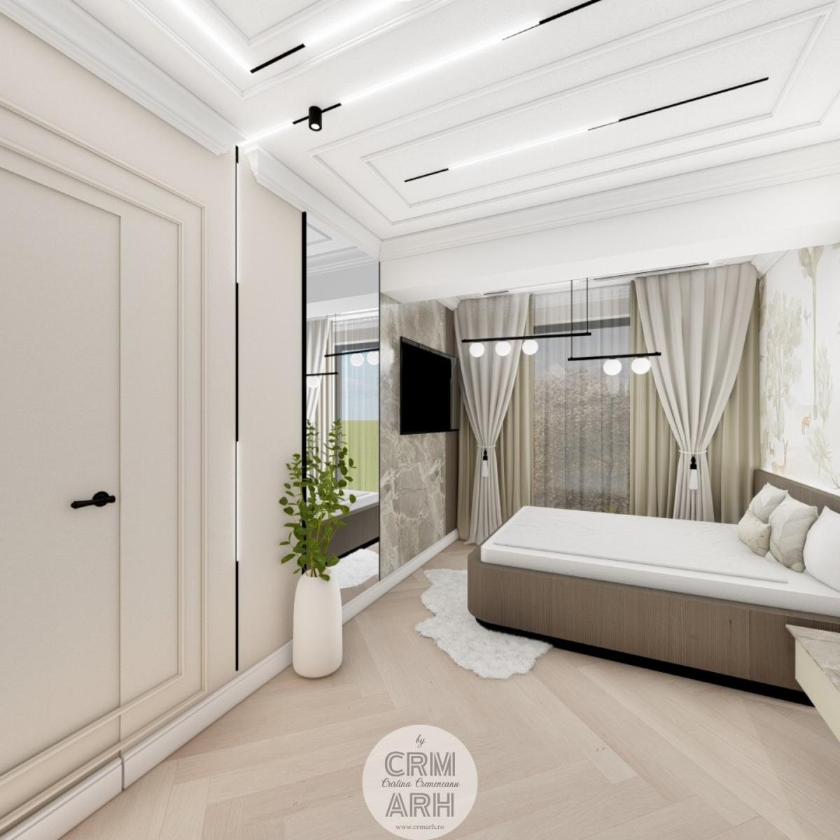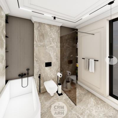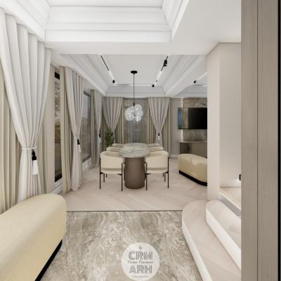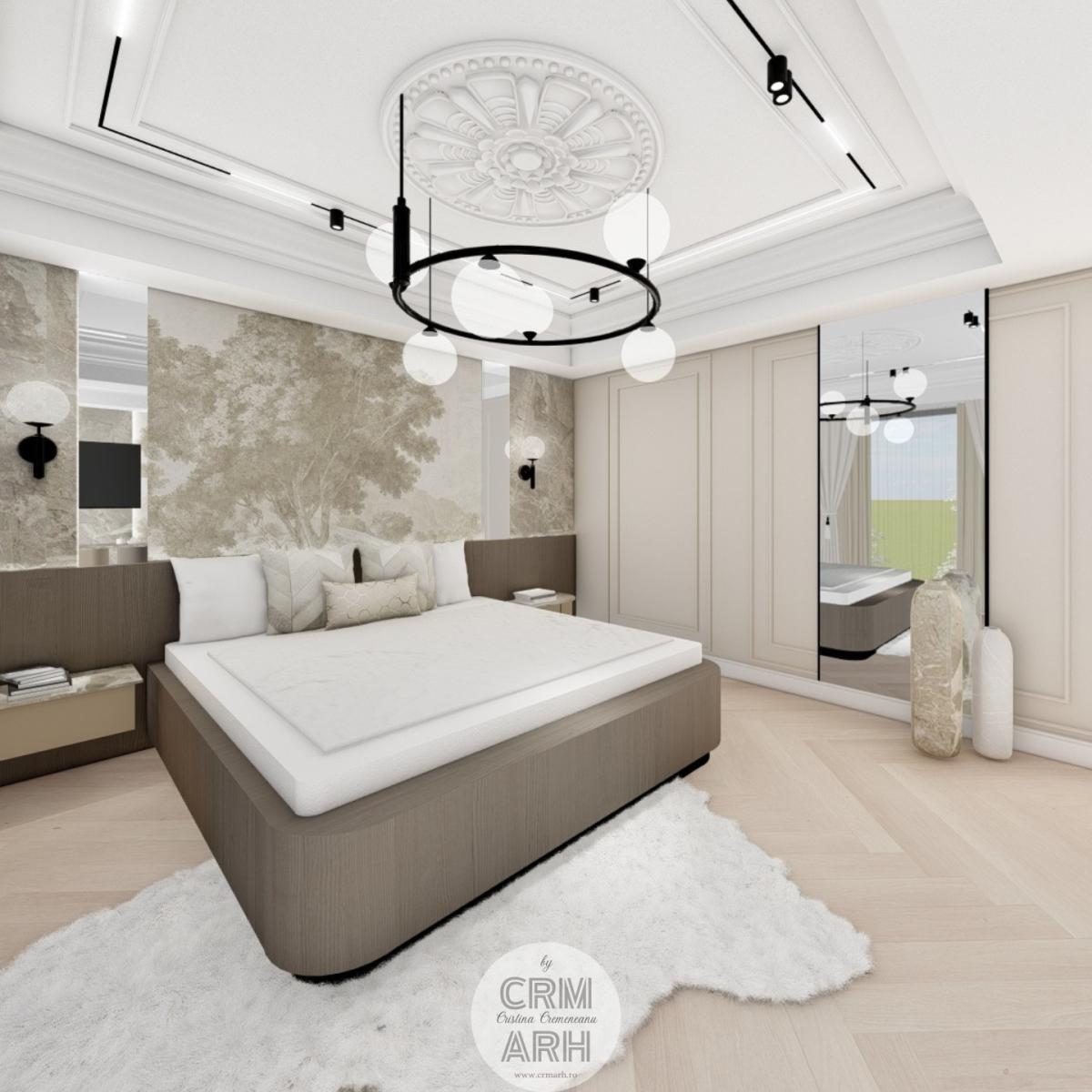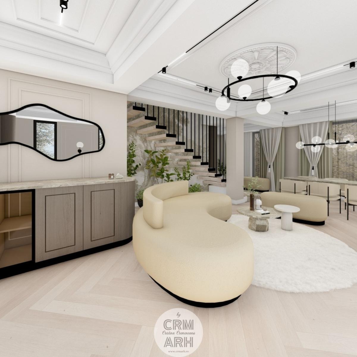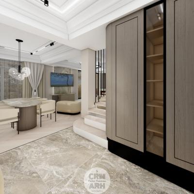 În această amenajare, nuanțele de bej domină spațiul, creând o bază caldă, luminoasă și echilibrată. Texturile moi ale pereților și finisajele fine ale mobilierului sunt puse în valoare de tonurile naturale de lemn, care adaugă profunzime și confort vizual. Pentru a echilibra armonia cromatică, intervin accentele metalice negre ,discrete, dar puternice, în picioarele mobilierului, mânere, rame de oglinzi sau corpurile de iluminat. Aceste detalii aduc o notă modernă și ancorează spațiul în prezent, fără a rupe eleganța clasică. Iluminatul cu globuri suspendate completează compoziția, subliniind atmosfera sofisticată și echilibrul dintre tradiție și modernitate.