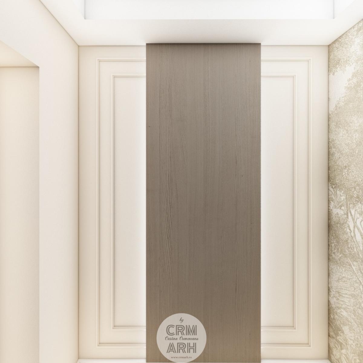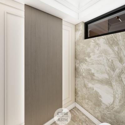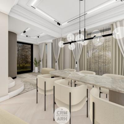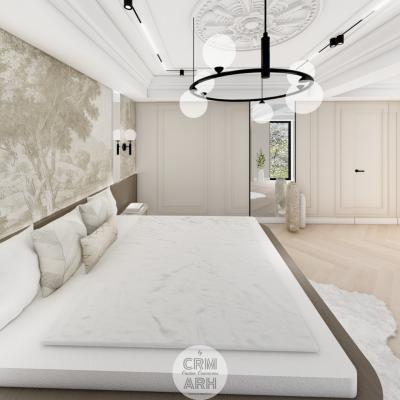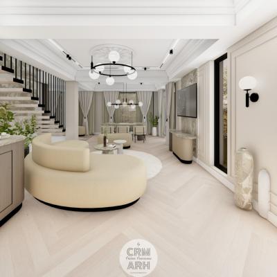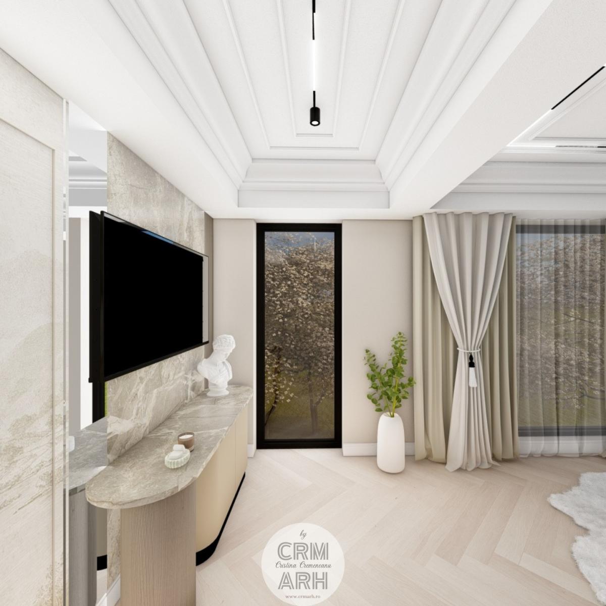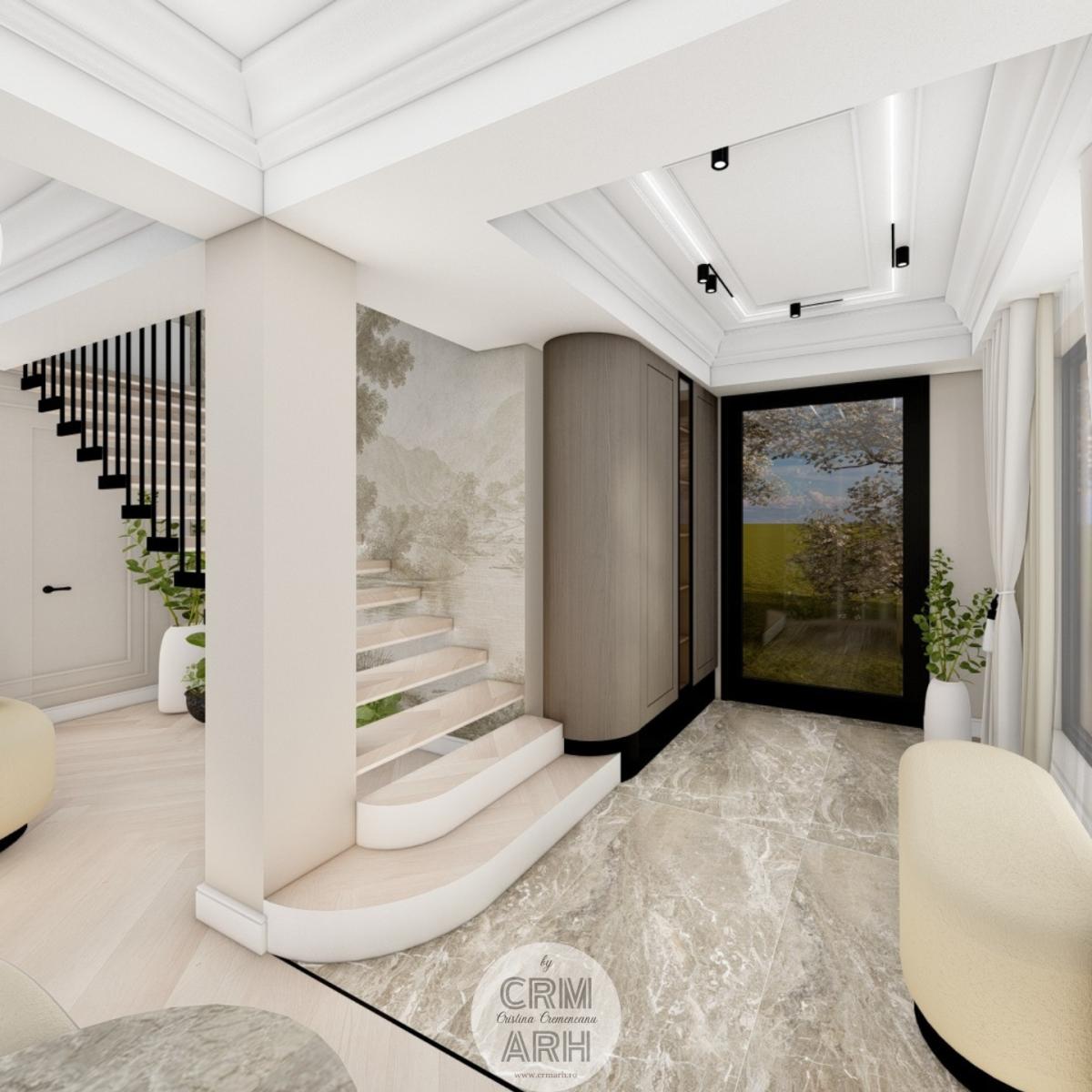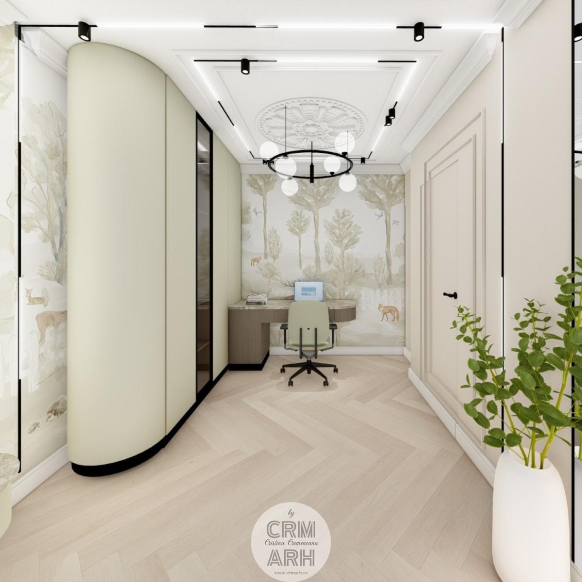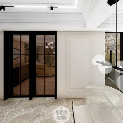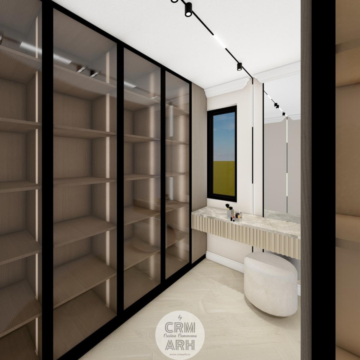 În această amenajare, nuanțele de bej domină spațiul, creând o bază caldă, luminoasă și echilibrată. Texturile moi ale pereților și finisajele fine ale mobilierului sunt puse în valoare de tonurile naturale de lemn, care adaugă profunzime și confort vizual. Pentru a echilibra armonia cromatică, intervin accentele metalice negre ,discrete, dar puternice, în picioarele mobilierului, mânere, rame de oglinzi sau corpurile de iluminat. Aceste detalii aduc o notă modernă și ancorează spațiul în prezent, fără a rupe eleganța clasică. Iluminatul cu globuri suspendate completează compoziția, subliniind atmosfera sofisticată și echilibrul dintre tradiție și modernitate.