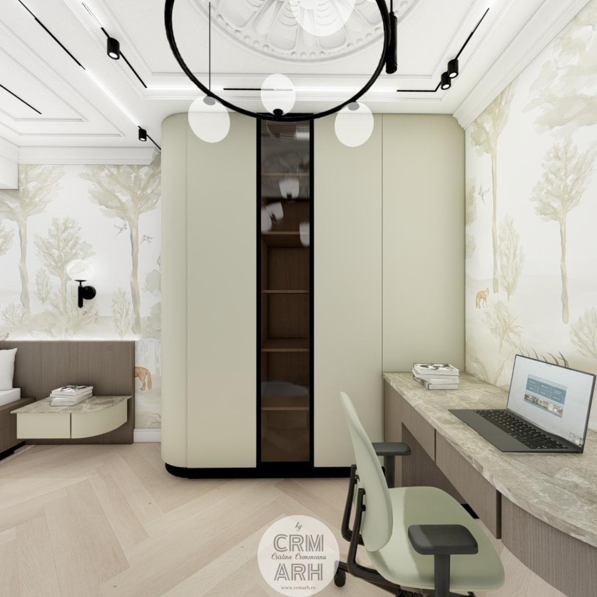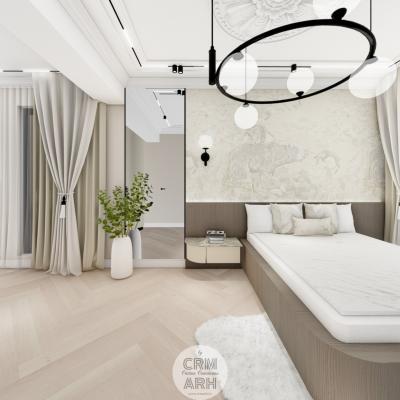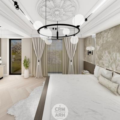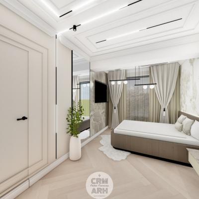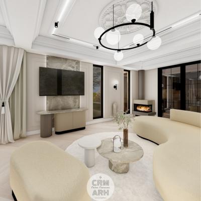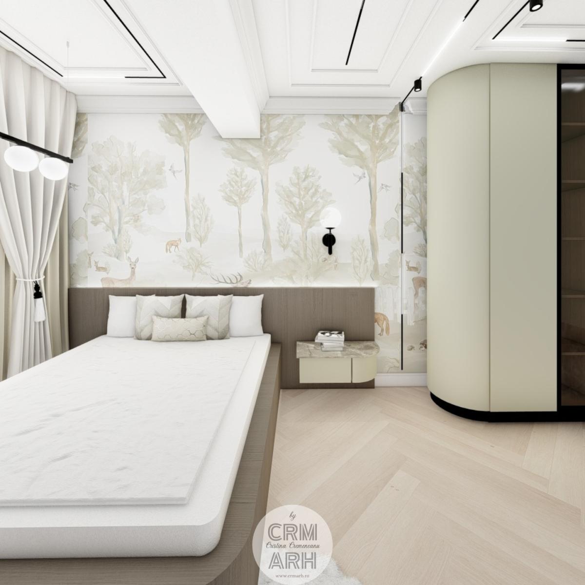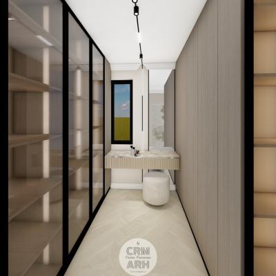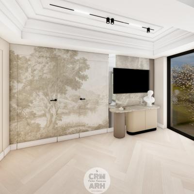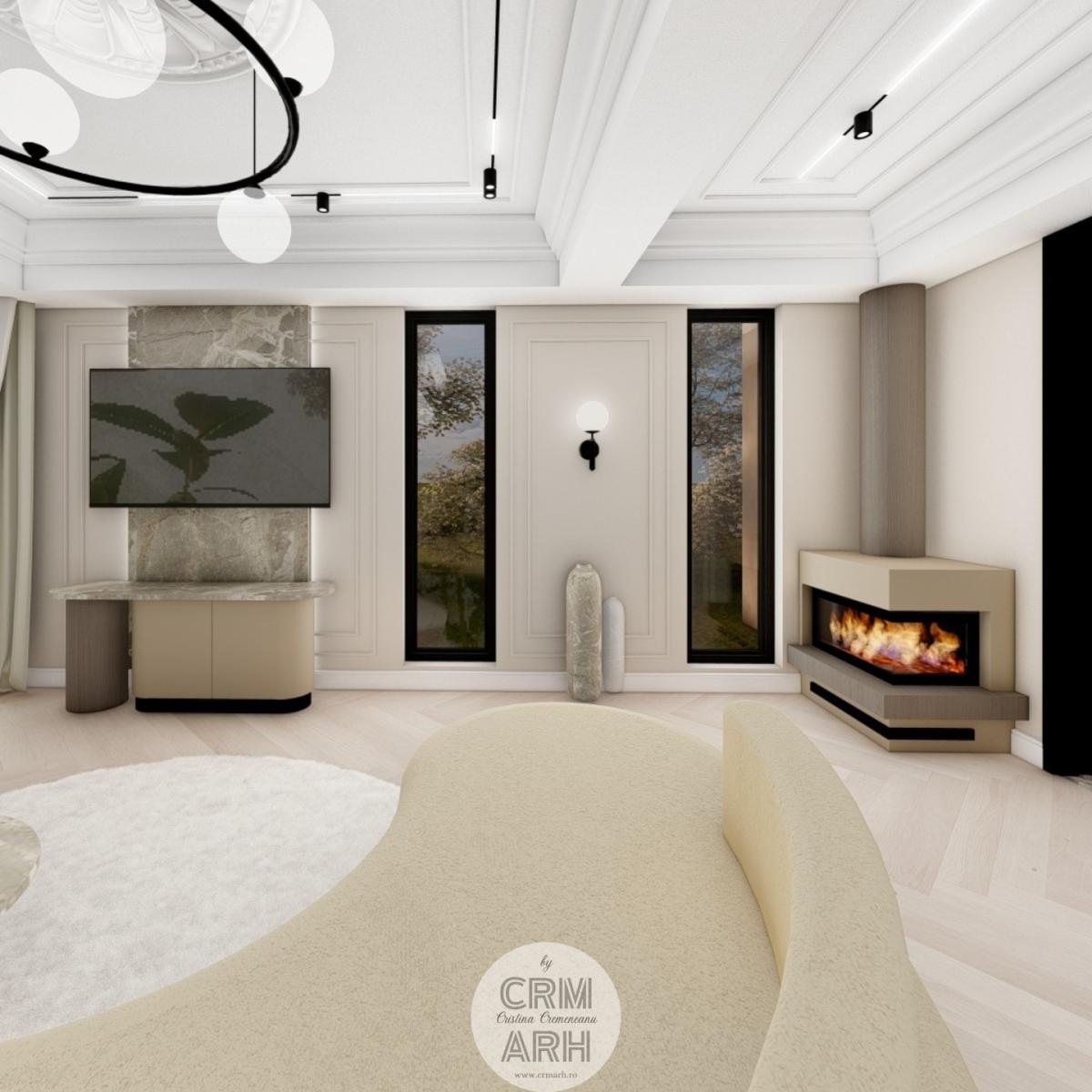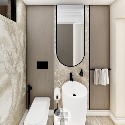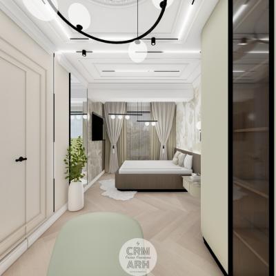 În această amenajare, nuanțele de bej domină spațiul, creând o bază caldă, luminoasă și echilibrată. Texturile moi ale pereților și finisajele fine ale mobilierului sunt puse în valoare de tonurile naturale de lemn, care adaugă profunzime și confort vizual. Pentru a echilibra armonia cromatică, intervin accentele metalice negre ,discrete, dar puternice, în picioarele mobilierului, mânere, rame de oglinzi sau corpurile de iluminat. Aceste detalii aduc o notă modernă și ancorează spațiul în prezent, fără a rupe eleganța clasică. Iluminatul cu globuri suspendate completează compoziția, subliniind atmosfera sofisticată și echilibrul dintre tradiție și modernitate.