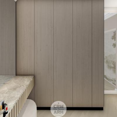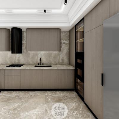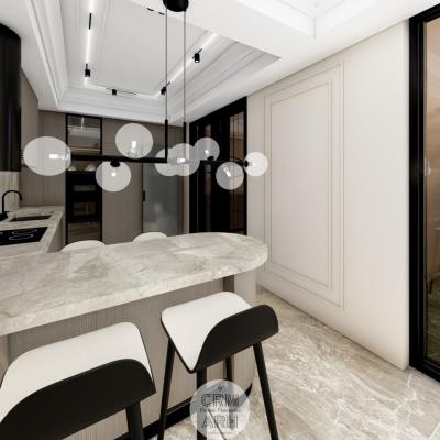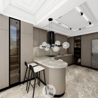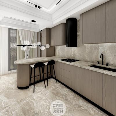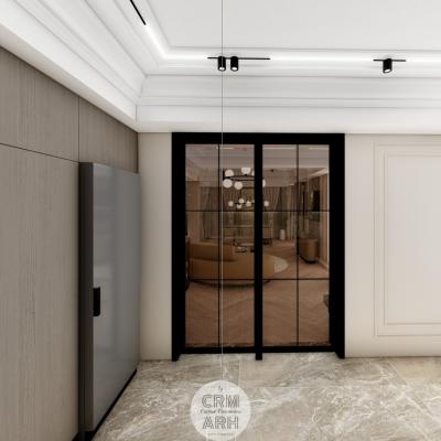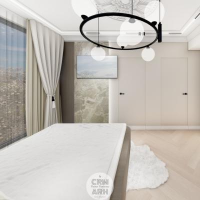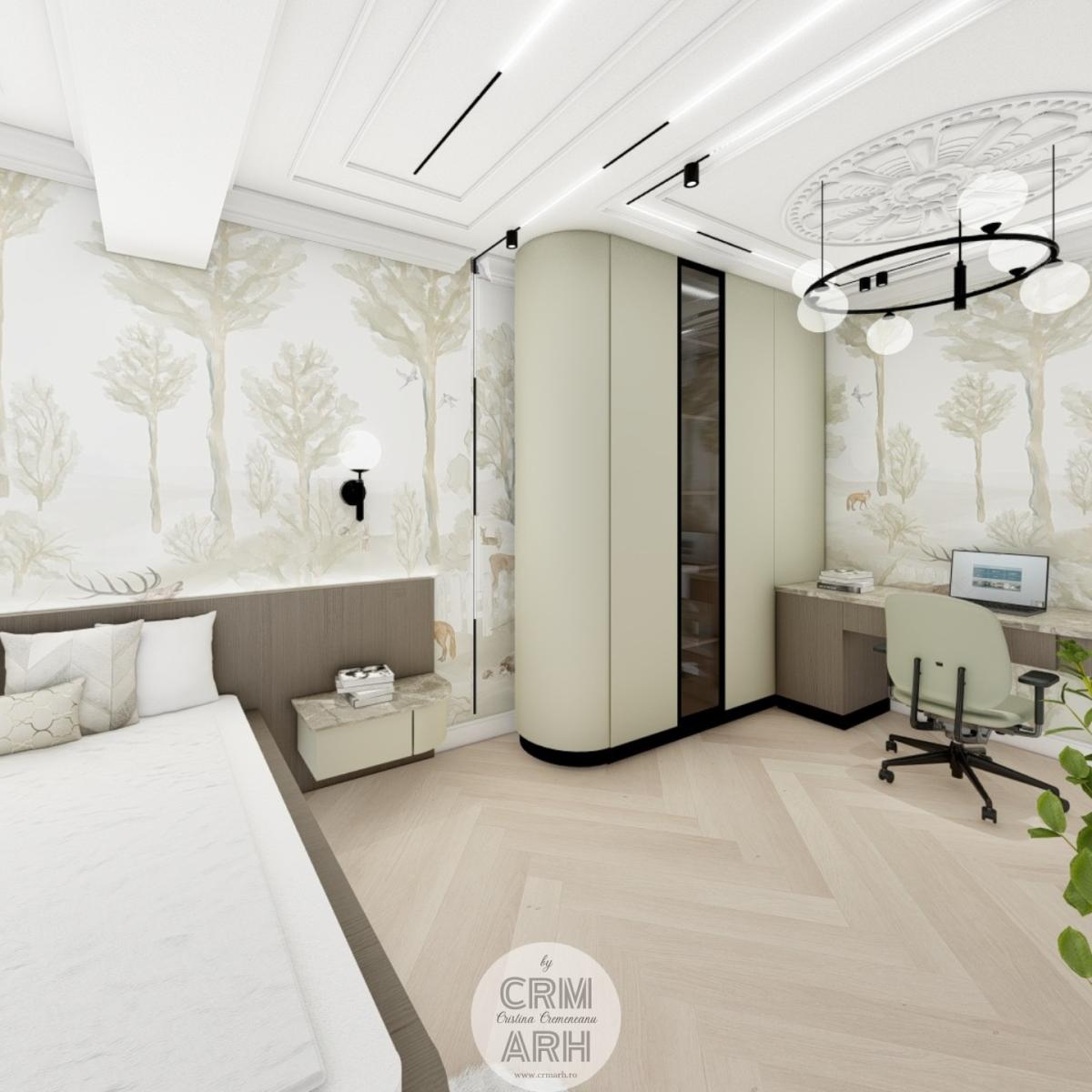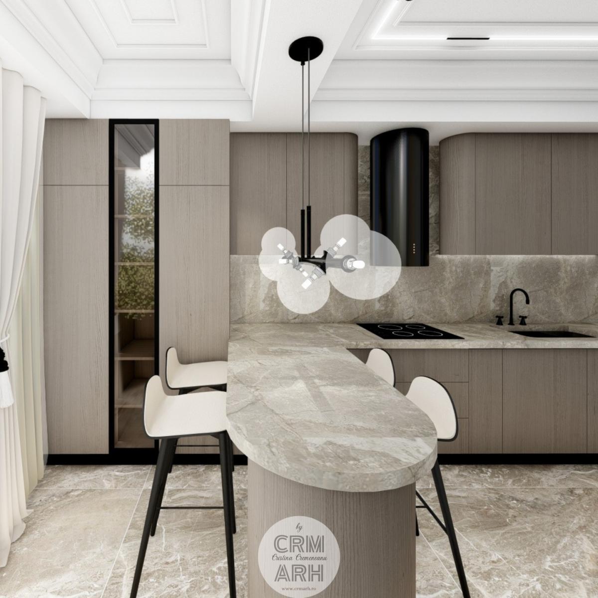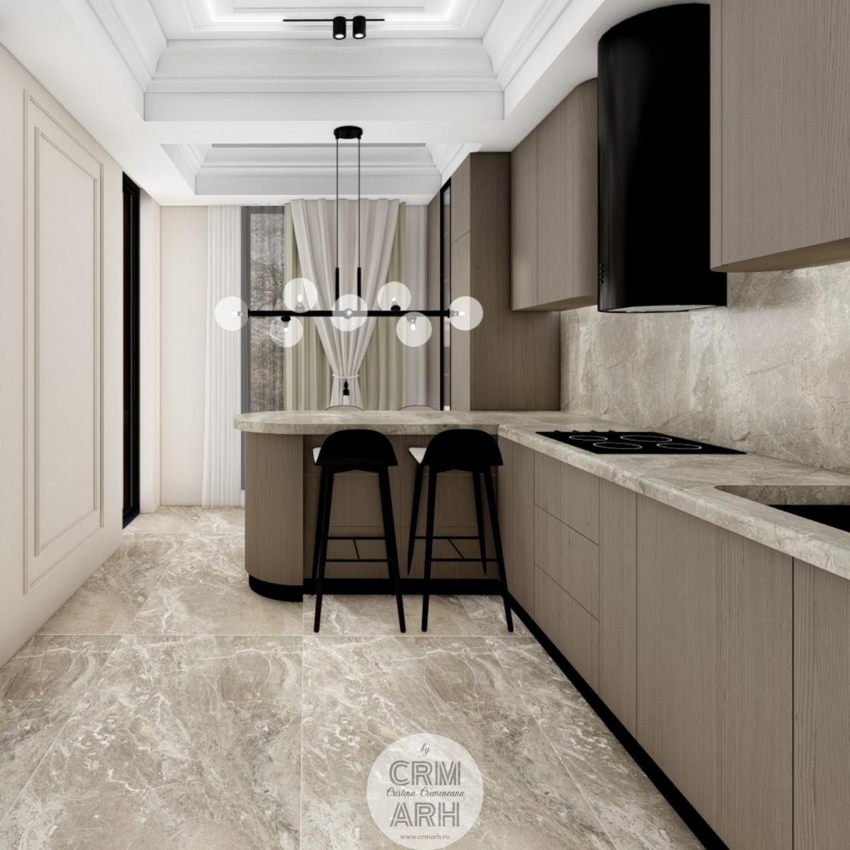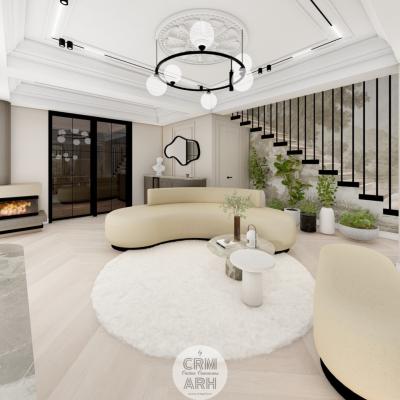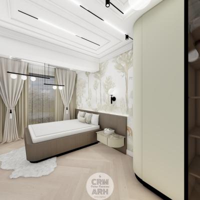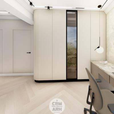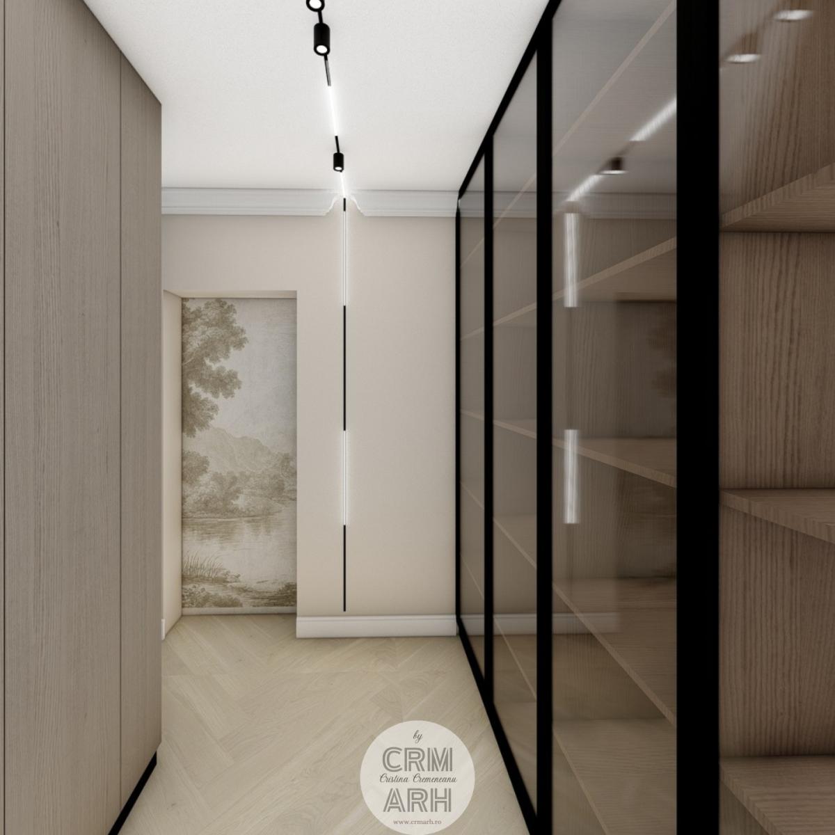 În această amenajare, nuanțele de bej domină spațiul, creând o bază caldă, luminoasă și echilibrată. Texturile moi ale pereților și finisajele fine ale mobilierului sunt puse în valoare de tonurile naturale de lemn, care adaugă profunzime și confort vizual. Pentru a echilibra armonia cromatică, intervin accentele metalice negre ,discrete, dar puternice, în picioarele mobilierului, mânere, rame de oglinzi sau corpurile de iluminat. Aceste detalii aduc o notă modernă și ancorează spațiul în prezent, fără a rupe eleganța clasică. Iluminatul cu globuri suspendate completează compoziția, subliniind atmosfera sofisticată și echilibrul dintre tradiție și modernitate.