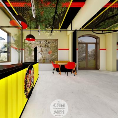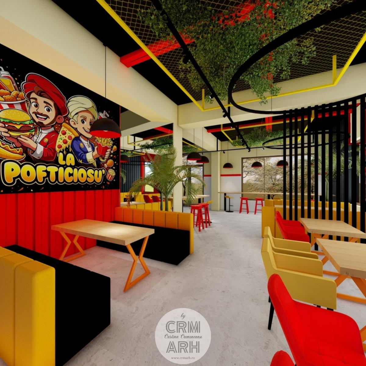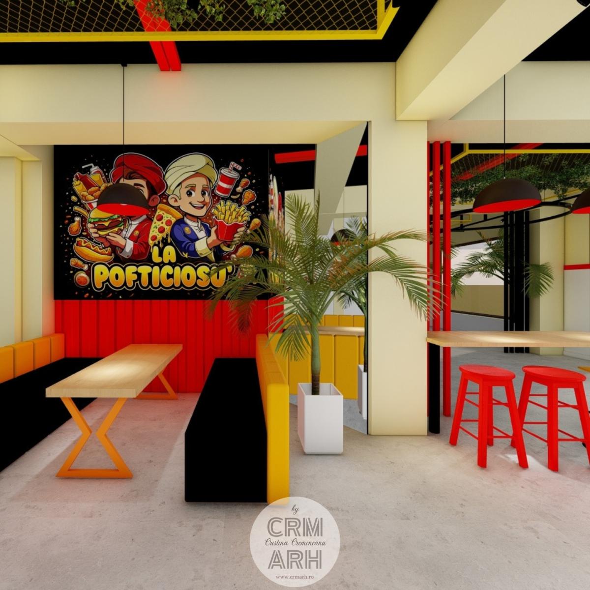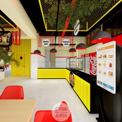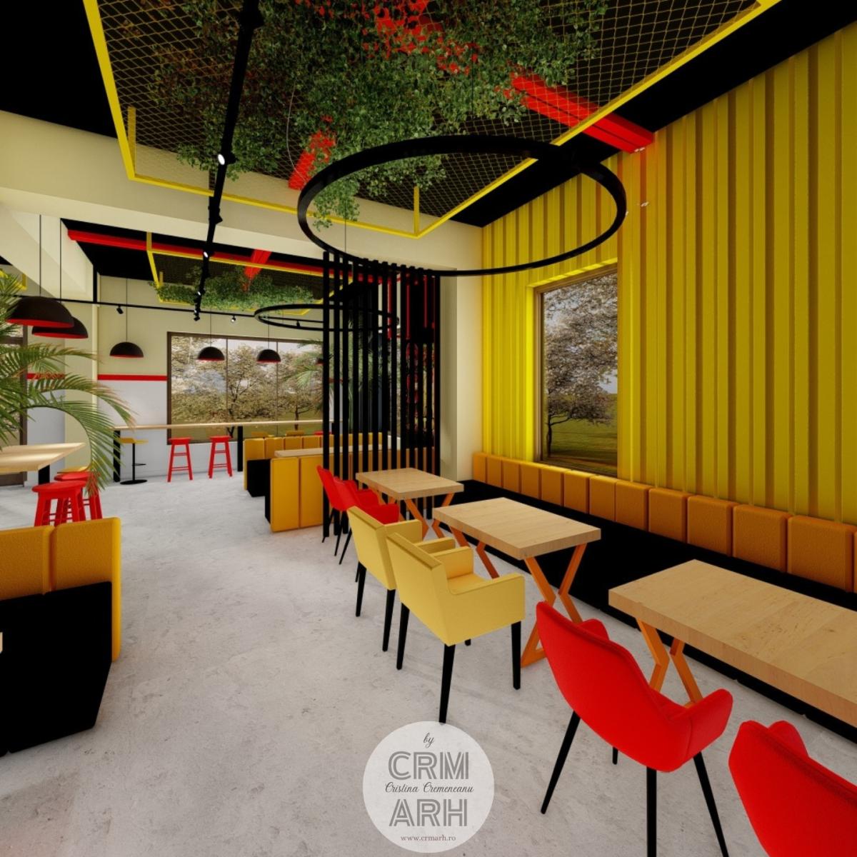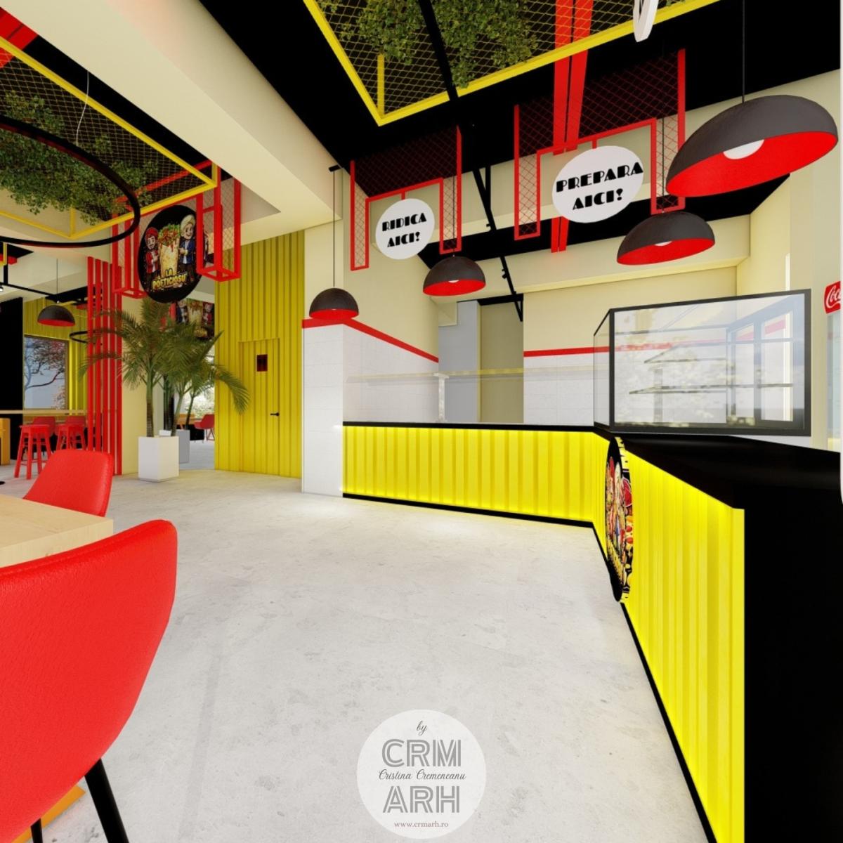 Designul se bazează pe o atmosferă urbană, energică și prietenoasă, cu o paletă de culori vii – galben, roșu, și verde – combinate cu gri și negru industrial. Pereții placați cu tablă colorată în modele „patchwork”, iar riflajele metalice sunt folosite pentru separarea vizuală a zonelor. Zona de servire se evidențiază prin panouri metalice cu perforații și neonuri cu logo-ul sau mesaje amuzante, creând un punct focal atractiv. Podeaua din beton șlefuit menține look-ul industrial. Iluminatul include pendule metalice, spoturi LED direcționate și accente neon colorate, evidențiind zonele importante și creând un efect dinamic. Decorul este completat de elemente grafice tematice fast-food, verdeață suspendată și detalii colorate care aduc energie și personalitate spațiului, integrând funcționalitatea cu estetica urban-industrială.